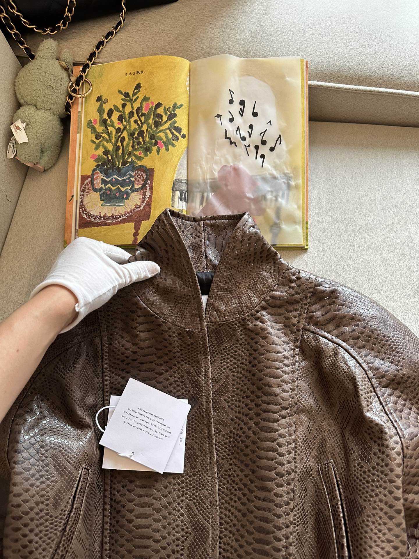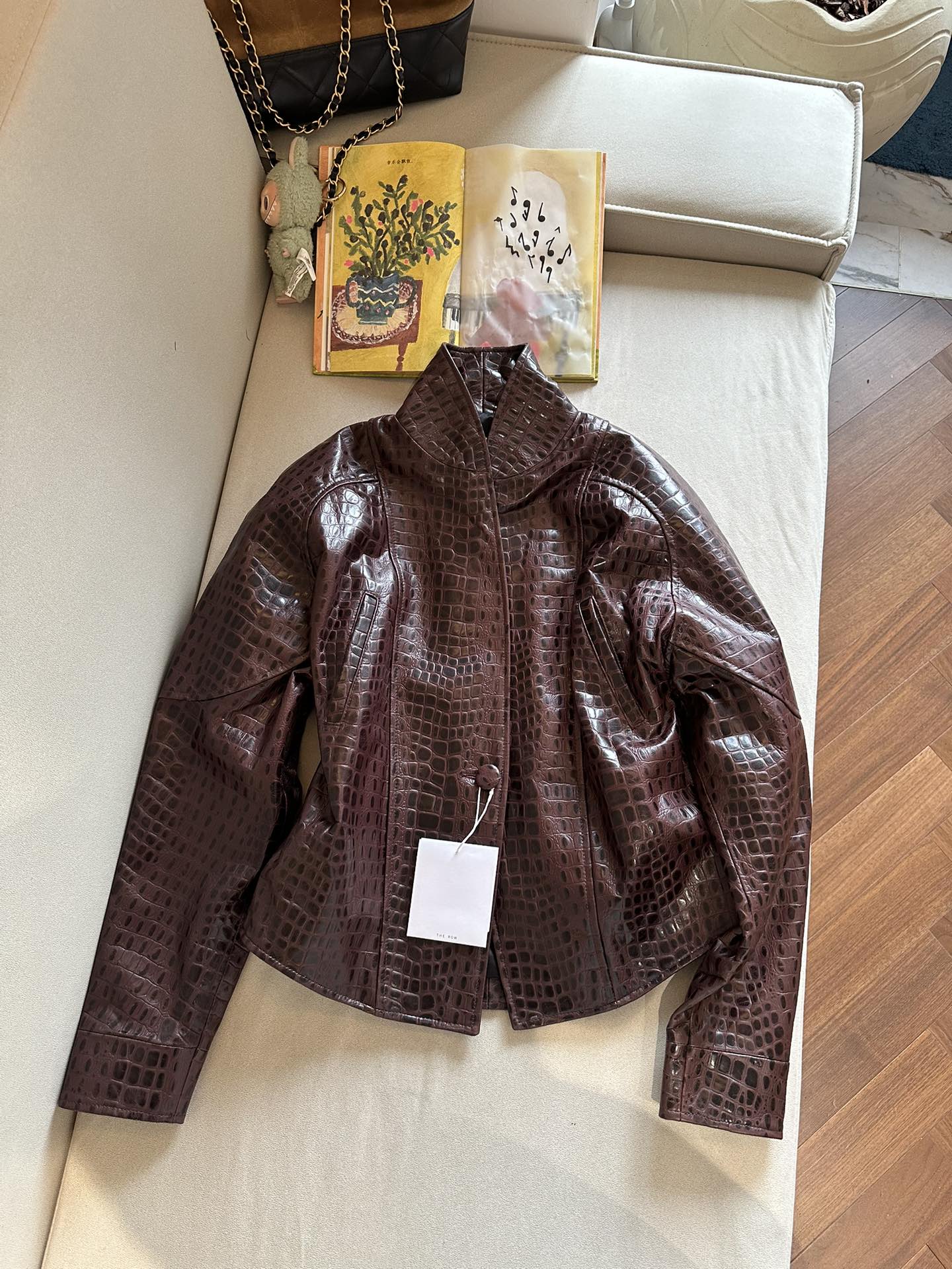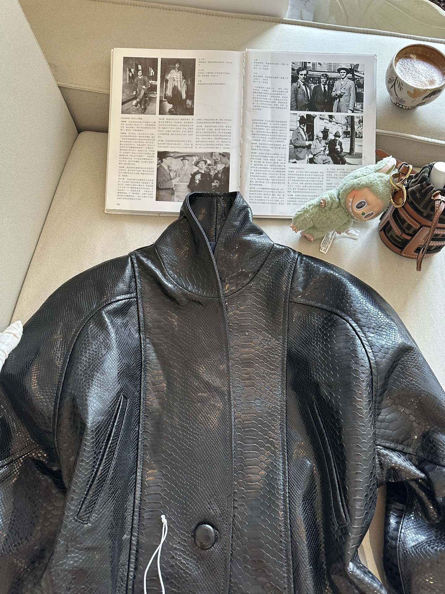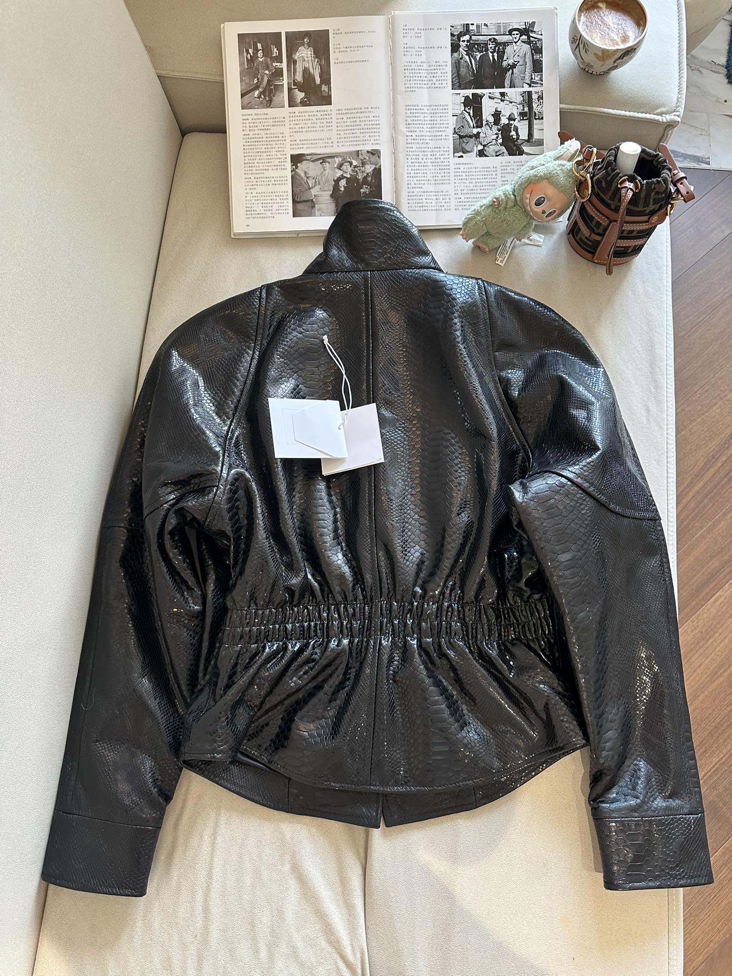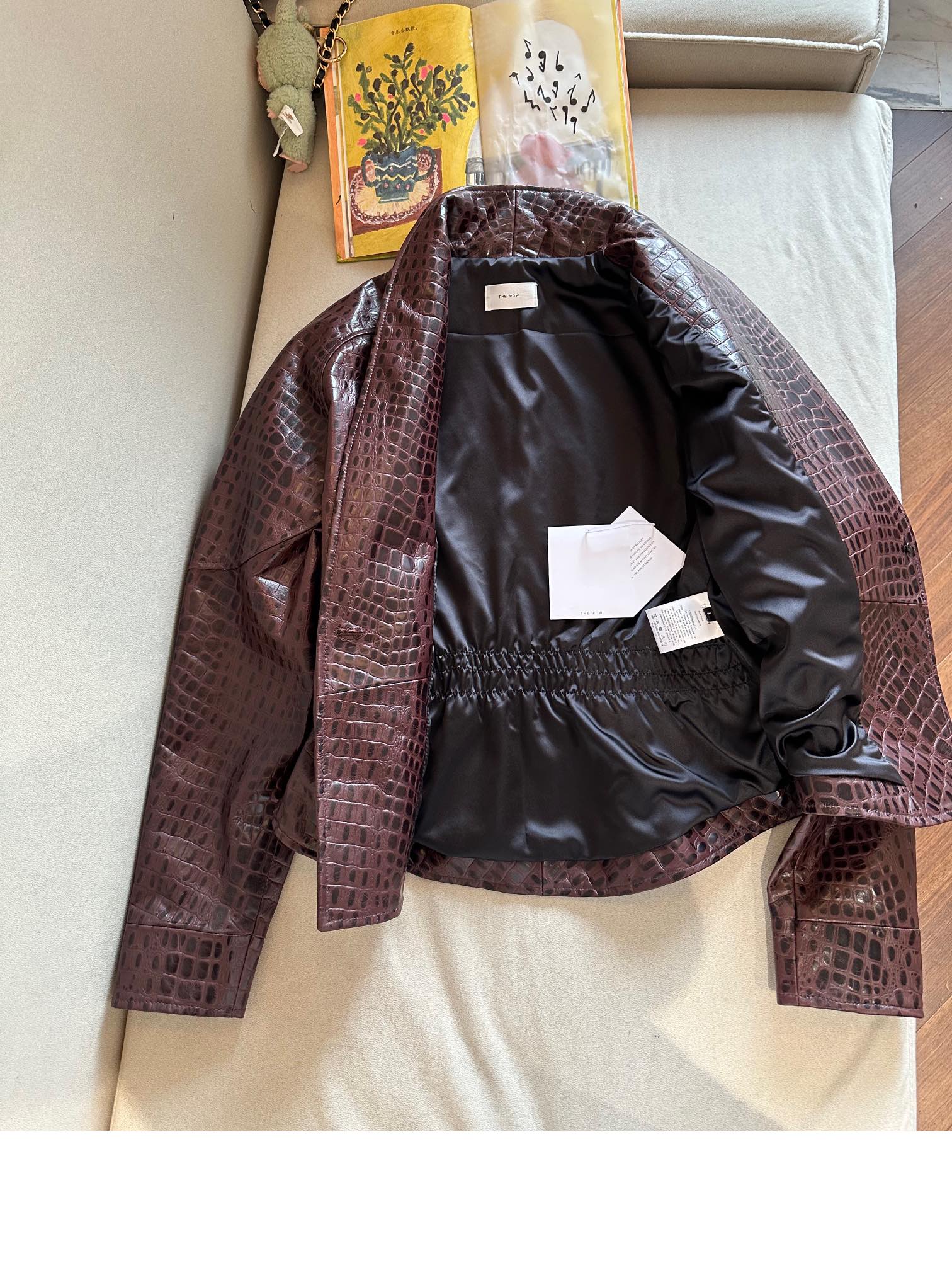 Элегантная женская кожаная куртка от бренда The Row — воплощение утончённого стиля и современного дизайна. Изготовленная из высококачественной овчины, она отличается уникальной текстурой с имитацией кожи питона, что придаёт изделию роскошный и экзотический вид.