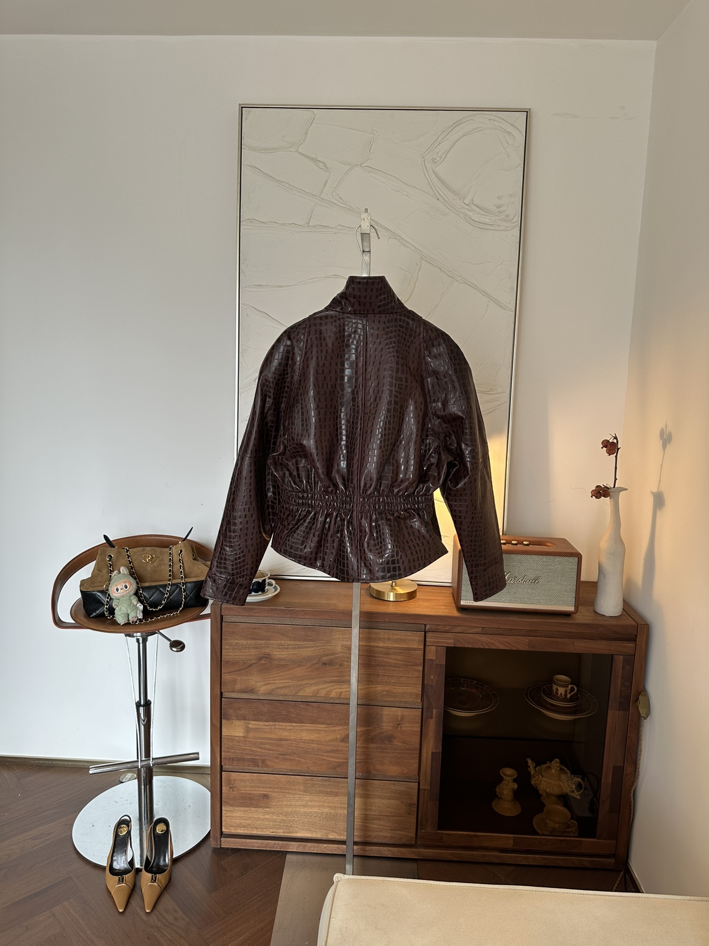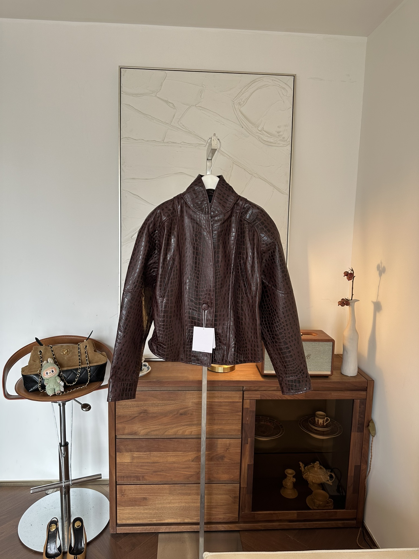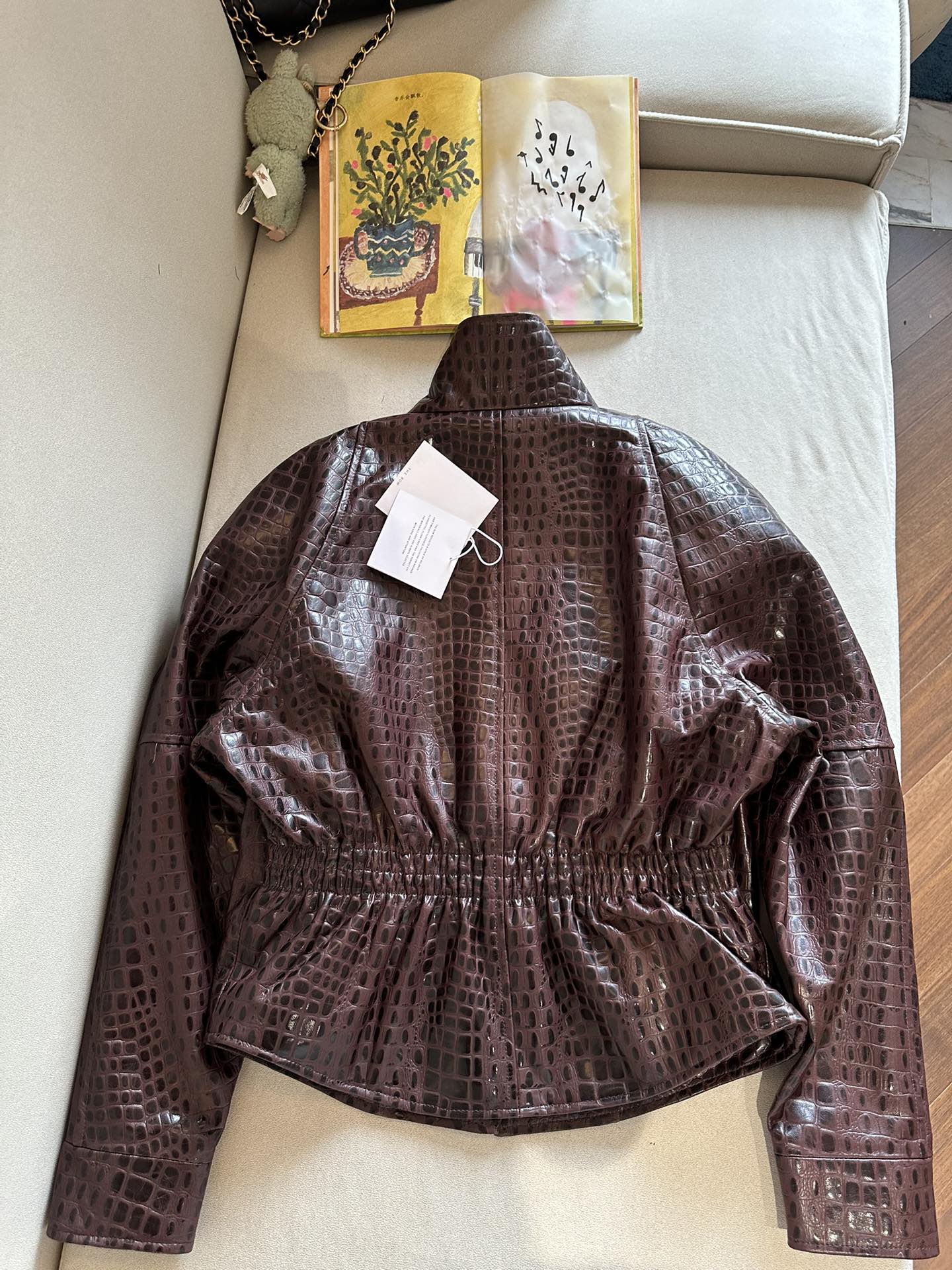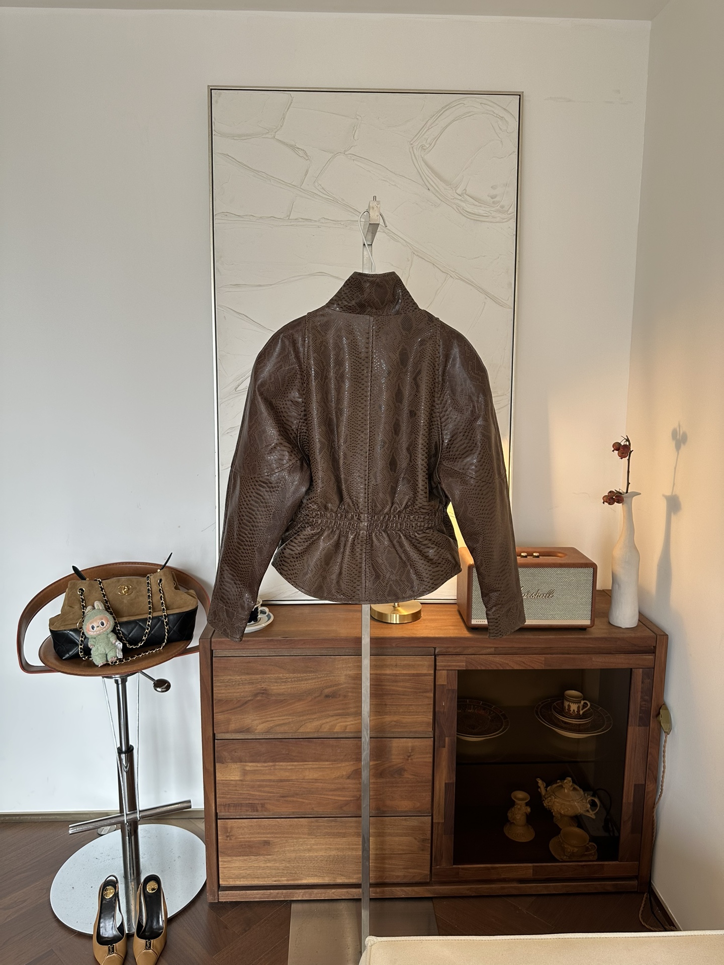 Элегантная женская кожаная куртка от бренда The Row — воплощение утончённого стиля и современного дизайна. Изготовленная из высококачественной овчины, она отличается уникальной текстурой с имитацией кожи питона, что придаёт изделию роскошный и экзотический вид.