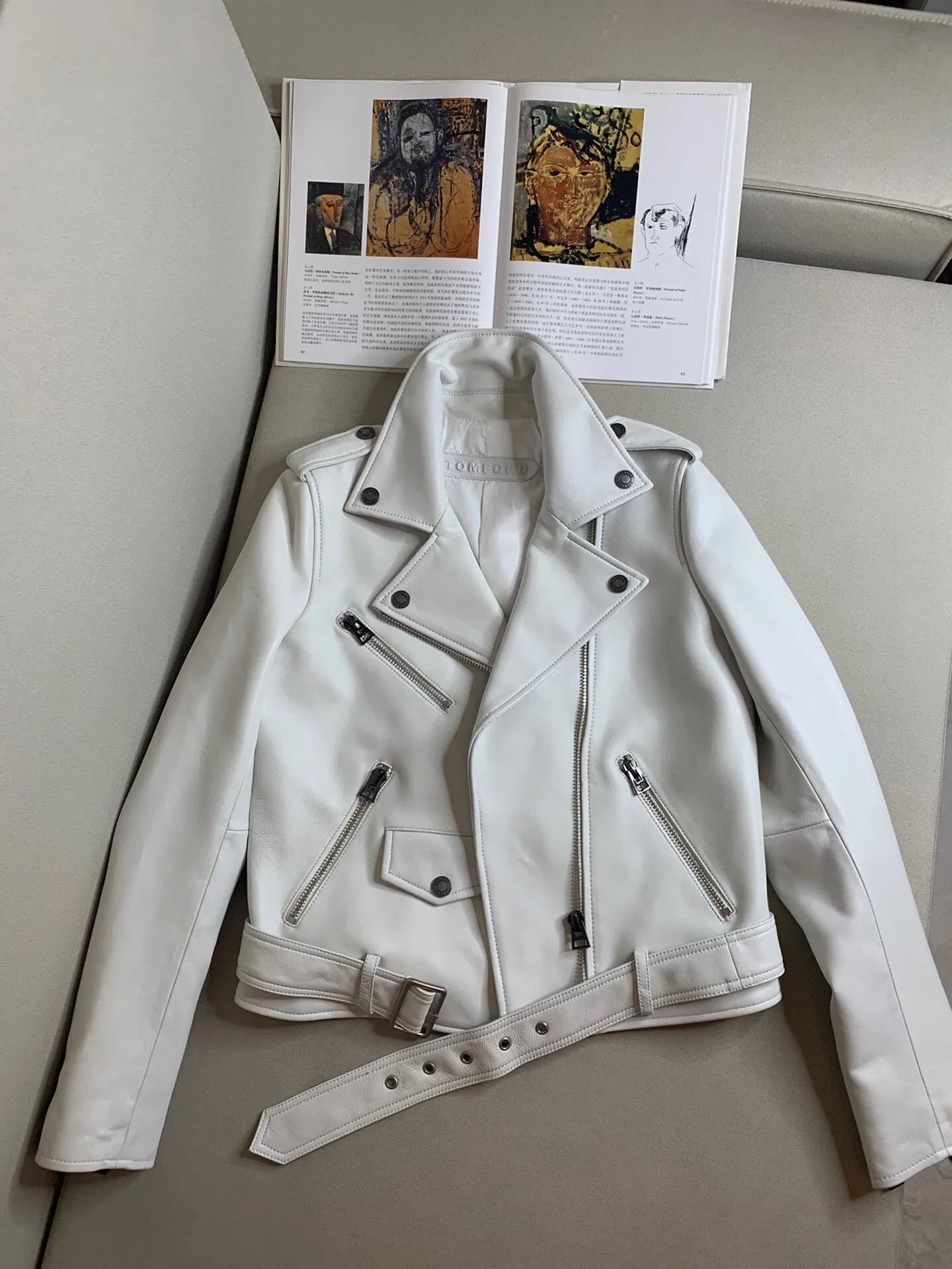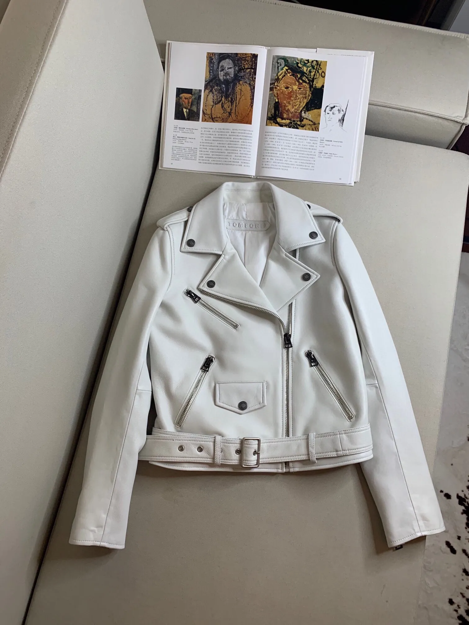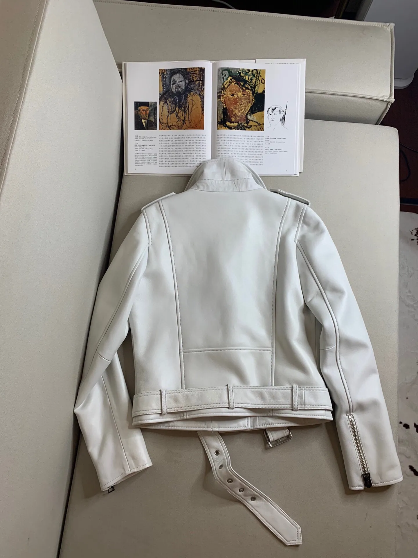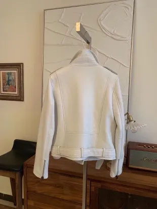 Куртка выполнена в классическом белом цвете, который придаёт образу свежесть и утонченность. Дизайн включает в себя стильные металлические элементы, такие как молнии и кнопки, которые добавляют изделию характер и изысканность. Регулируемый пояс позволяет подчеркнуть талию, создавая женственный силуэт.