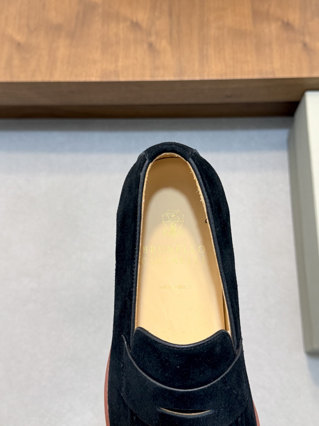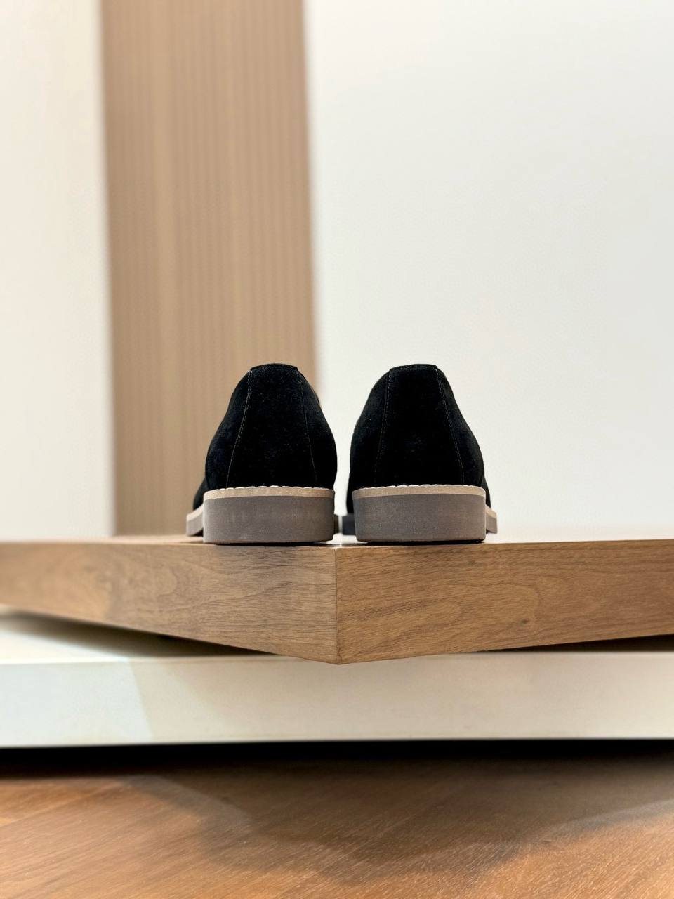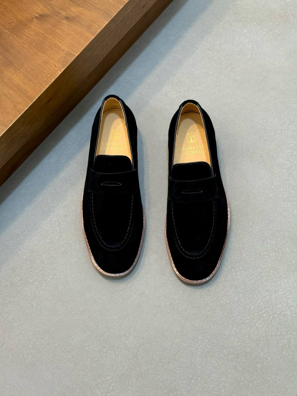 Мужские туфли Brunello Cucinelli выполнены из высококачественной чёрной замши, которая придаёт модели элегантный и благородный вид. Классический лофер с аккуратной прострочкой и минималистичным декоративным ремешком на подъёме обеспечивает универсальность и комфорт в носке. Подошва светлого оттенка гармонично контрастирует с верхом, добавляя современный штрих в традиционный дизайн. Эти туфли идеально подойдут для стильных повседневных и деловых образов, подчёркивая утончённый вкус и высокий статус владельца.