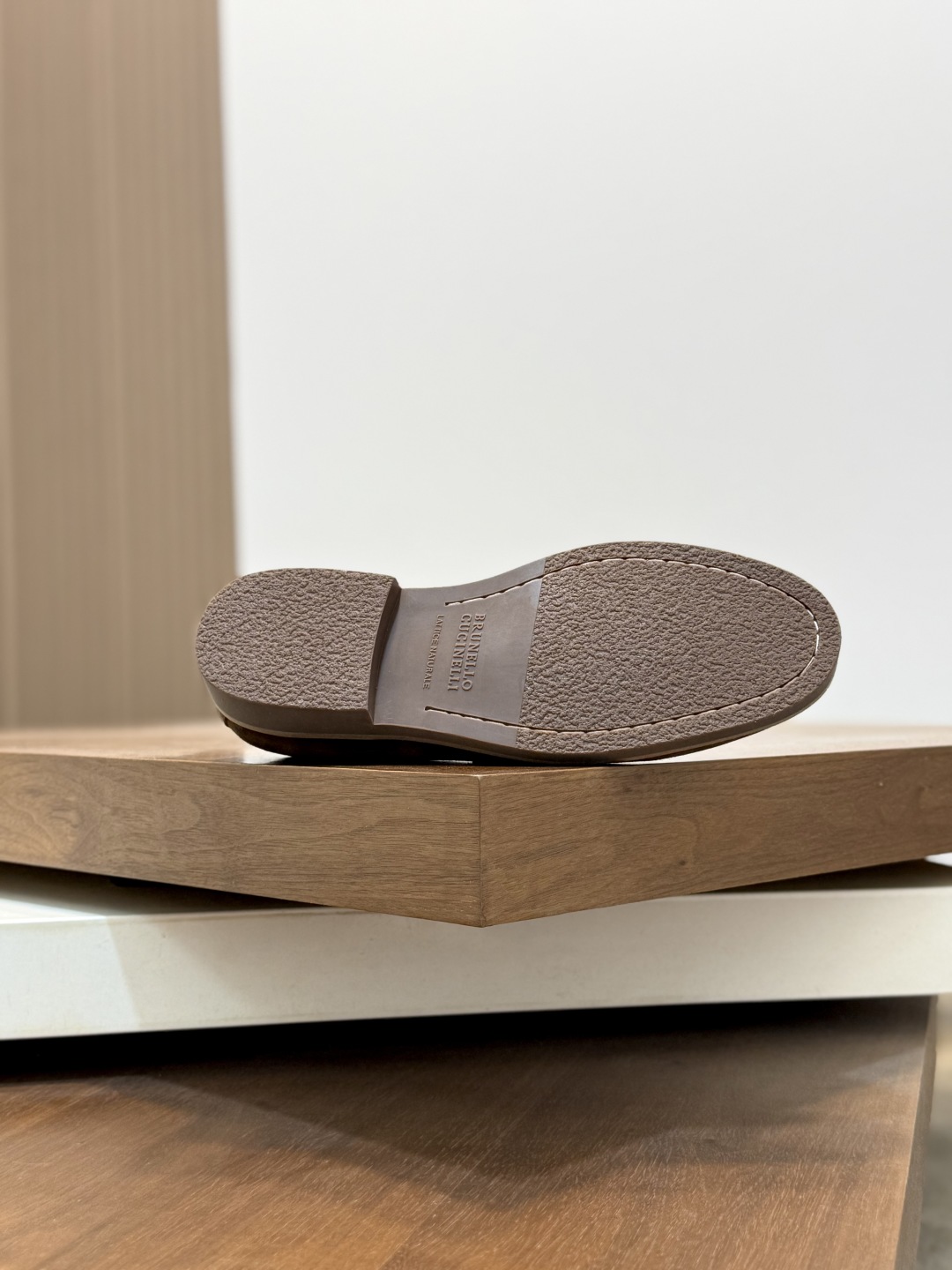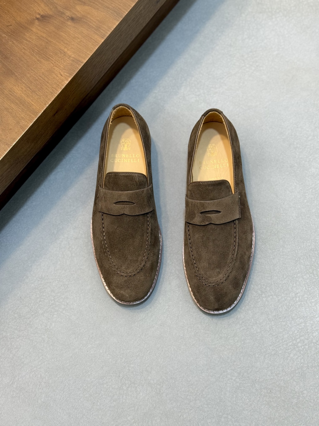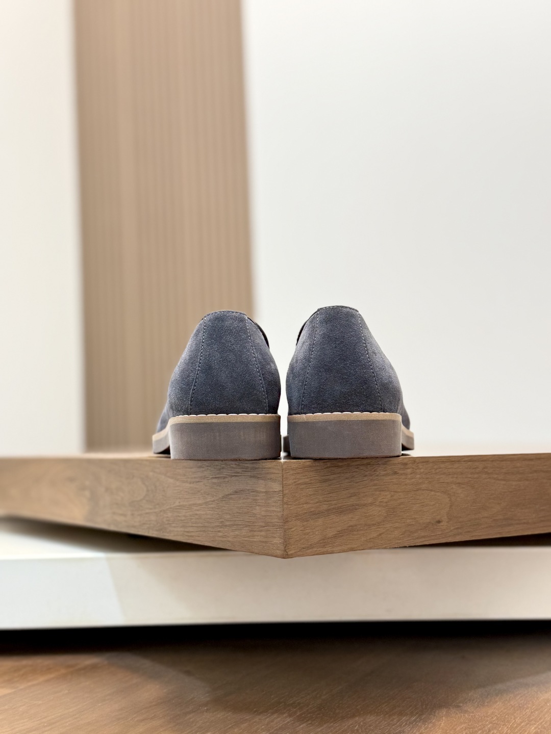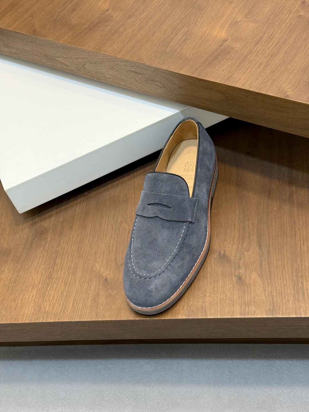 Мужские туфли Brunello Cucinelli выполнены из высококачественной чёрной замши, которая придаёт модели элегантный и благородный вид. Классический лофер с аккуратной прострочкой и минималистичным декоративным ремешком на подъёме обеспечивает универсальность и комфорт в носке. Подошва светлого оттенка гармонично контрастирует с верхом, добавляя современный штрих в традиционный дизайн. Эти туфли идеально подойдут для стильных повседневных и деловых образов, подчёркивая утончённый вкус и высокий статус владельца.