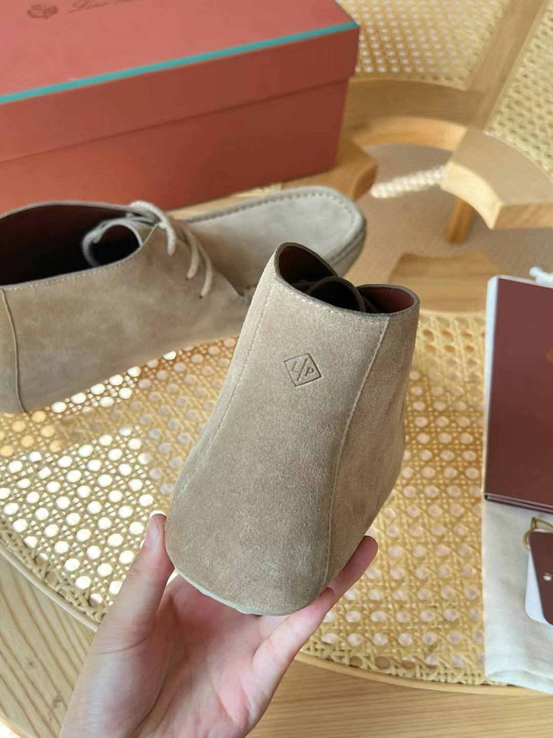 • Логотип и упаковка: комплект поставки включает фирменную упаковку Loro Piana — коробку, мягкий мешочек‑пыльник и карточки производителя, что делает модель подходящей и для подарка.