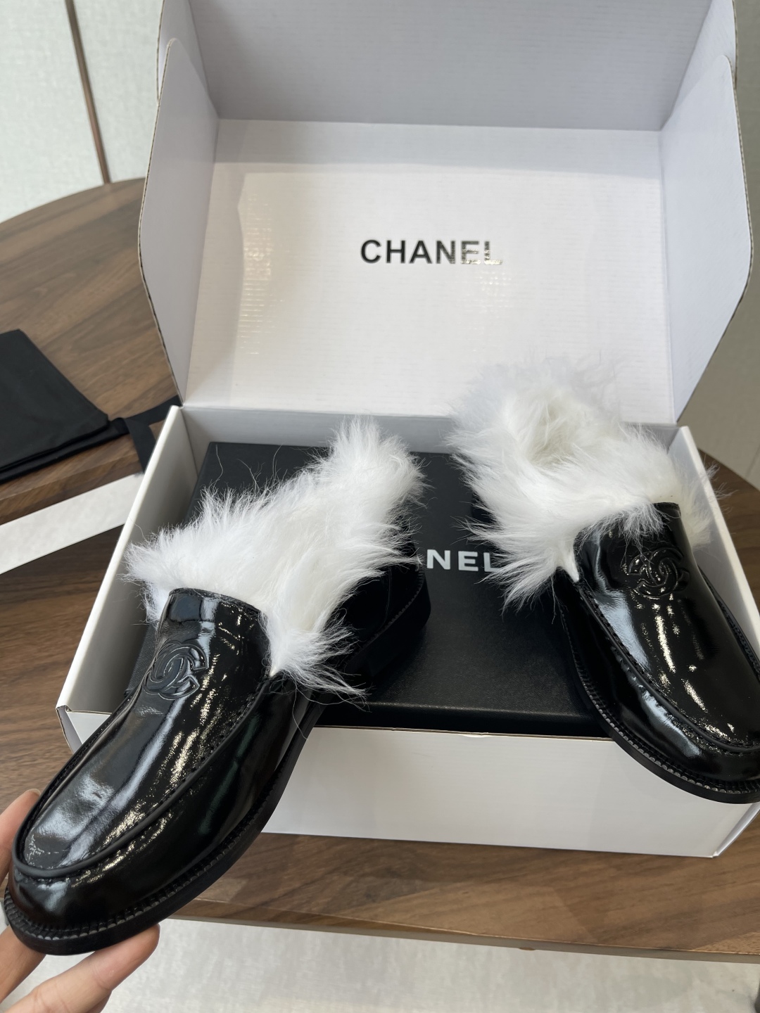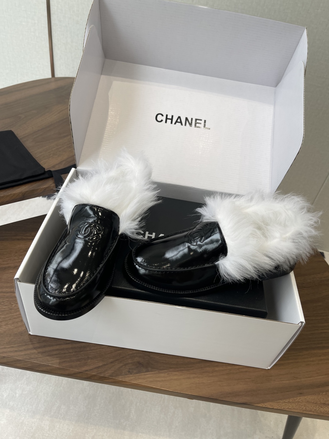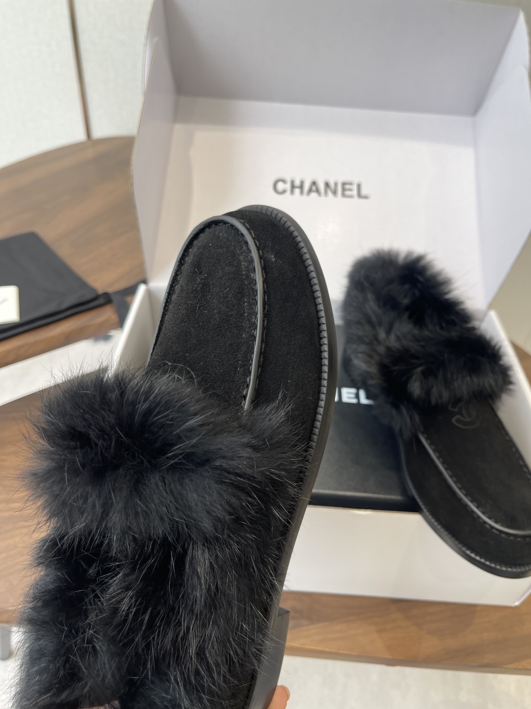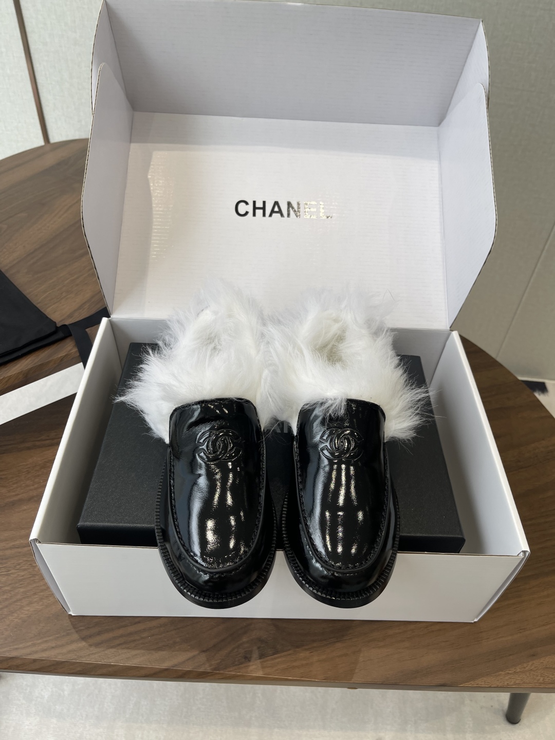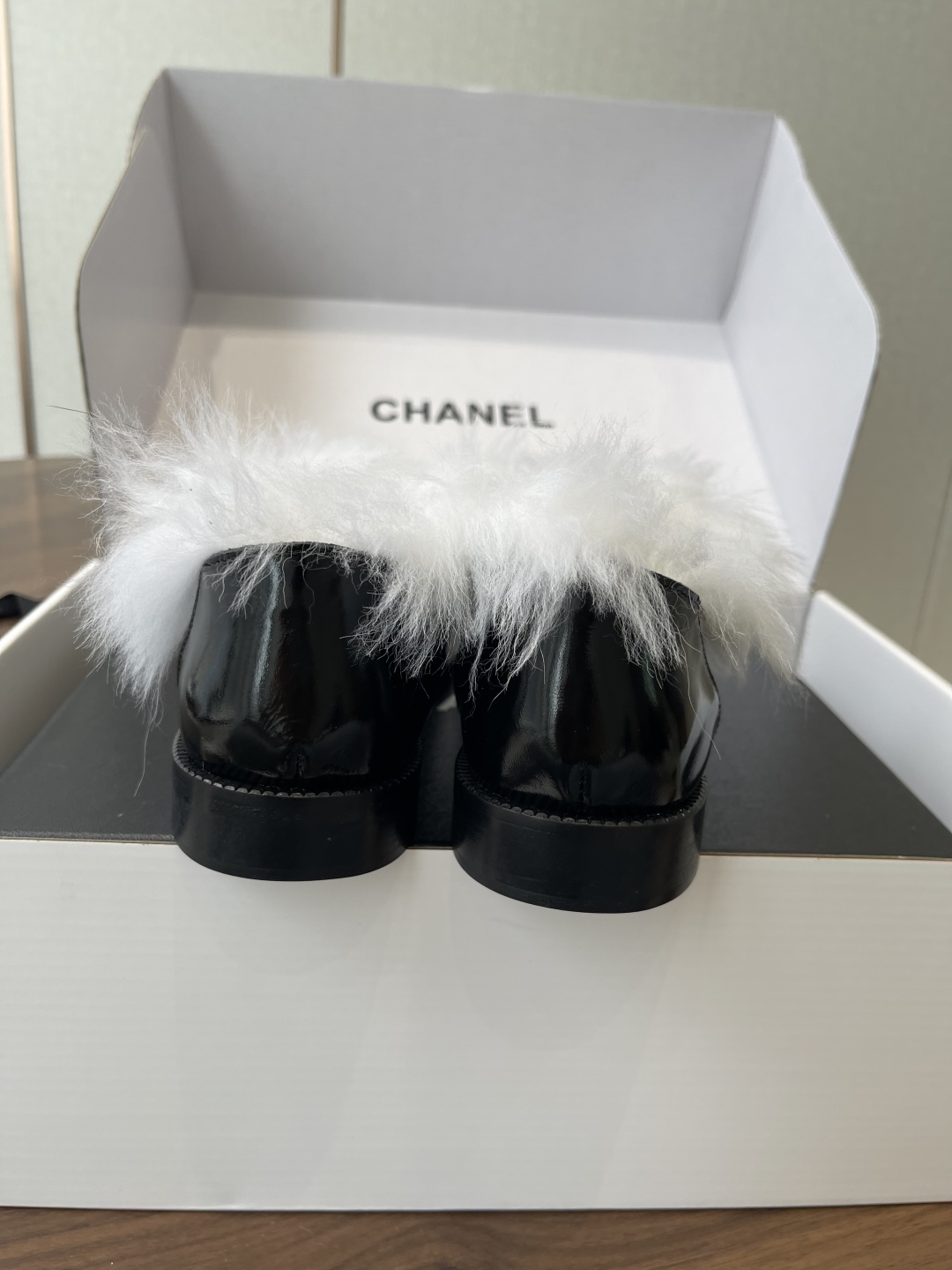 Верх украшен тисненым логотипом двойной С в центральной части передка, а линия входа дополнена пушистой меховой отделкой, придающей изделию мягкую фактуру и уютный характер. Внутренняя отделка и стелька выполнены из мягких материалов с амортизирующей прослойкой для комфортной ходьбы в течение всего дня. Подошва обеспечивает стабильную опору и легкое сцепление с поверхностями; кромка прошита для прочности и аккуратного внешнего вида.