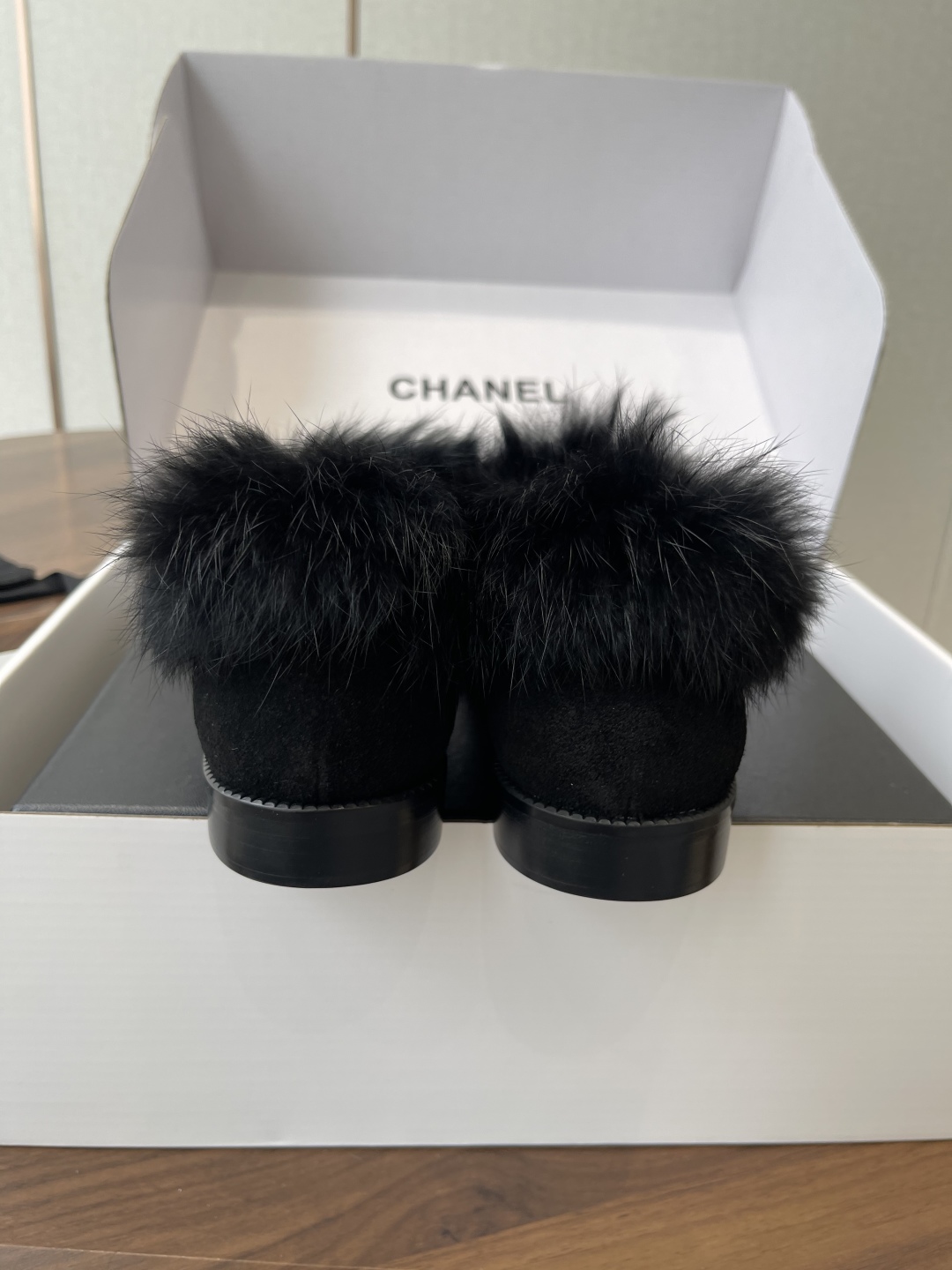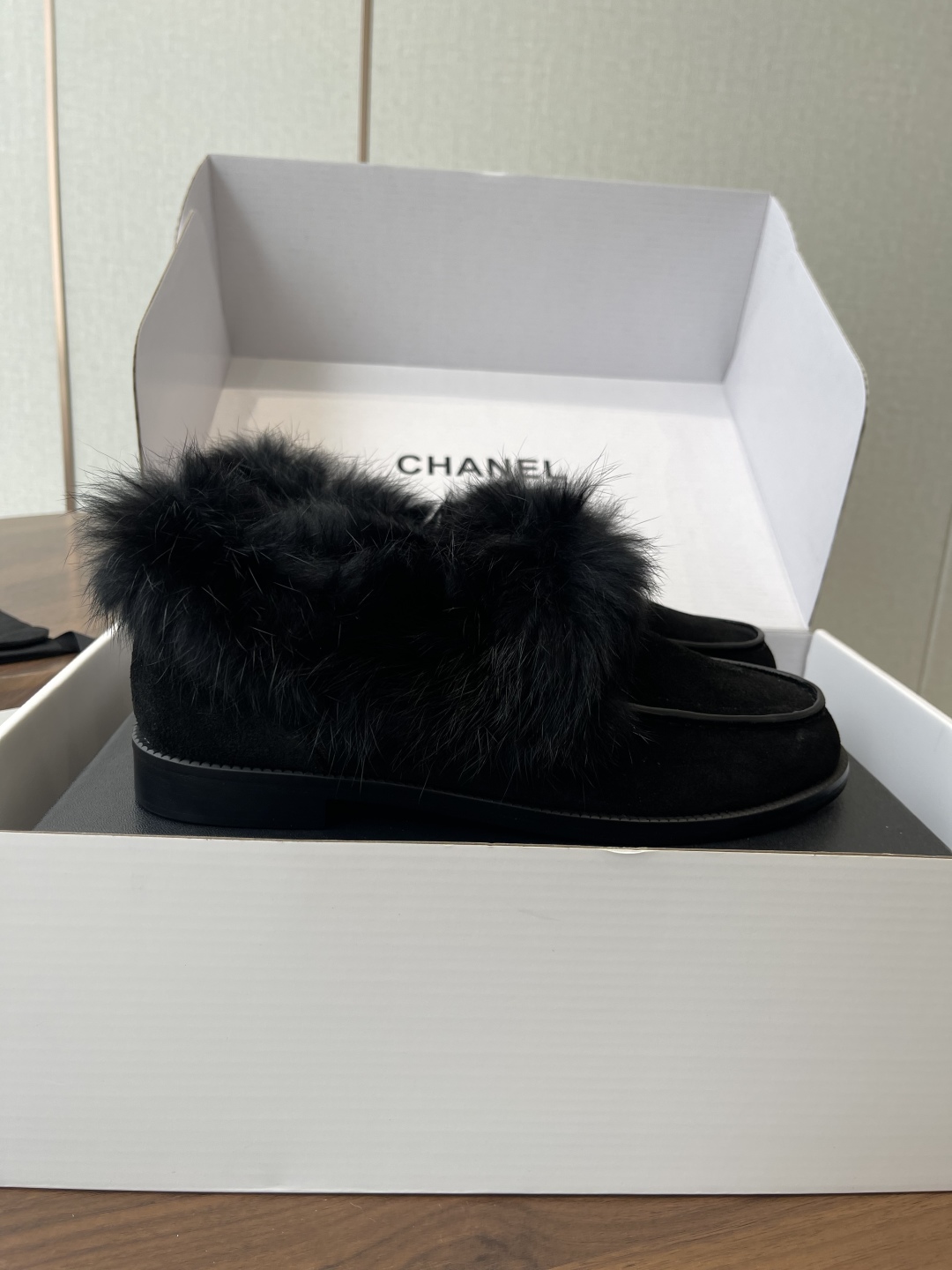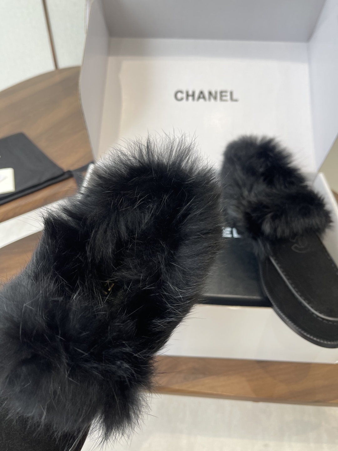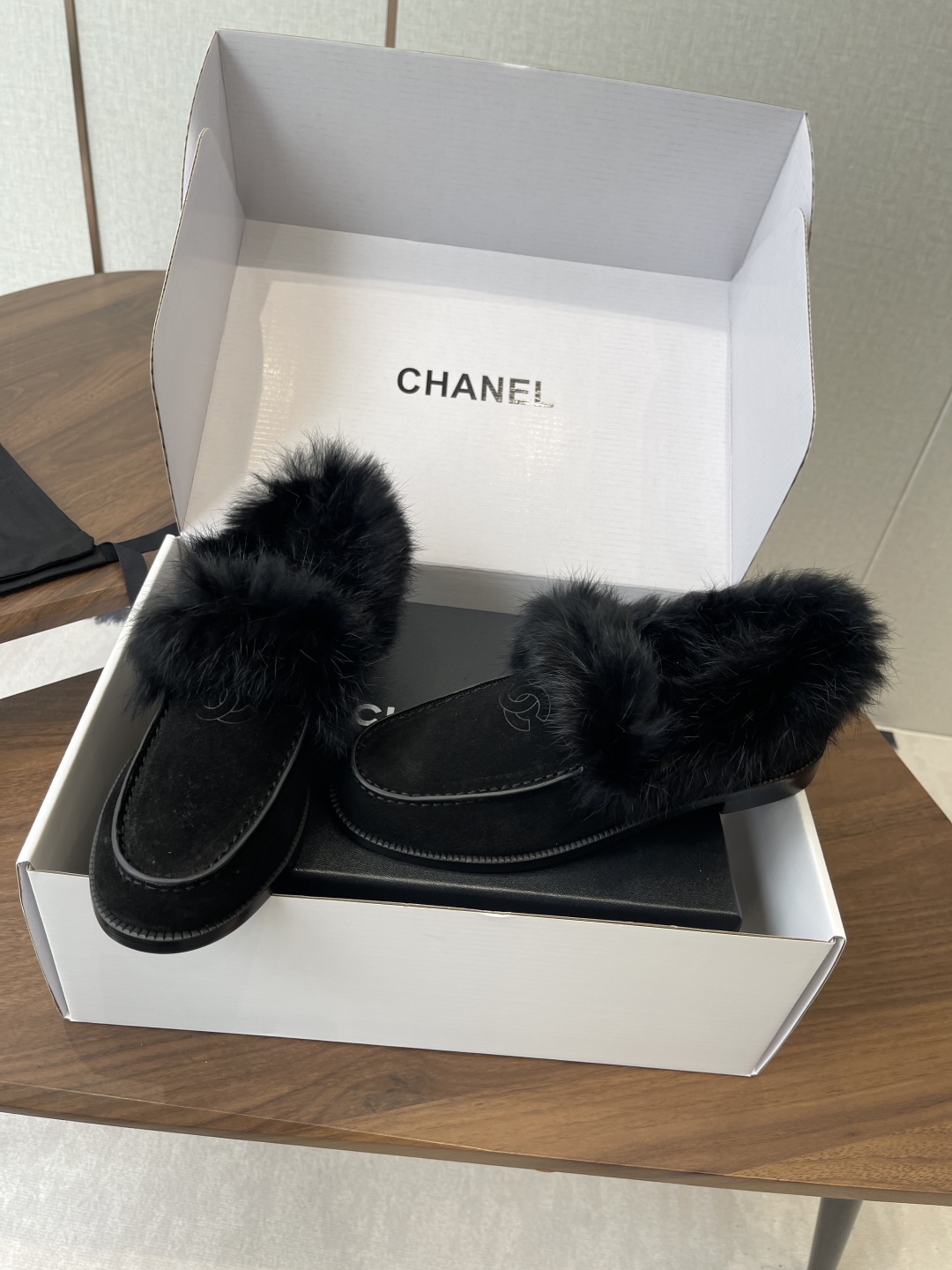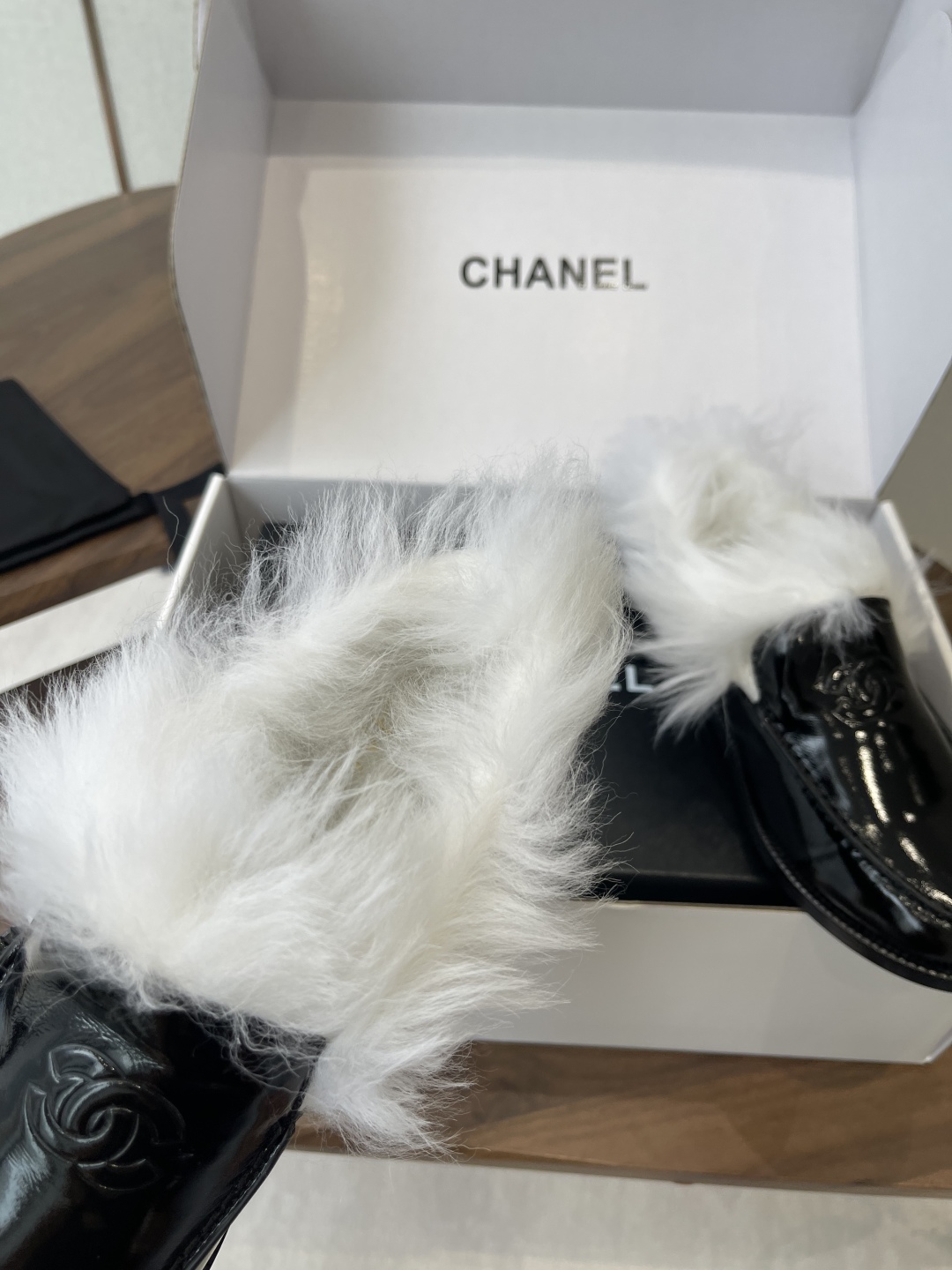 Верх украшен тисненым логотипом двойной С в центральной части передка, а линия входа дополнена пушистой меховой отделкой, придающей изделию мягкую фактуру и уютный характер. Внутренняя отделка и стелька выполнены из мягких материалов с амортизирующей прослойкой для комфортной ходьбы в течение всего дня. Подошва обеспечивает стабильную опору и легкое сцепление с поверхностями; кромка прошита для прочности и аккуратного внешнего вида.