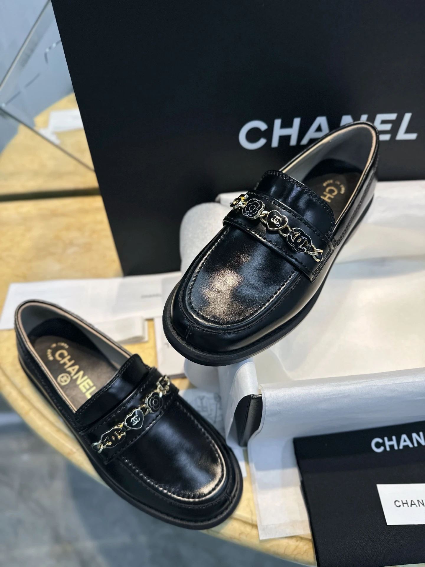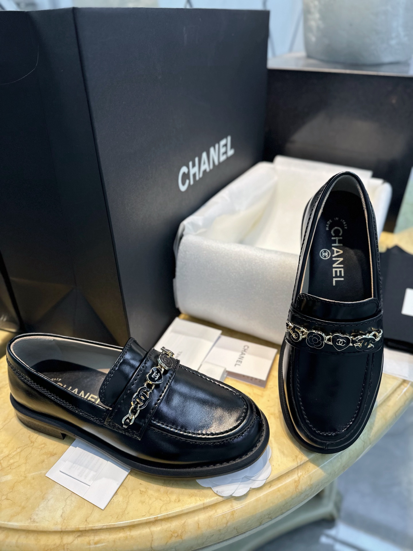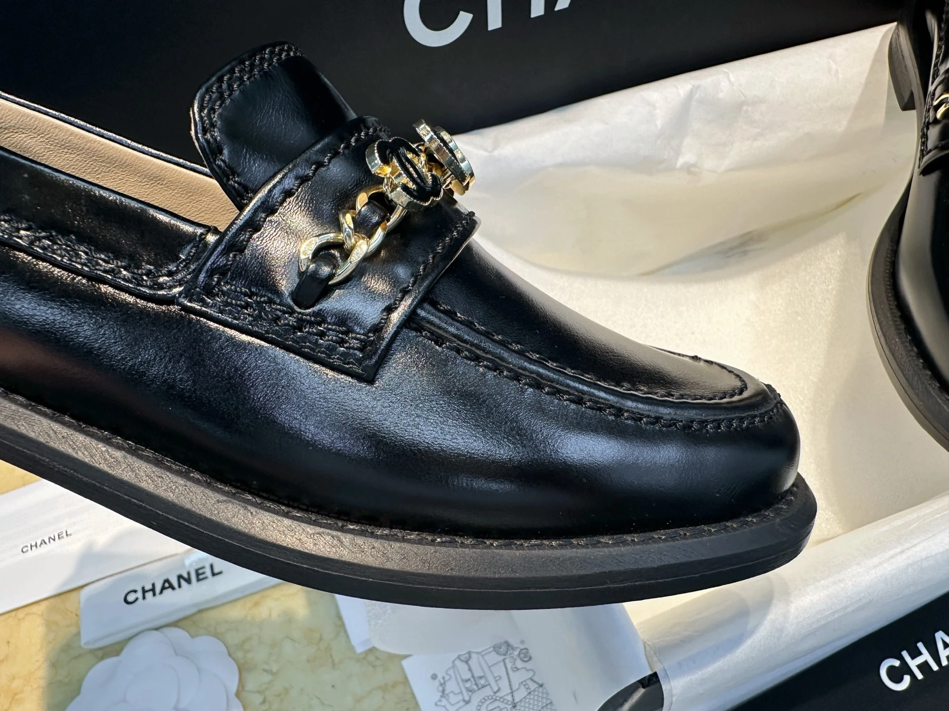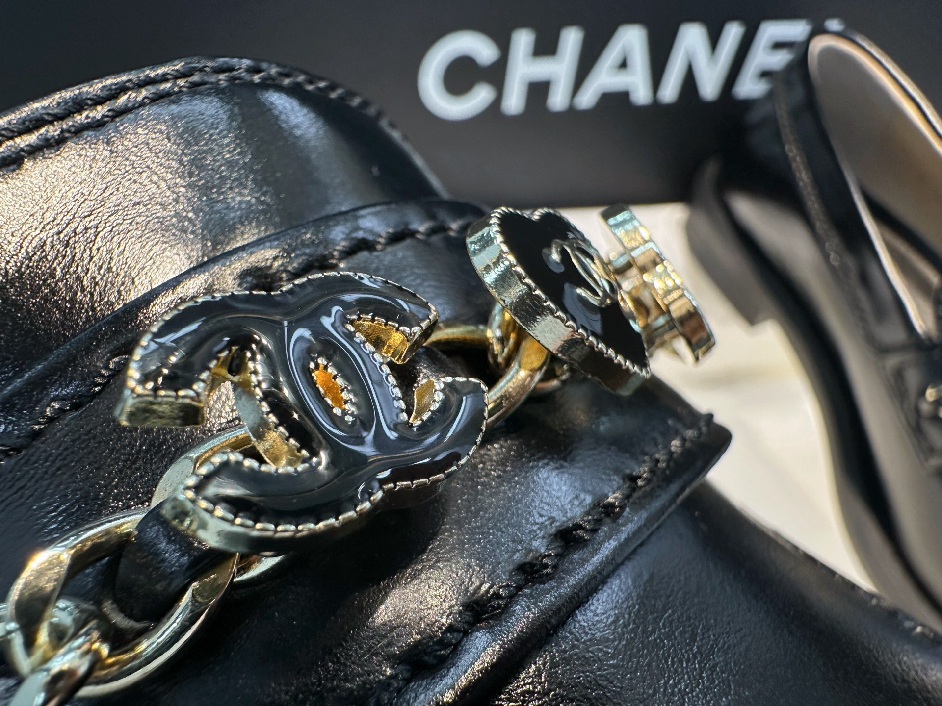 Премиальные женские лоферы Chanel — воплощение элегантности и утончённого стиля. Модель выполнена из натуральной кожи, которая обеспечивает мягкость, комфорт и долговечность. Классический чёрный и молочный цвет идеально сочетается с любым гардеробом, а изысканный металлический декор с фирменной символикой Chanel на союзке придаёт обуви особый шарм и статус.