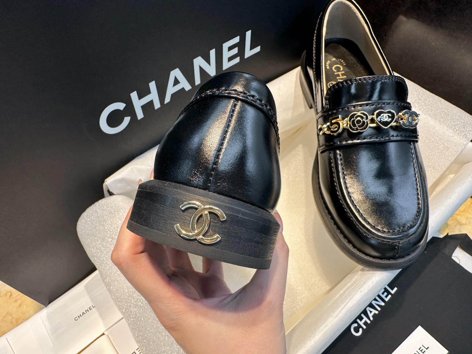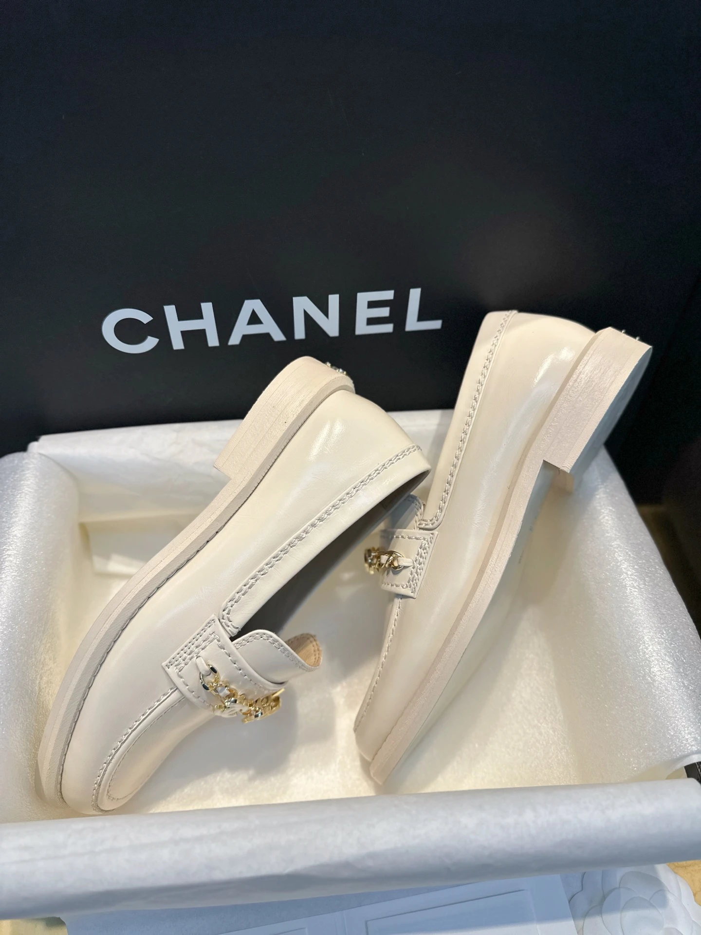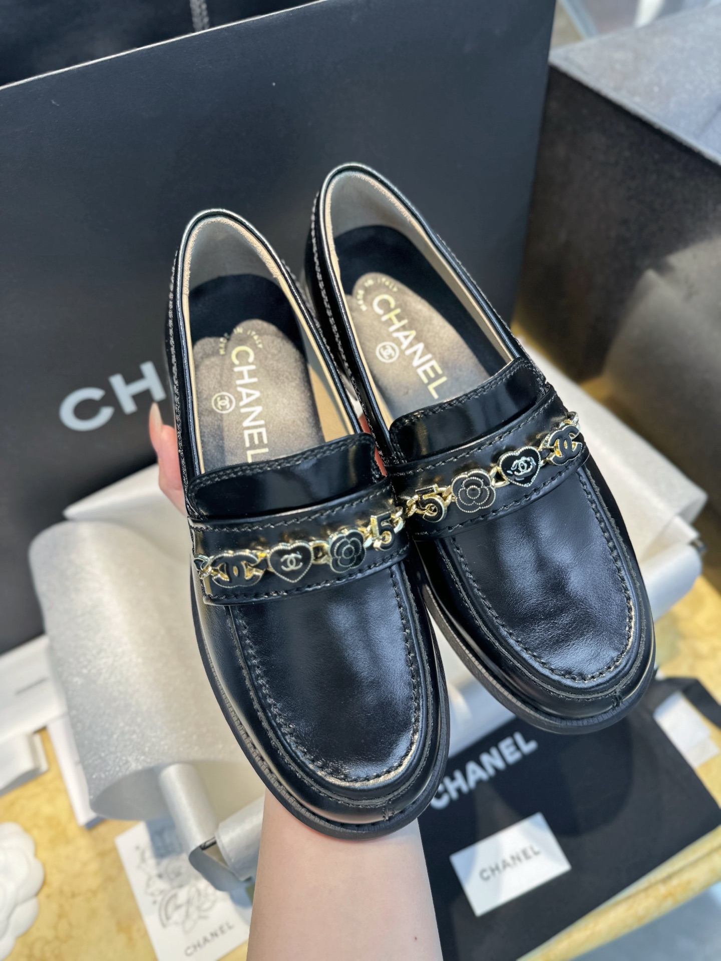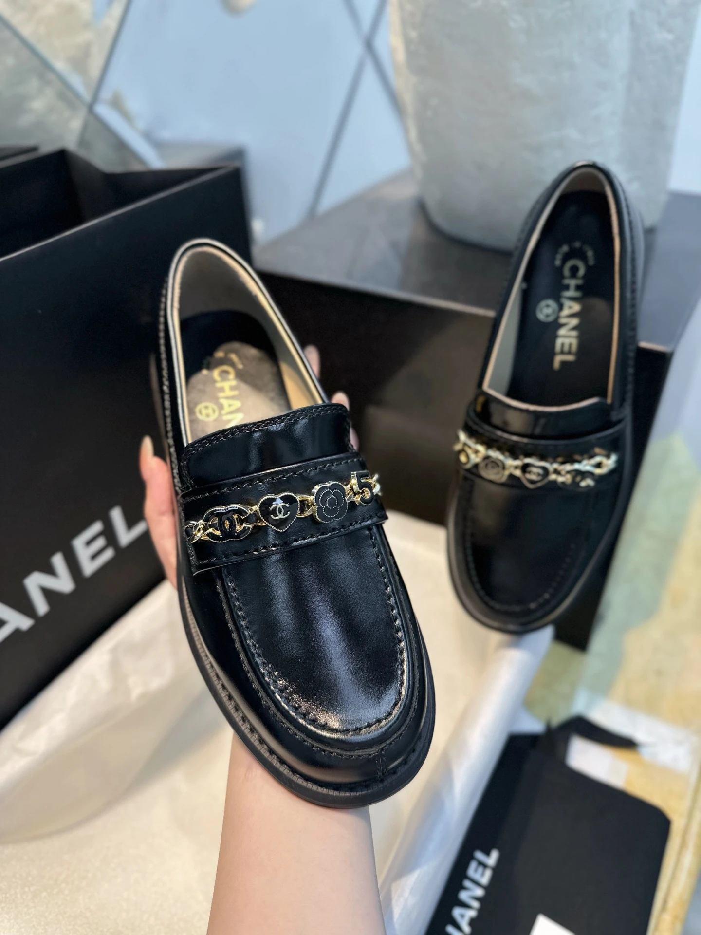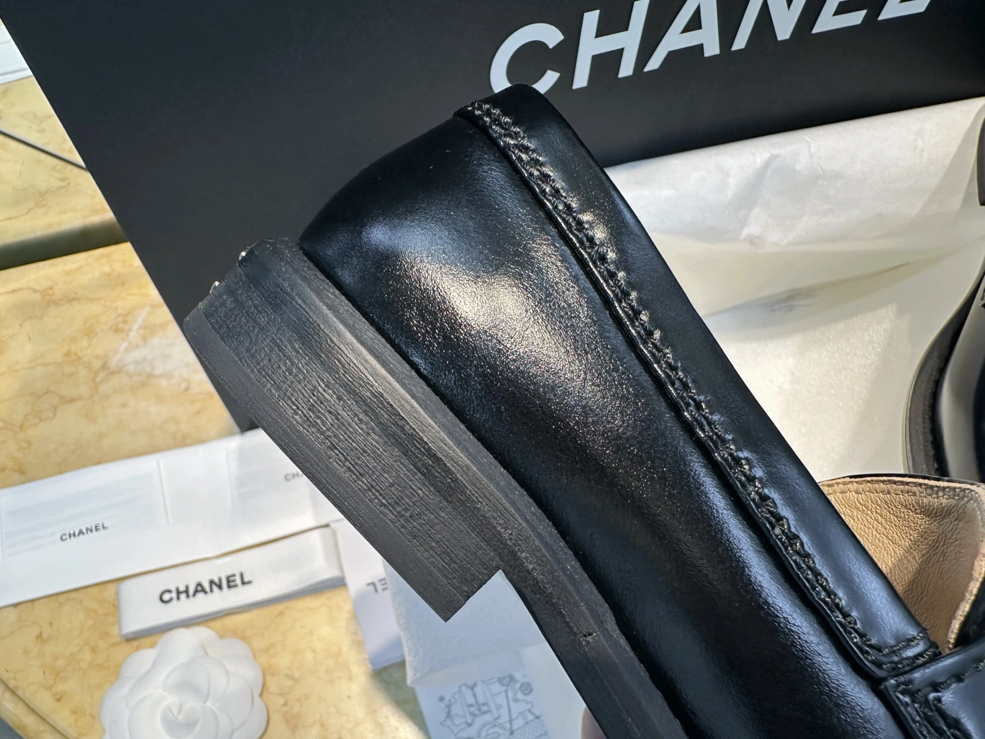 Премиальные женские лоферы Chanel — воплощение элегантности и утончённого стиля. Модель выполнена из натуральной кожи, которая обеспечивает мягкость, комфорт и долговечность. Классический чёрный и молочный цвет идеально сочетается с любым гардеробом, а изысканный металлический декор с фирменной символикой Chanel на союзке придаёт обуви особый шарм и статус.