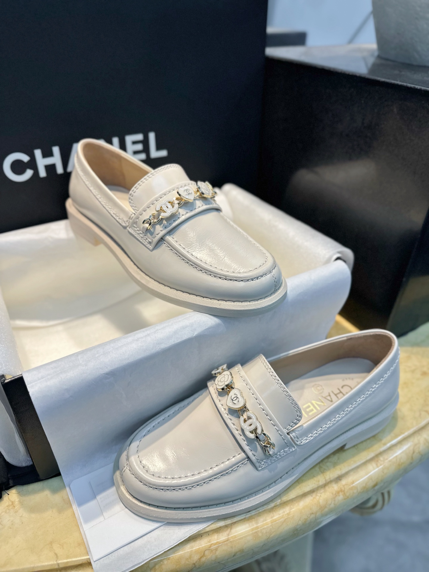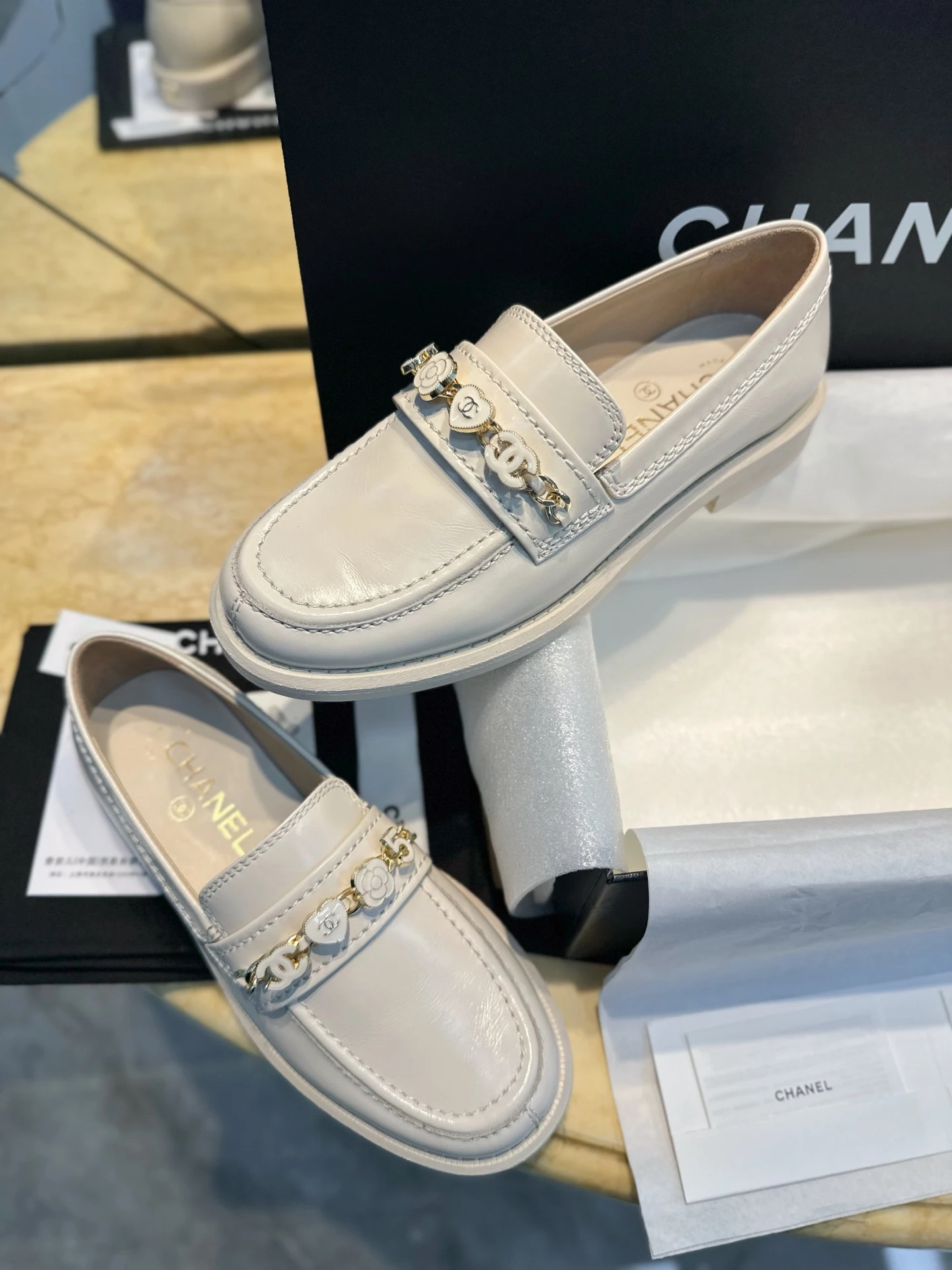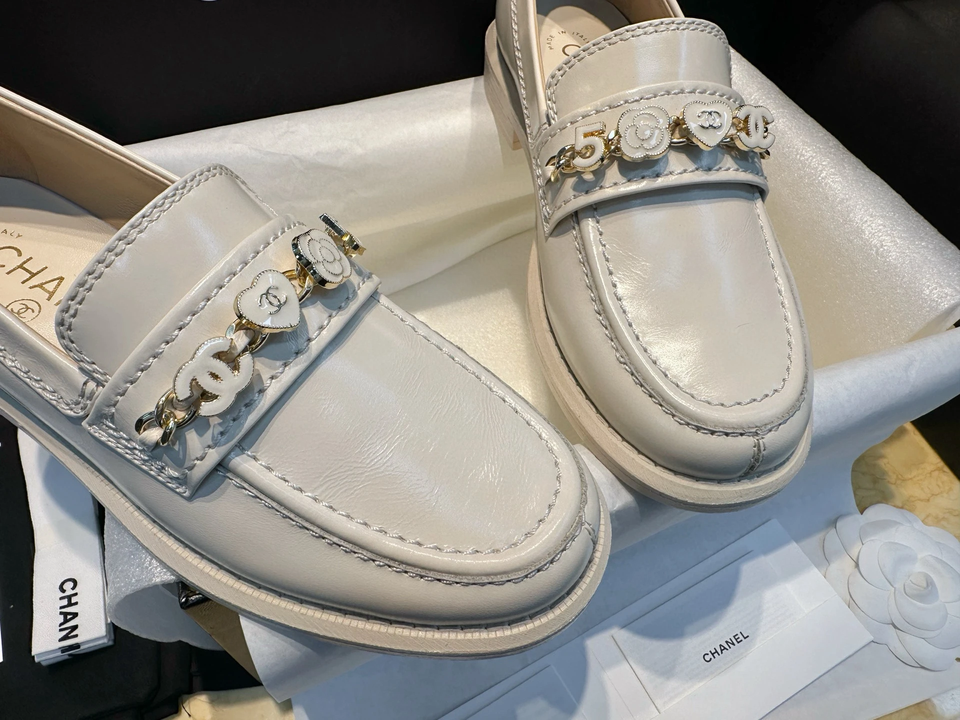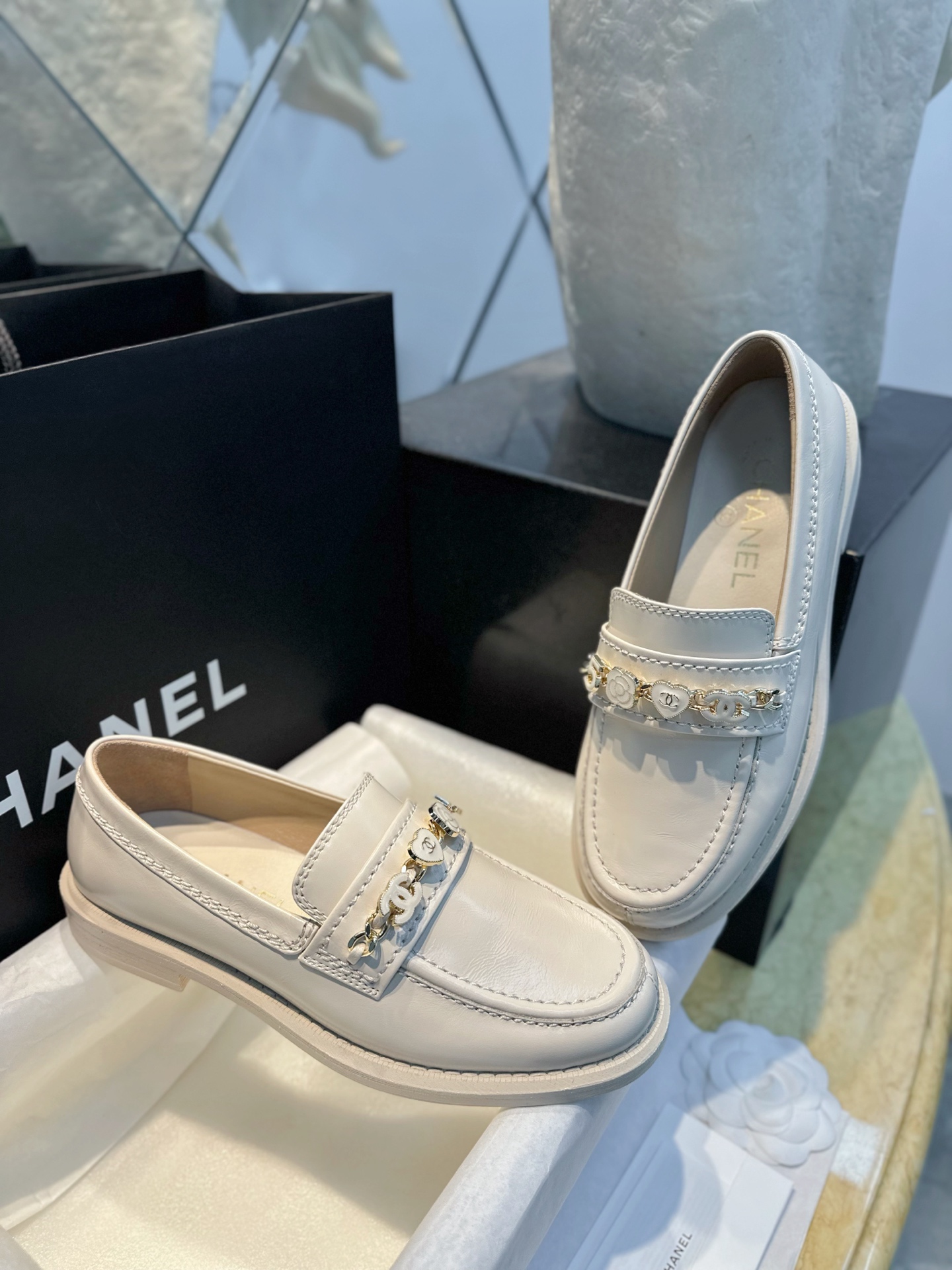 Премиальные женские лоферы Chanel — воплощение элегантности и утончённого стиля. Модель выполнена из натуральной кожи, которая обеспечивает мягкость, комфорт и долговечность. Классический чёрный и молочный цвет идеально сочетается с любым гардеробом, а изысканный металлический декор с фирменной символикой Chanel на союзке придаёт обуви особый шарм и статус.