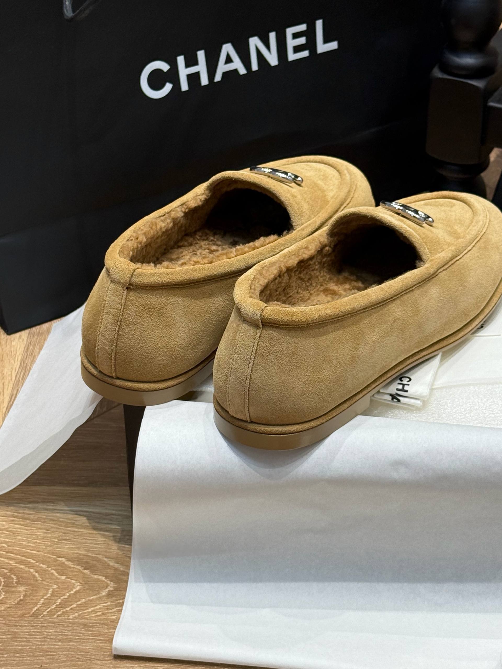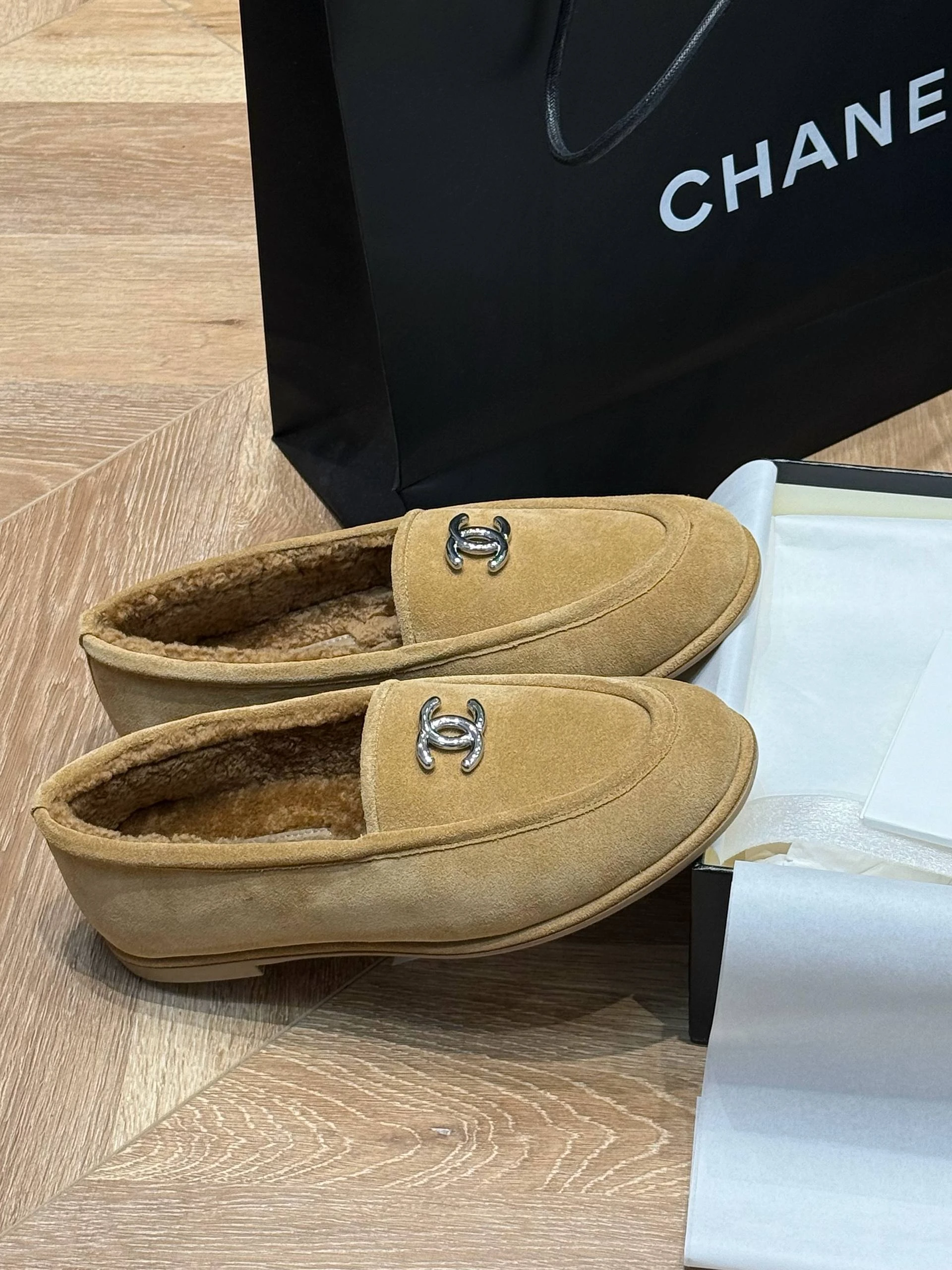 Дизайн и материалы: Модель выполнена из высококачественной натуральной замши, которая отличается мягкостью и приятным на ощупь фактурой. Бежевый оттенок делает лоферы универсальными, позволяя сочетать их с различными нарядами — от делового костюма до повседневных джинсов. Металлическая эмблема с логотипом CHANEL добавляет изысканности и подчеркивает статус бренда.