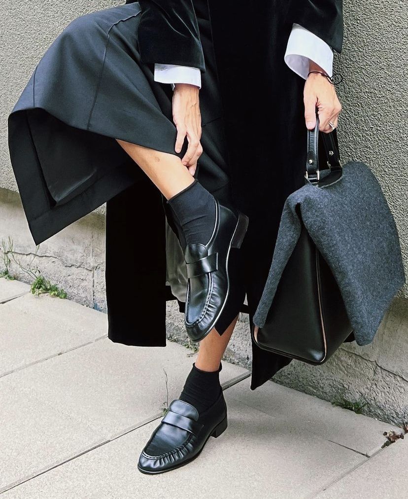 Минималистичные женские лоферы в глубоком чёрном цвете, выполненные из гладкой коровьей кожи с аккуратной ручной прострочкой по мыску. Широкая полоска-перемычка на подъёме и округлый удлинённый носок создают сдержанную, элегантную силуэтную форму.