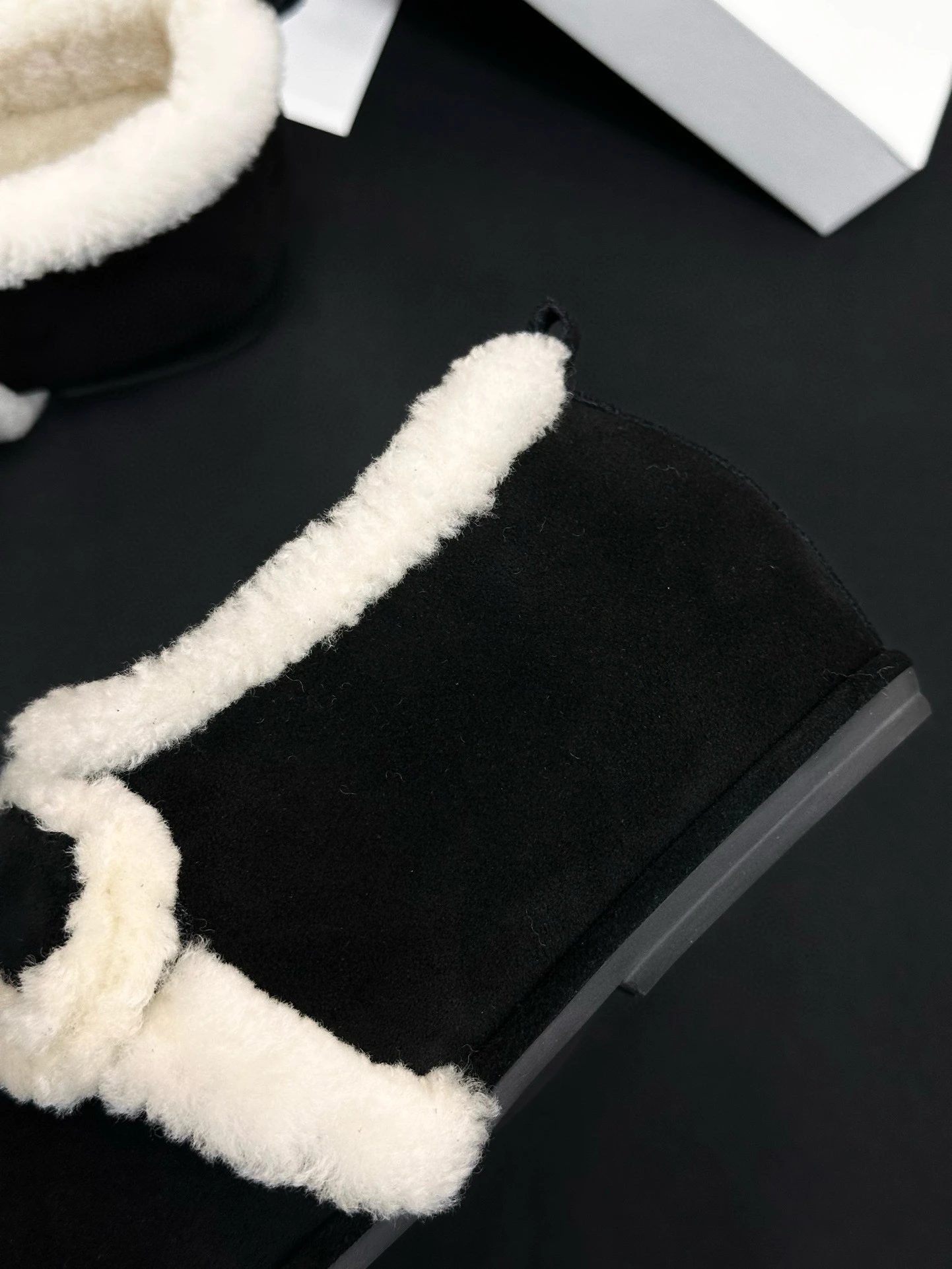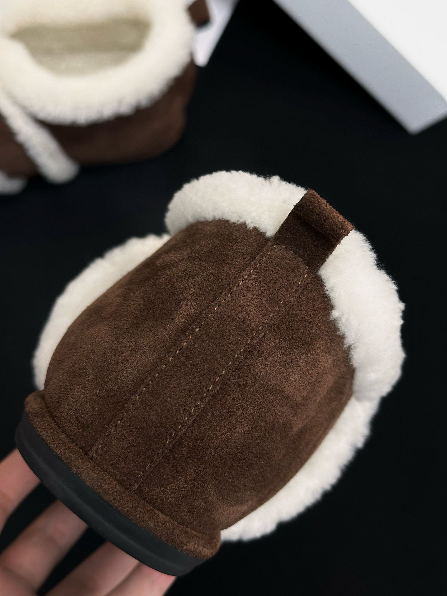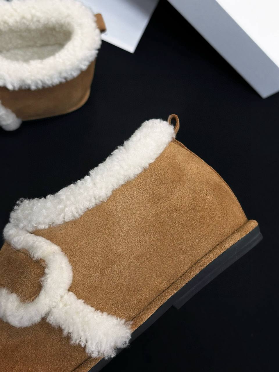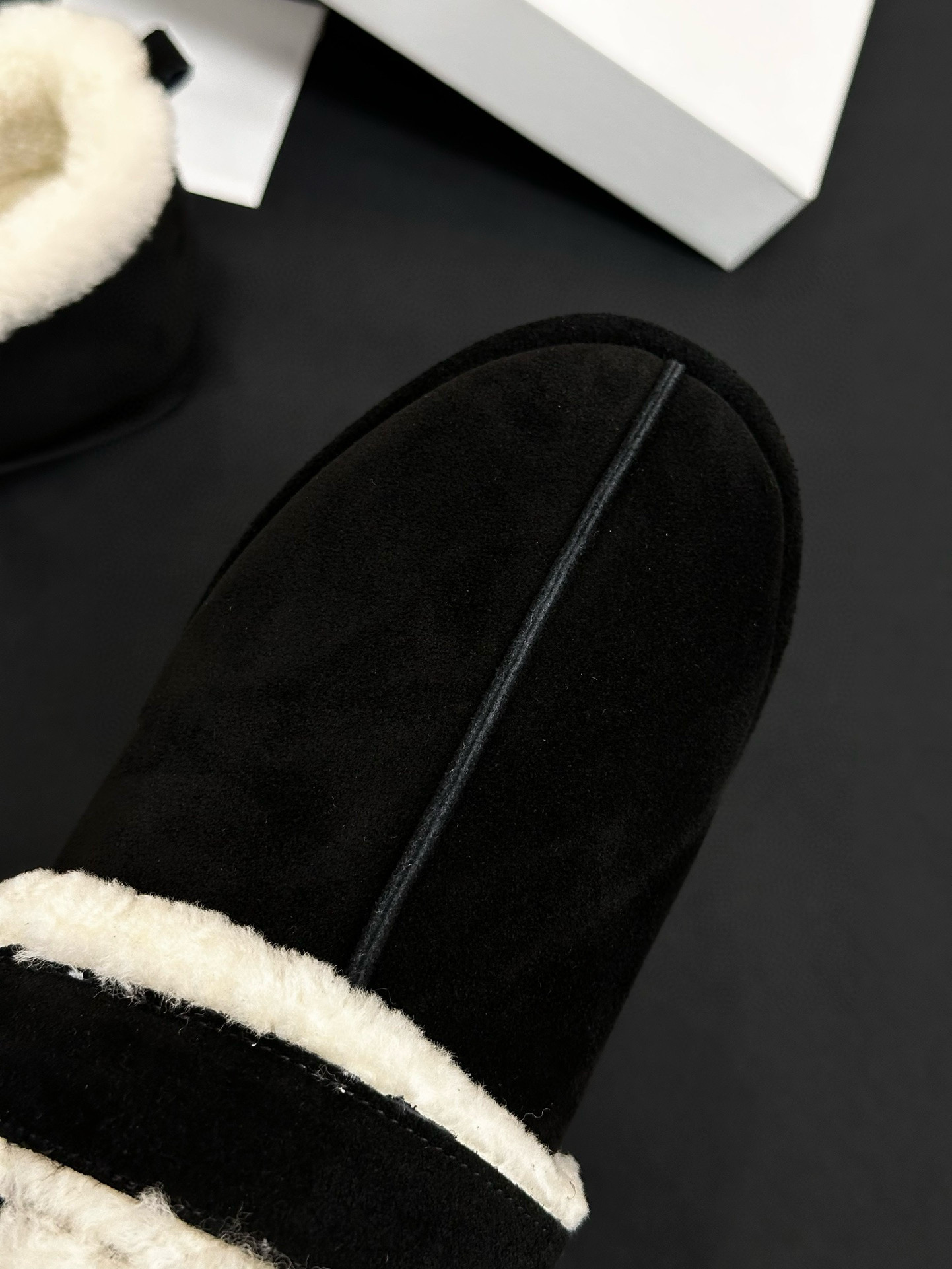 Лоферы изготовлены из премиальной натуральной замши — мягкой, эластичной кожи с естественной текстурой, устойчивой к износу и придающей обуви премиум-вид. Внутренняя отделка из натурального меха обеспечивает тепло и комфорт, особенно в прохладную погоду. Оторочка вокруг лодыжки — широкая, пушистая полоса меха в тон замше, которая фиксируется мягкой застёжкой или просто облегает ногу, добавляя объёма и шарма без лишней декоративности.