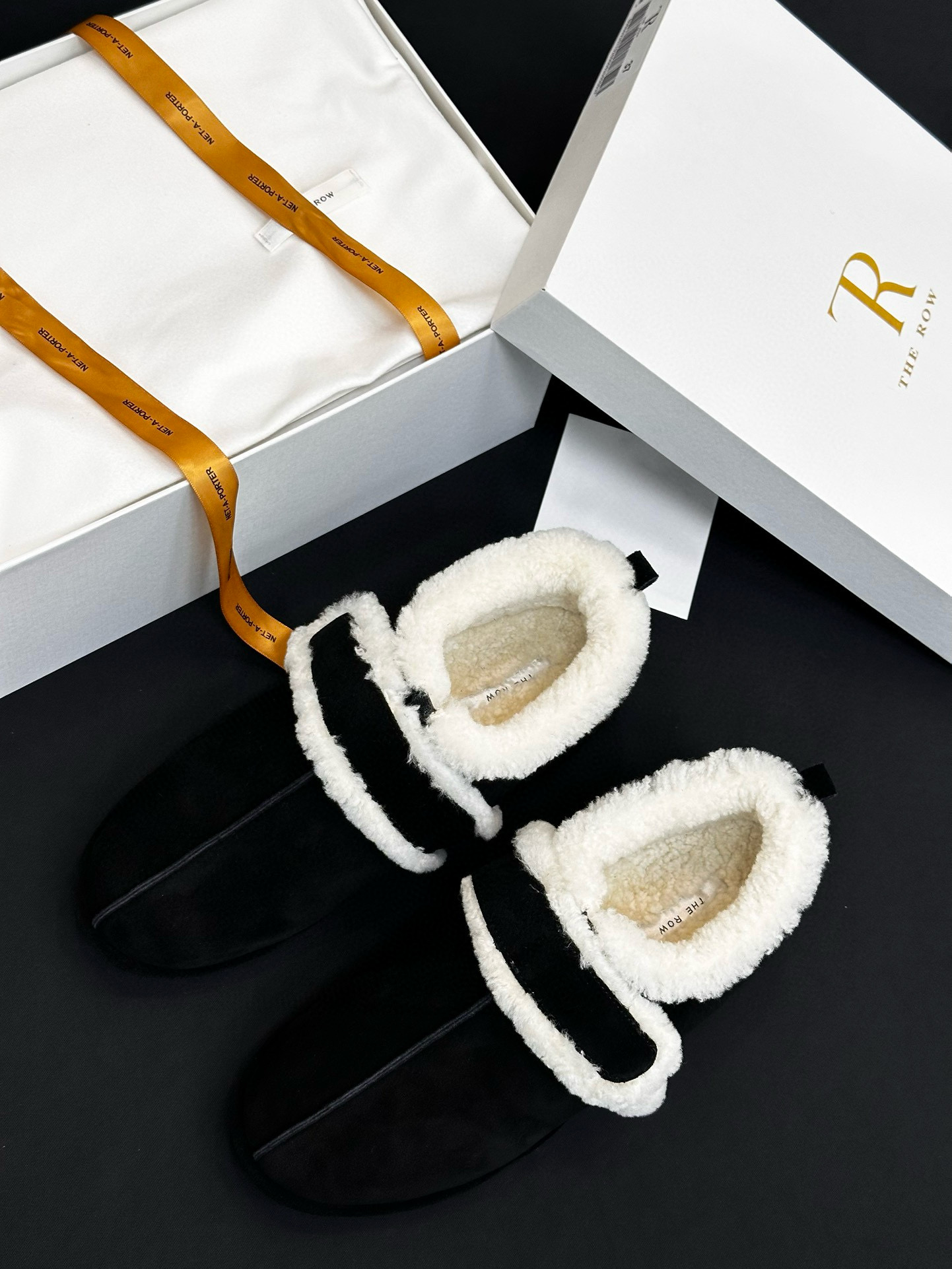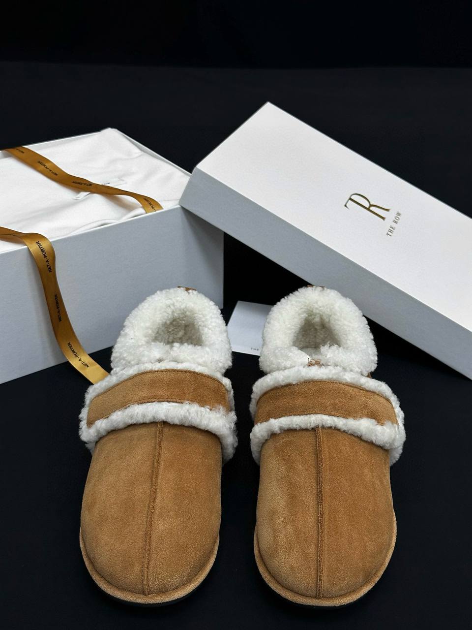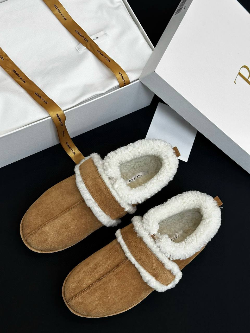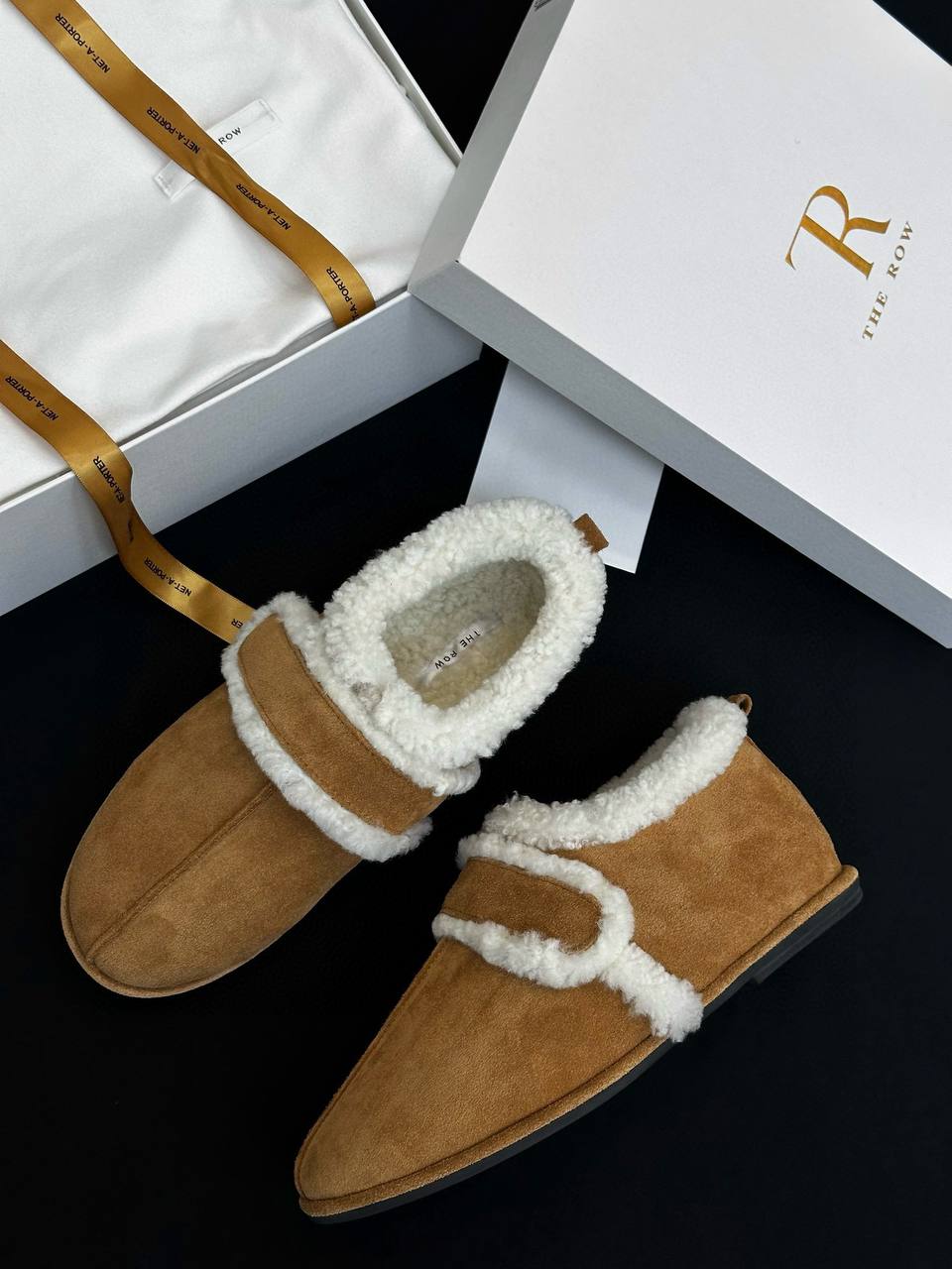 Лоферы THE ROW универсальны для осени-зимы: мех греет ноги, а дышащая замша подходит для сухой погоды; летом их можно носить без оторочки для лёгкости. Плоская подошва не скользит на гладких поверхностях, удобна для ходьбы по городу, сочетается с джинсами, брюками, платьями или даже пижамой для домашней одежды. Размерная сетка стандартная, с рекомендацией брать на полразмера больше для меха. Нет жёстких элементов, так что обувь адаптируется к стопе за 1–2 дня.