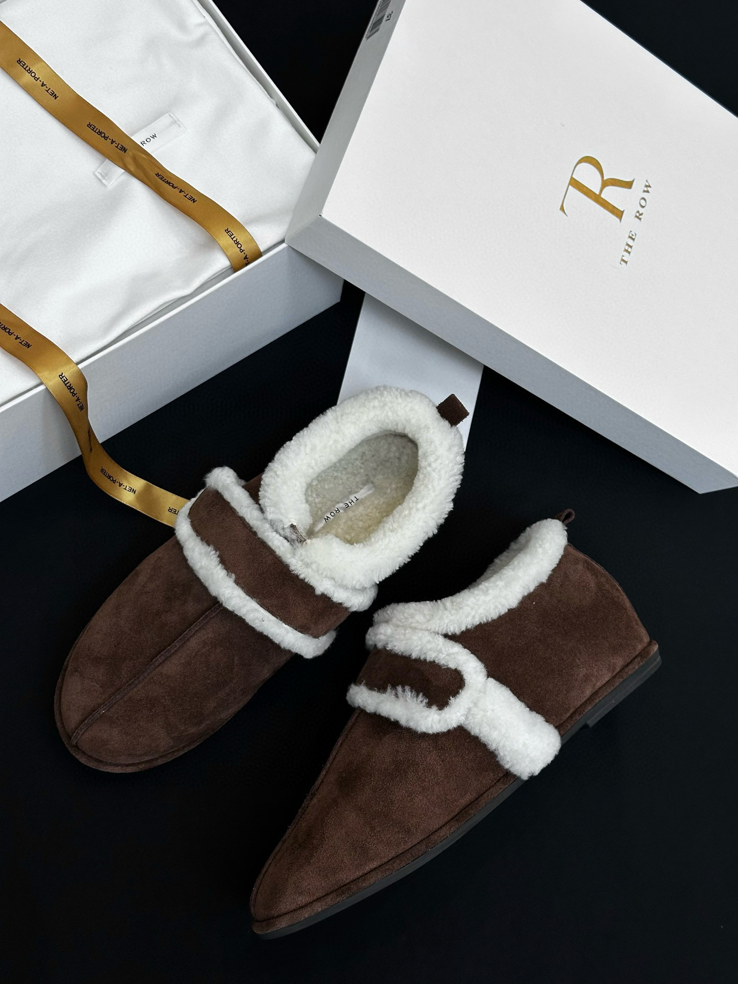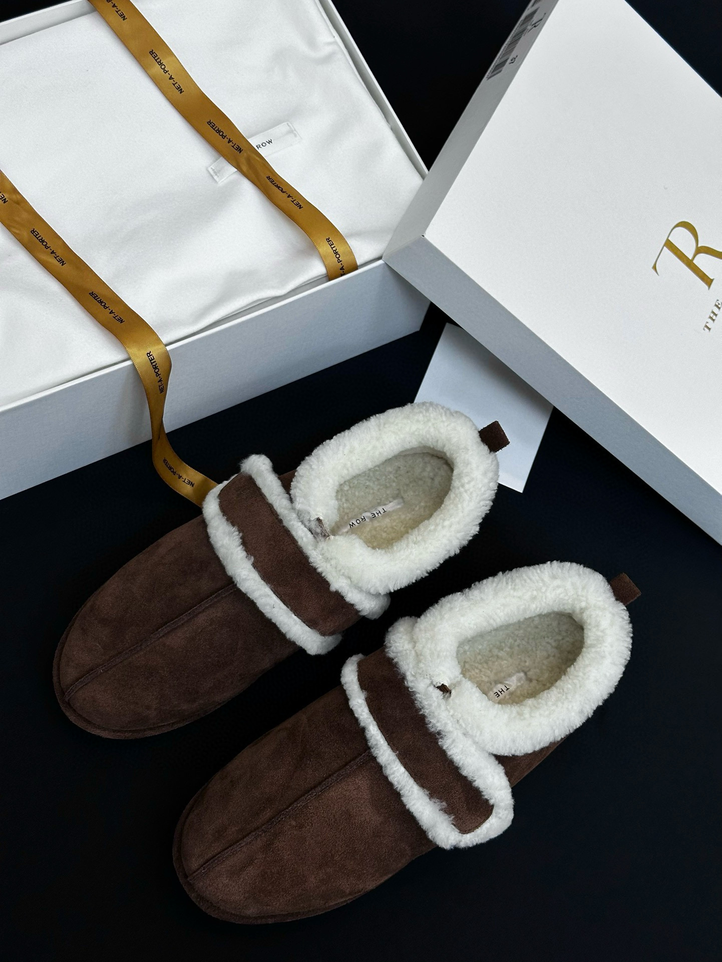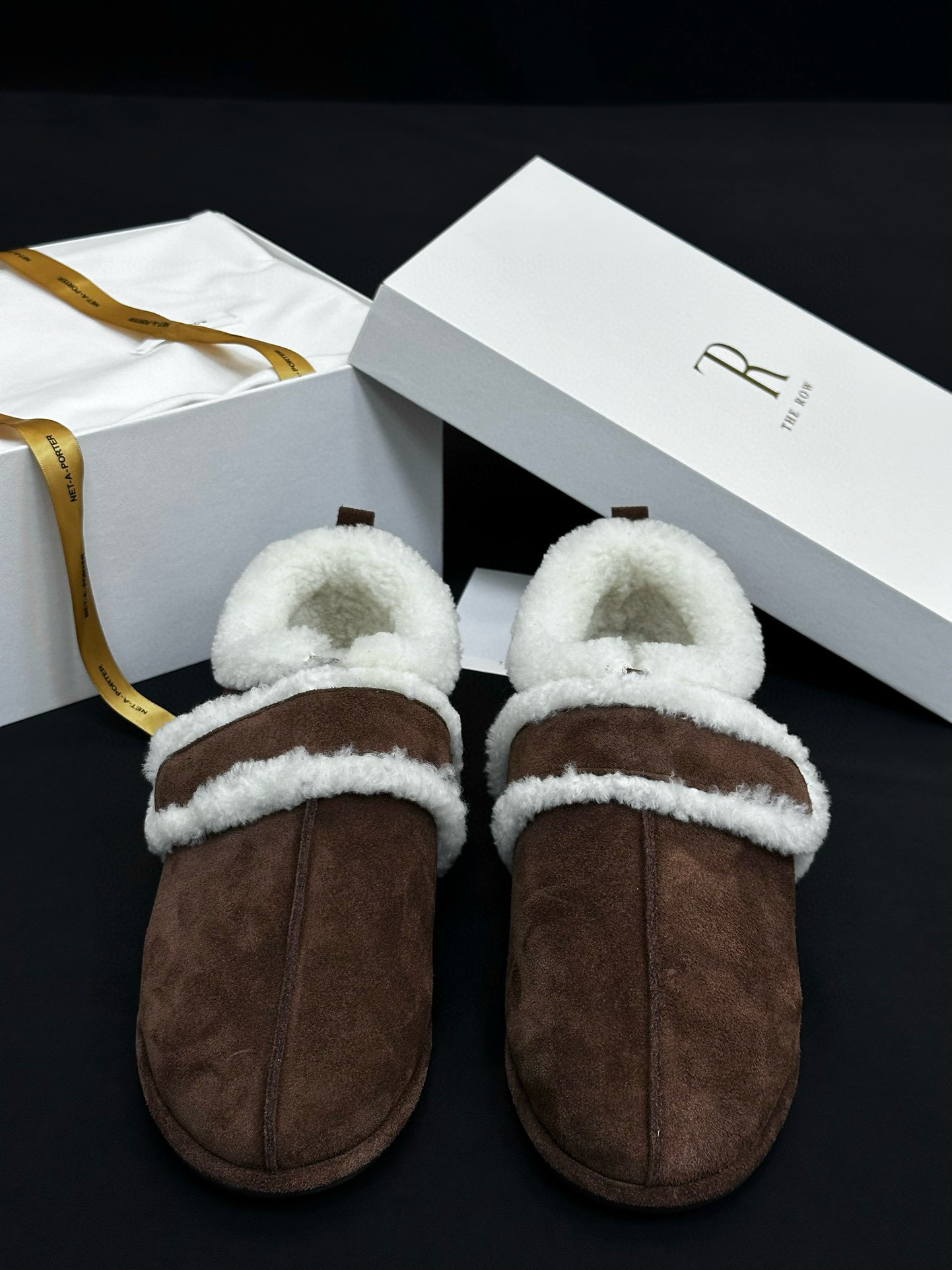 THE ROW предлагает женские лоферы — идеальное сочетание повседневной роскоши и комфорта в будни. Эти модели в трёх оттенках (коричневый, чёрный и бежевый) с мягкой меховой оторочкой вокруг лодыжки подчёркивают утончённый минимализм бренда. Плоская подошва и расслабленный силуэт делают их универсальными для городских прогулок, офиса или уютных вечеров.