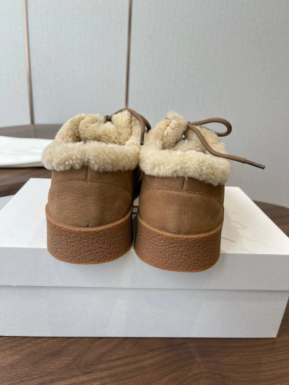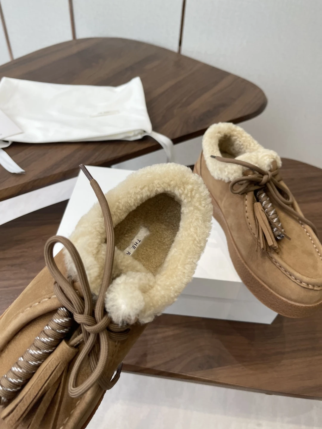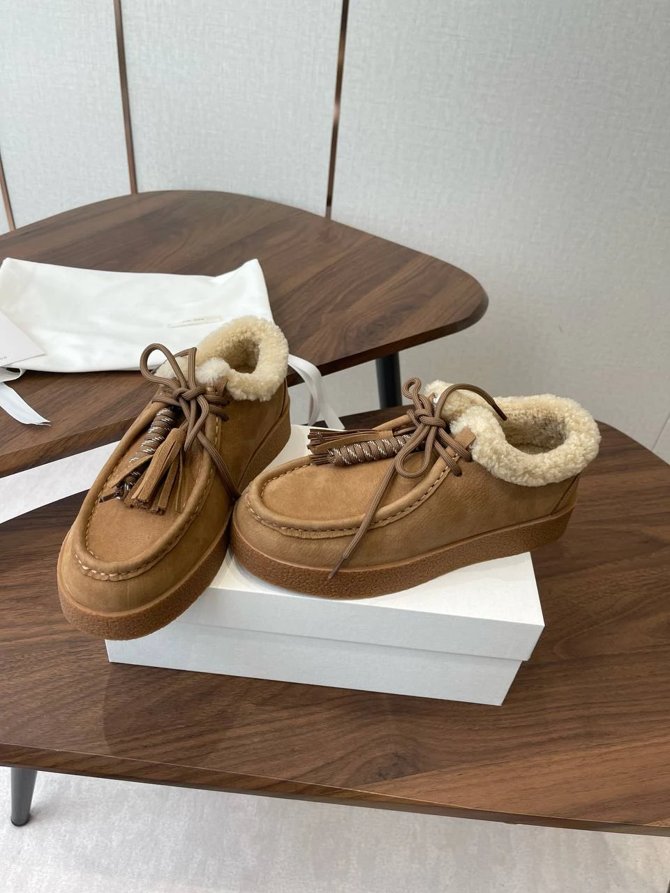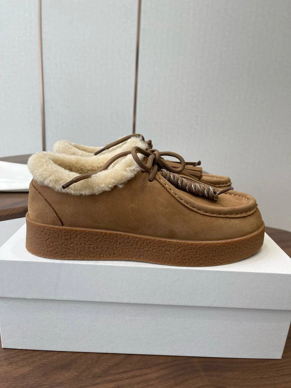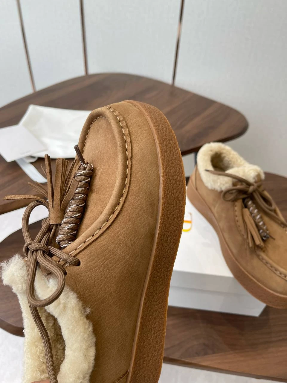 Лоферы THE ROW выполнены из благородной замши теплого карамельного оттенка и полностью утеплены натуральной овчиной. Сдержанный силуэт в сочетании с мягкой шерстяной отделкой по воротнику и аккуратными кисточками на шнуровке создают идеальный баланс комфорта и элегантной повседневности.