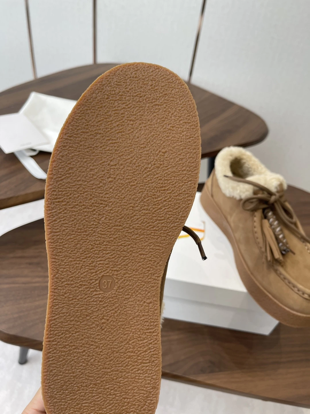 • Верх: мягкая замша глубокого светло-коричневого тона, аккуратно простроченная по классической мокасинной технологии.