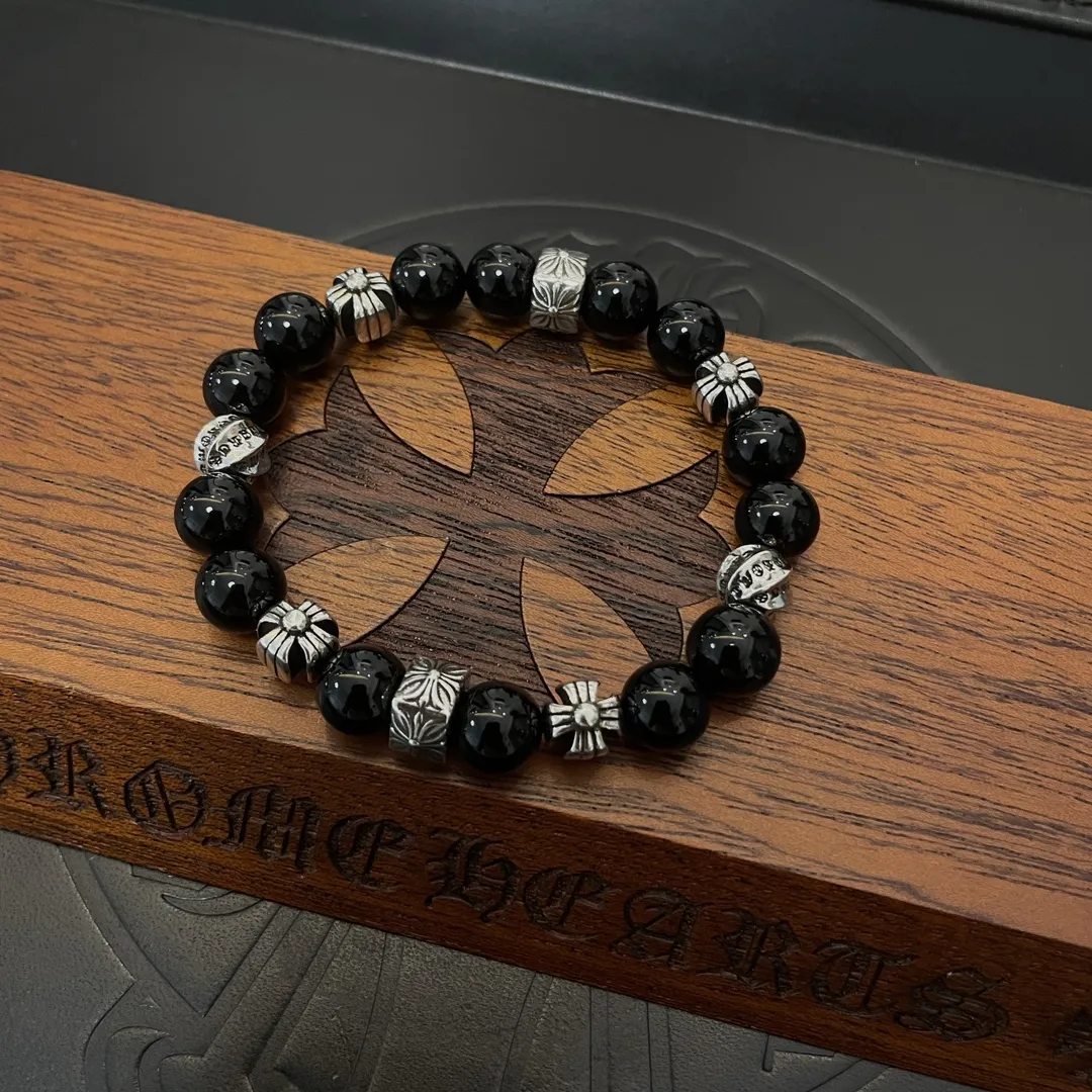 Браслет Chrome Hearts с многоэлементным дизайном из обсидиана — это стильный и выразительный аксессуар, который сочетает в себе элементы высокого ювелирного искусства и оригинального дизайна. Бренд Chrome Hearts славится своими качественными изделиями, в которых часто используются уникальные материалы и характерные элементы, такие как символика и готические мотивы.