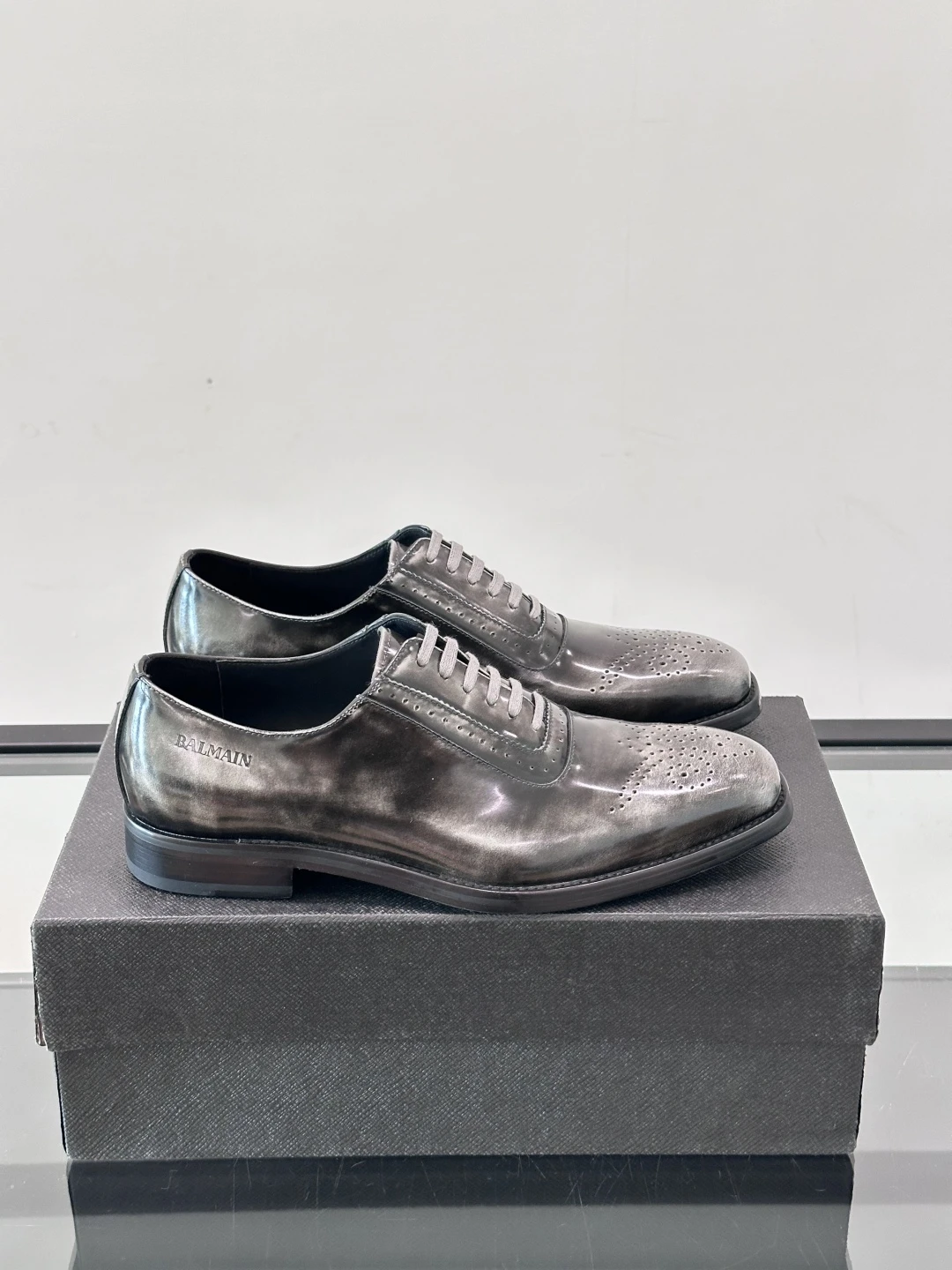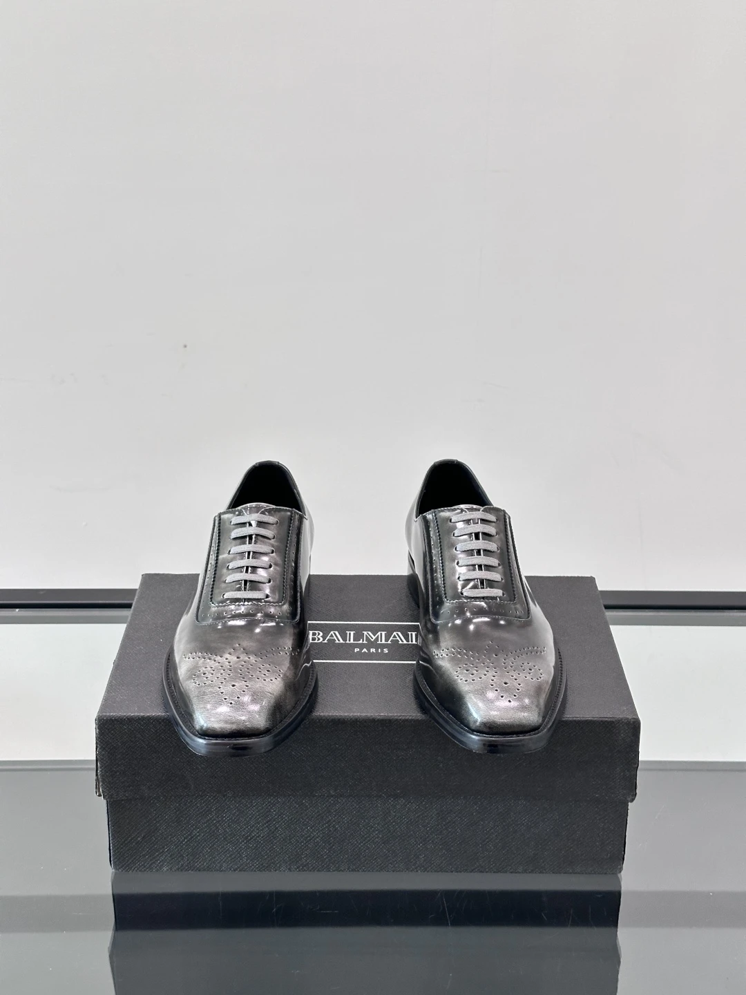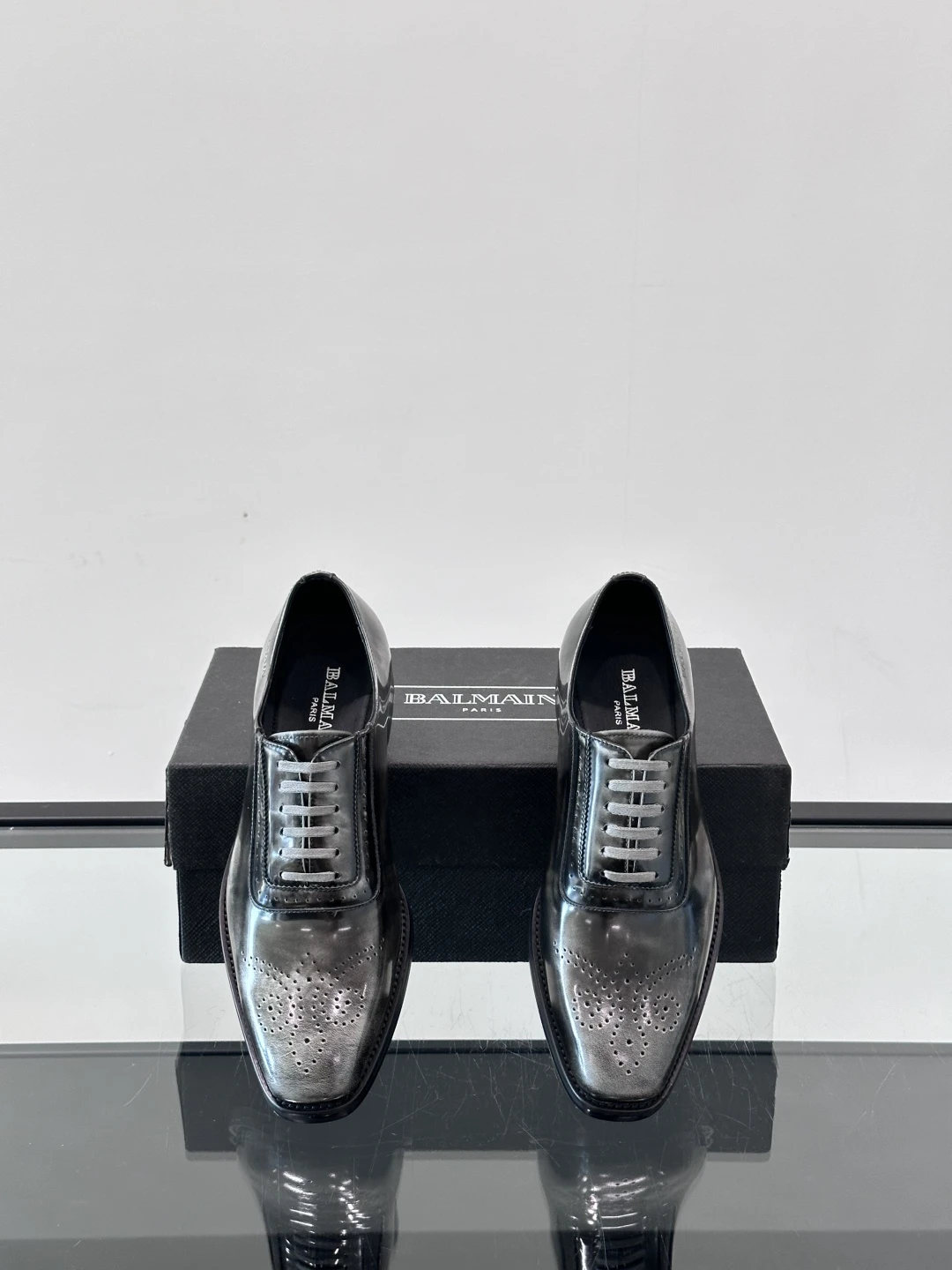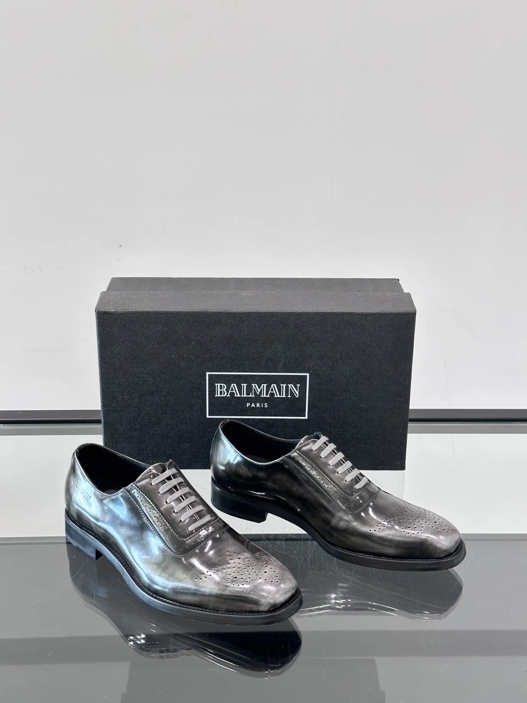 Элегантные мужские туфли Balmain выполнены из высококачественной коровьей кожи. Классический силуэт с современной обработкой поверхности придаёт обуви уникальный металлический блеск и подчеркнутую роскошь. Детализированные перфорации на мысе добавляют утончённый акцент, а фирменная шнуровка обеспечивает комфортную посадку.