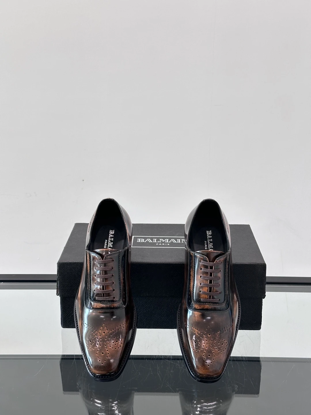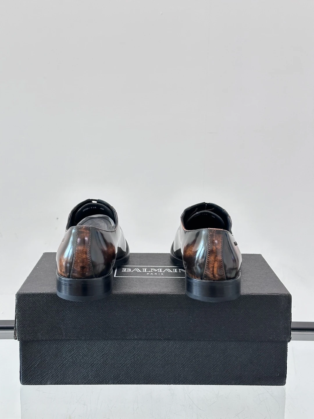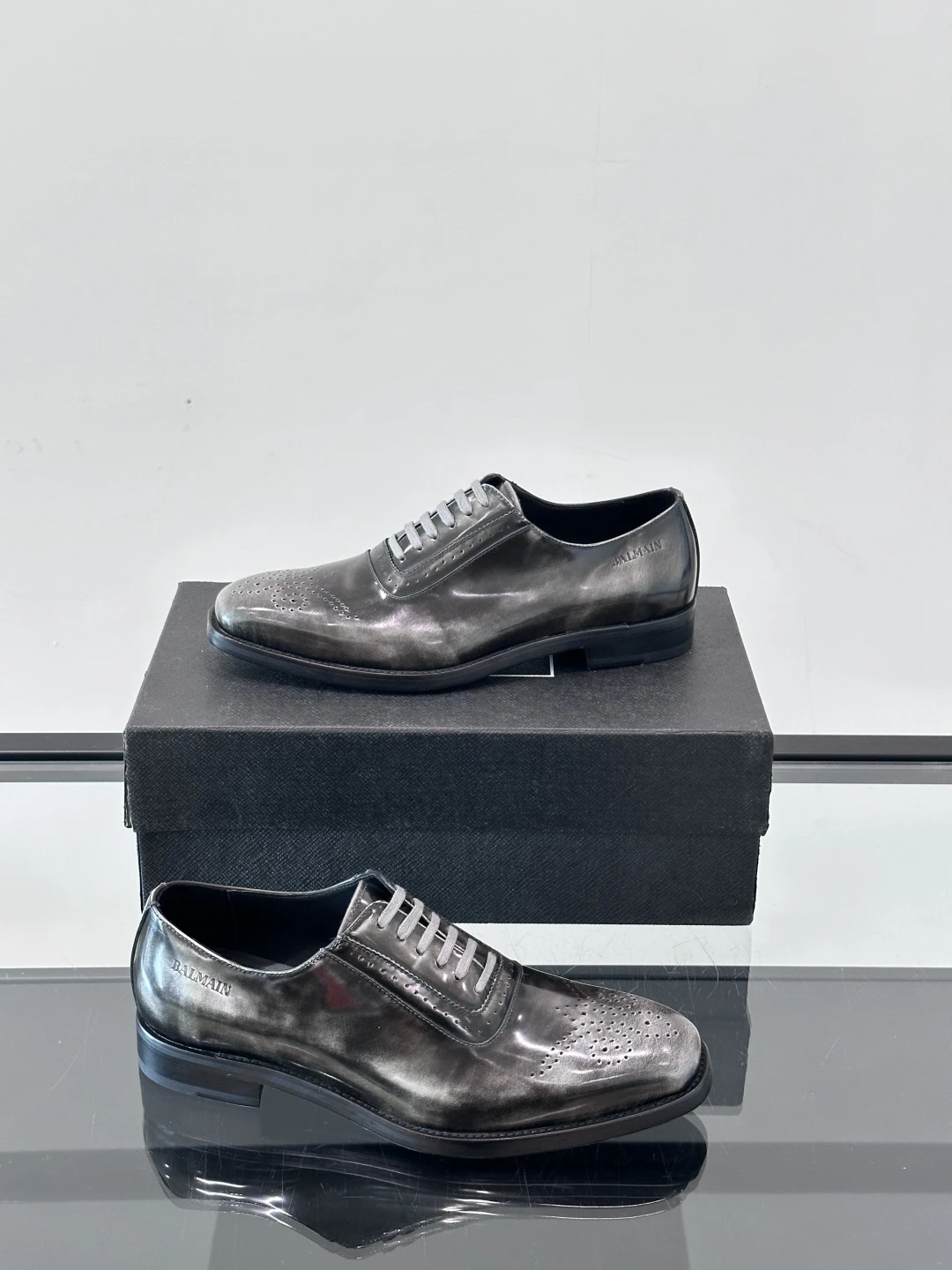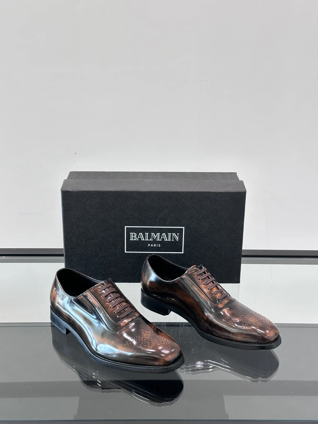 Элегантные мужские туфли Balmain выполнены из высококачественной коровьей кожи. Классический силуэт с современной обработкой поверхности придаёт обуви уникальный металлический блеск и подчеркнутую роскошь. Детализированные перфорации на мысе добавляют утончённый акцент, а фирменная шнуровка обеспечивает комфортную посадку.