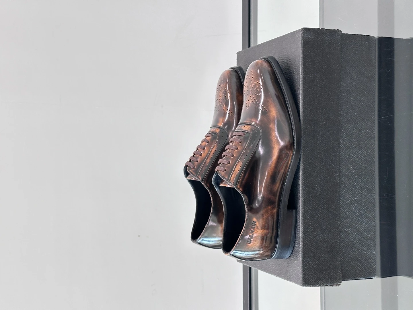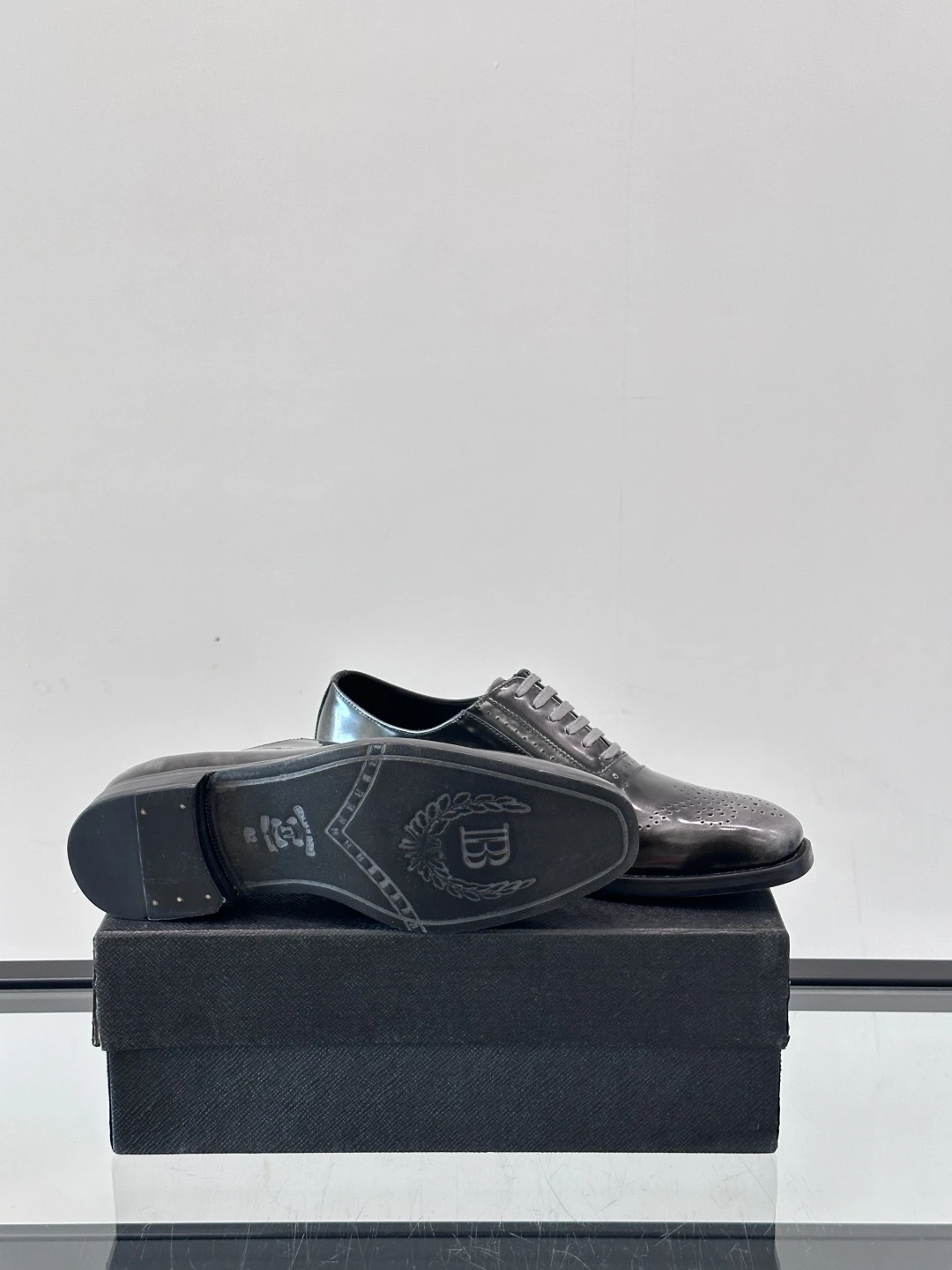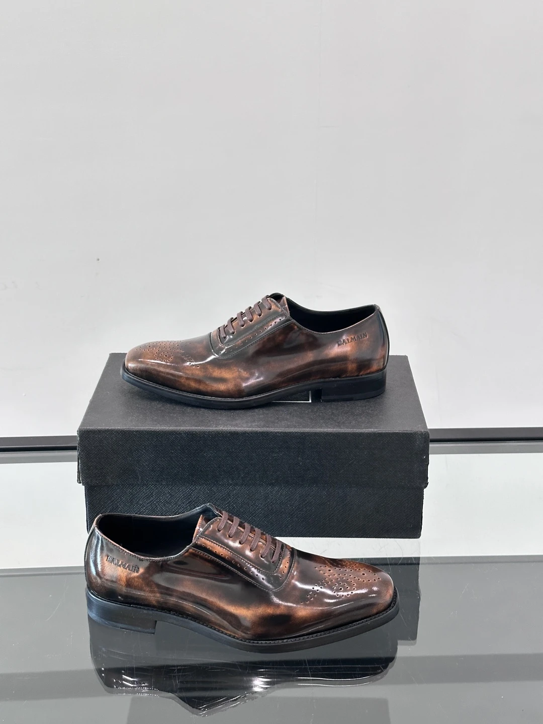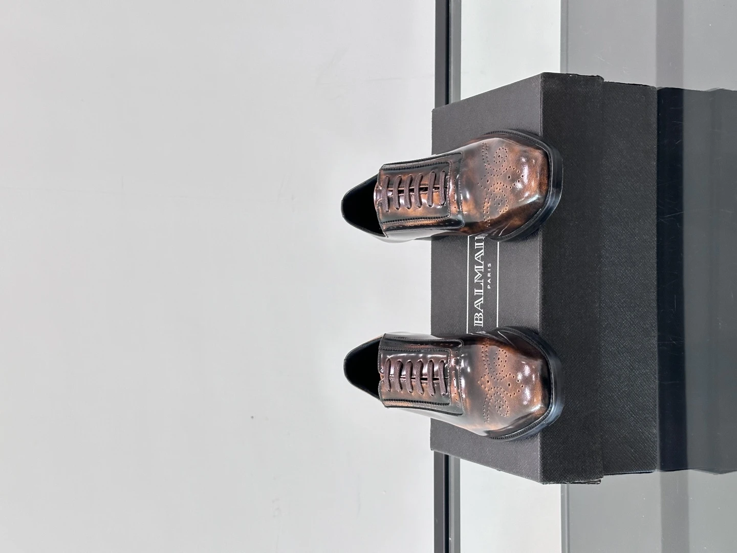Элегантные мужские туфли Balmain выполнены из высококачественной коровьей кожи. Классический силуэт с современной обработкой поверхности придаёт обуви уникальный металлический блеск и подчеркнутую роскошь. Детализированные перфорации на мысе добавляют утончённый акцент, а фирменная шнуровка обеспечивает комфортную посадку.