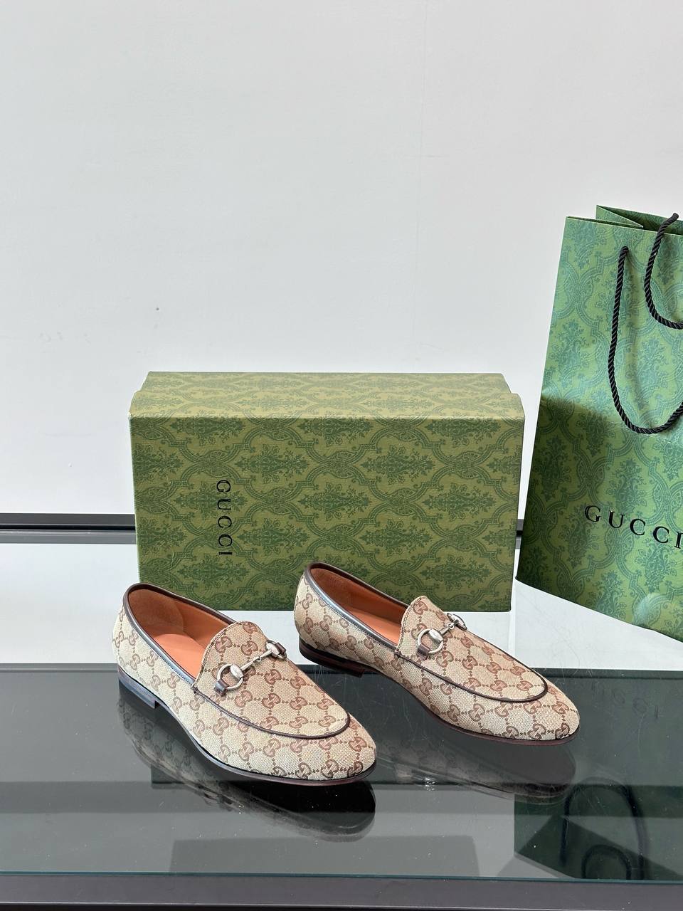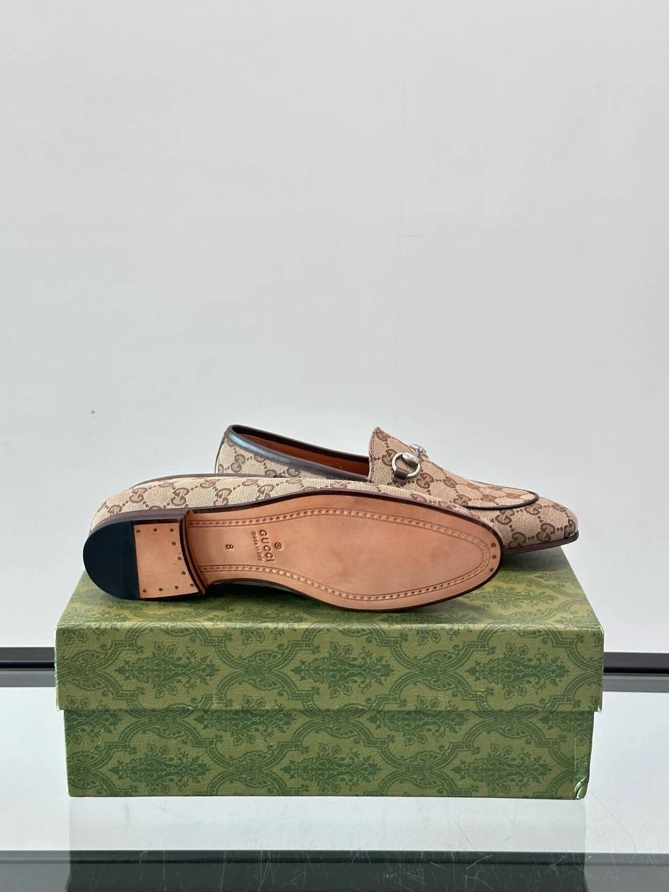 Стильные мужские лоферы от GUCCI выполнены из высококачественной коровьей кожи с фирменным принтом GG. Элегантная конструкция подчеркивается культовой декоративной пряжкой, которая добавляет образу выразительности.
