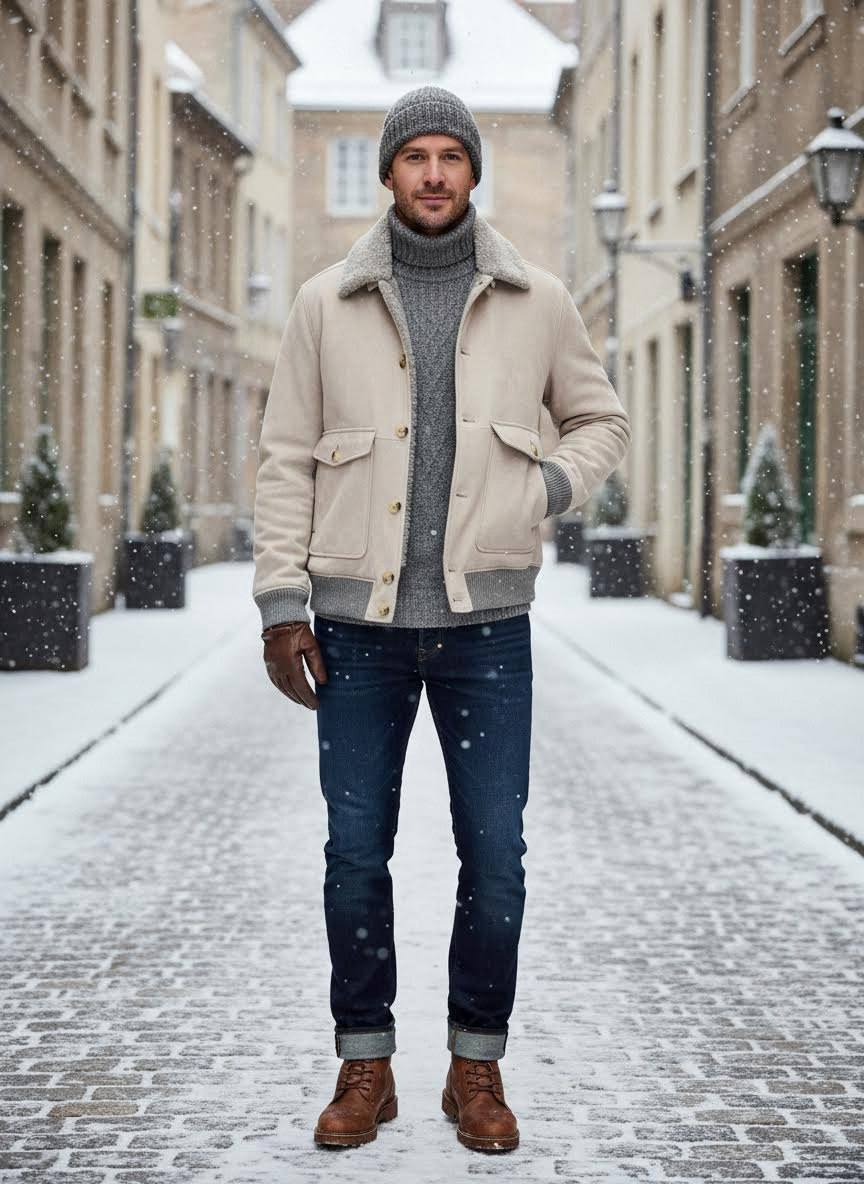 Элегантная мужская дублёнка Brunello Cucinelli в спокойной песочно‑серой гамме — сочетающая мягкую замшу и натуральную шерсть ягнёнка. Лаконичный бомбер‑силуэт с отложным воротником из густого меха, функциональными накладными карманами и вязаной резинкой по низу и манжетам. Идеальный выбор для холодного времени года: сочетание роскошной текстуры и практичности.