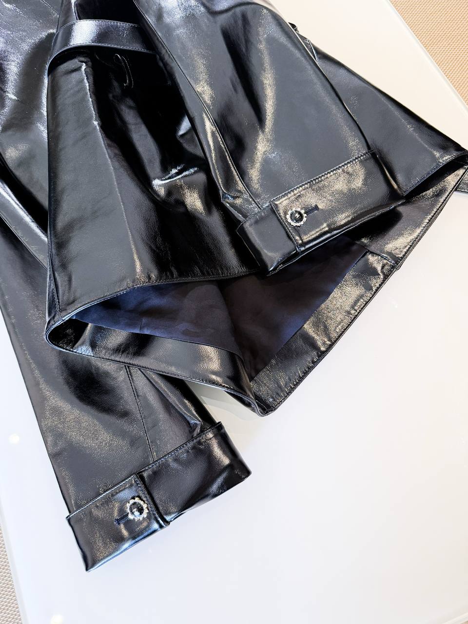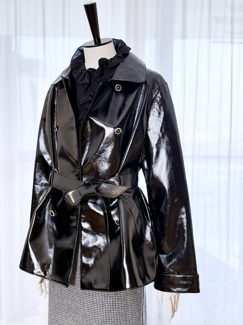 Элегантный двубортный тренч из лакированной овчины насыщенного чёрного оттенка — идеальное сочетание классического силуэта и современного глянцевого финиша. Модель подчёркивает талию благодаря съёмному поясу, аккуратно держит форму за счёт продуманного кроя и станет яркой деталью как повседневных, так и вечерних образов.