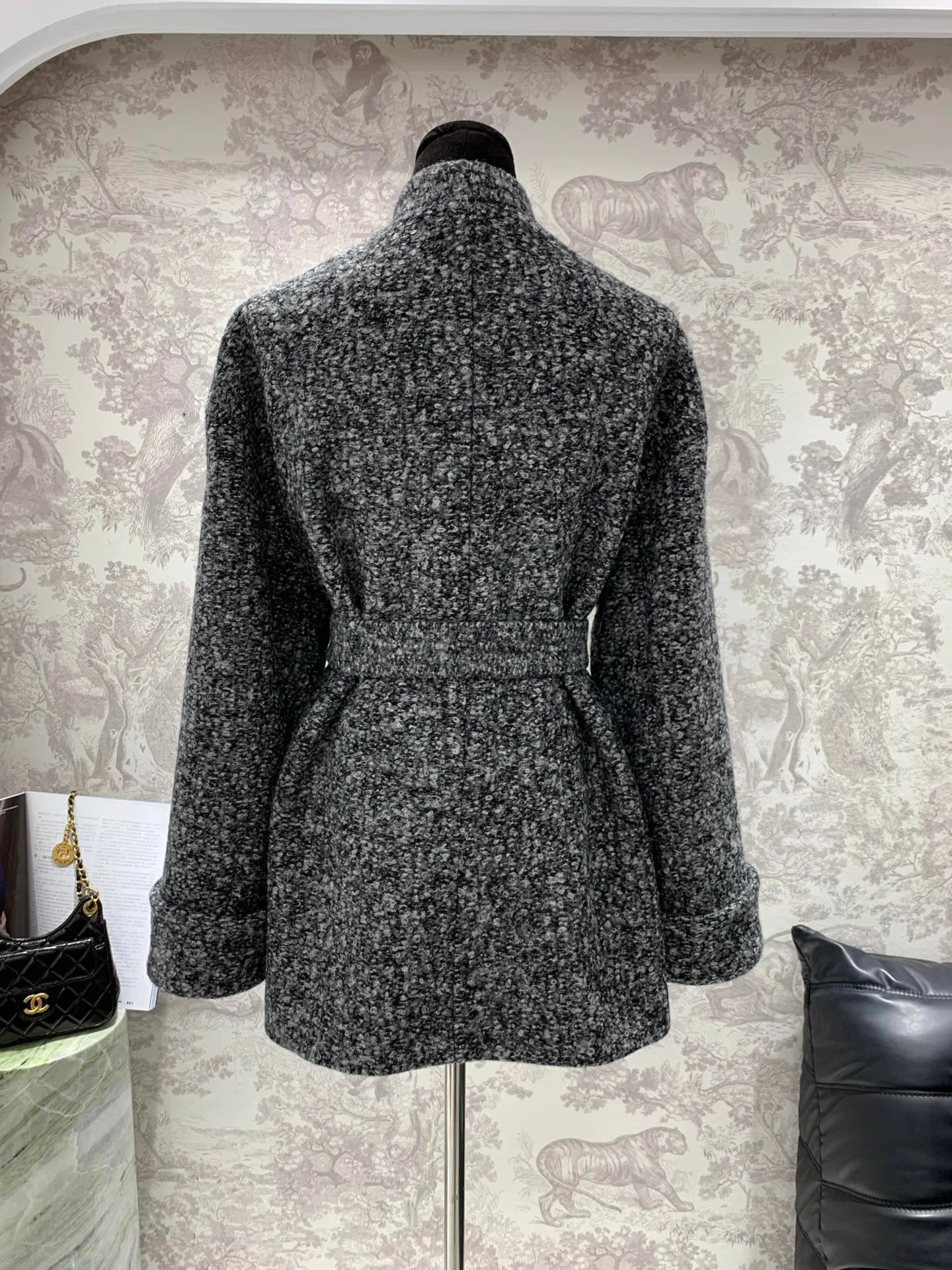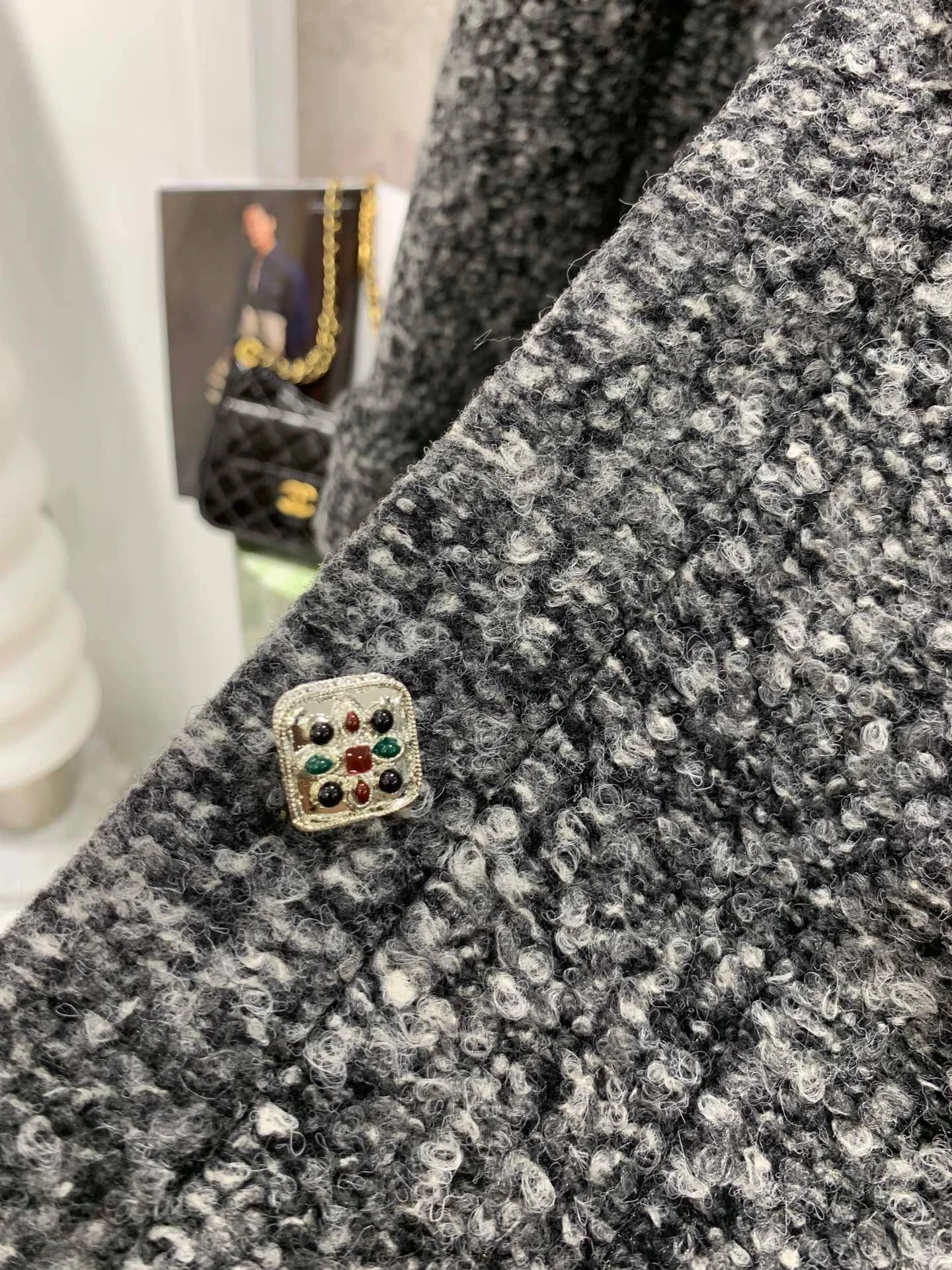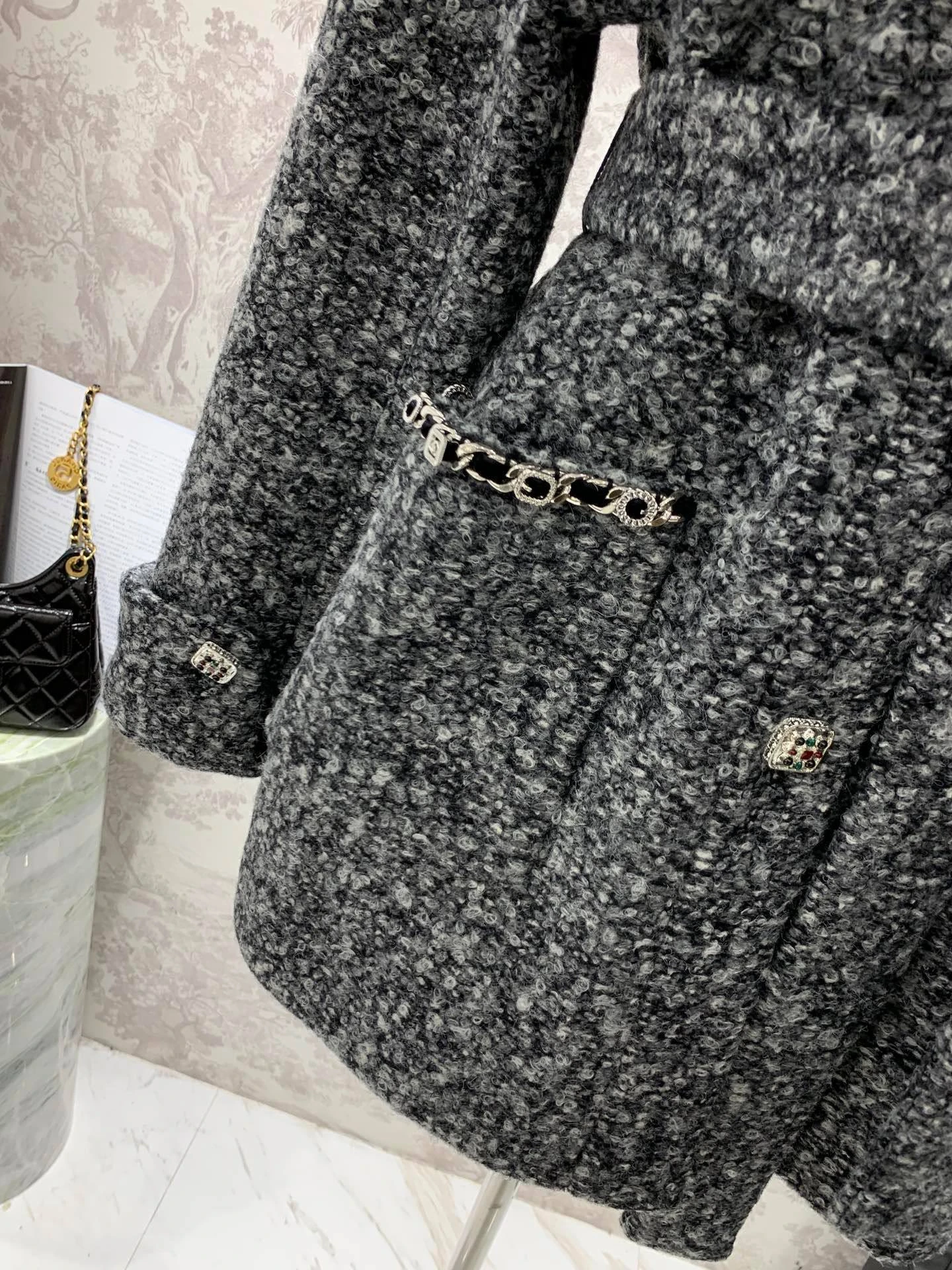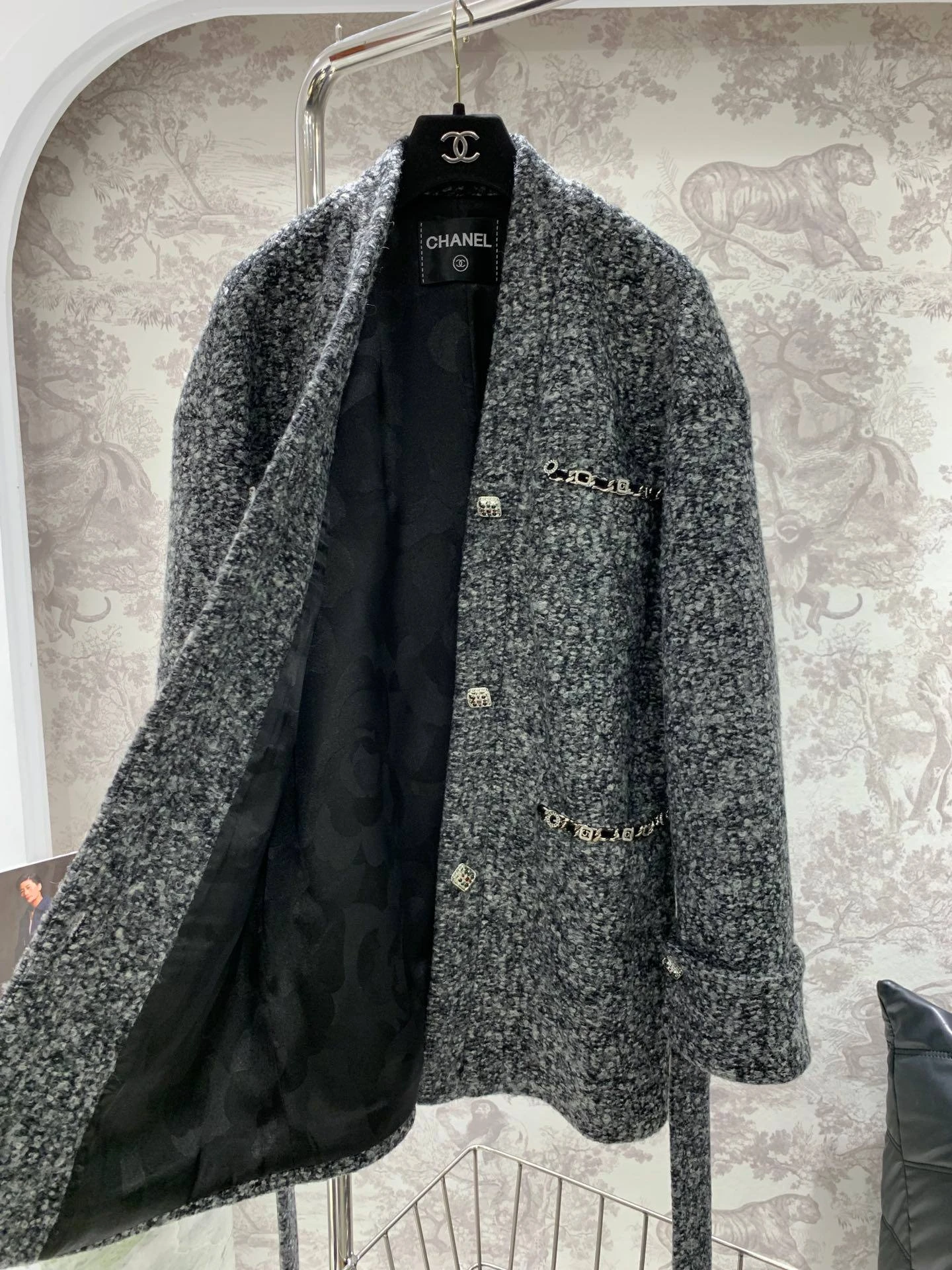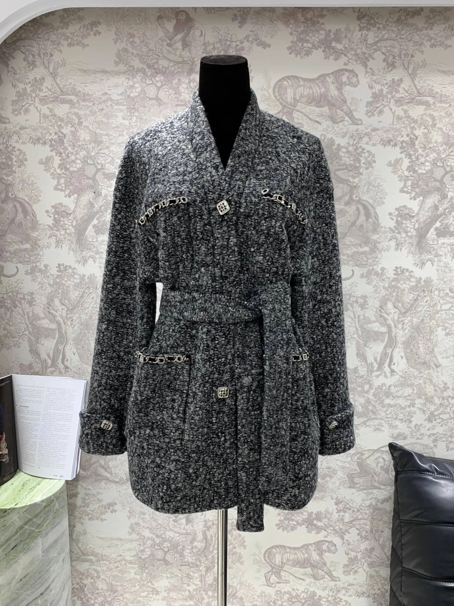 Кардиган-пальто выполнен из плотной фактурной вязаной ткани с выраженной букле- или твидовой структурой, насыщенного графитового цвета с более светлыми вкраплениями. Модель имеет глубокий шалевый воротник, прямой силуэт, который можно подчеркнуть съемным поясом на талии. Практичные накладные карманы расположены спереди и декорированы металлической цепочной фурнитурой; аналогичный декоративный элемент присутствует и на груди, и на манжетах. Центральная застёжка — декоративные квадратные пуговицы с металлической отделкой, придающие модели благородный акцент.