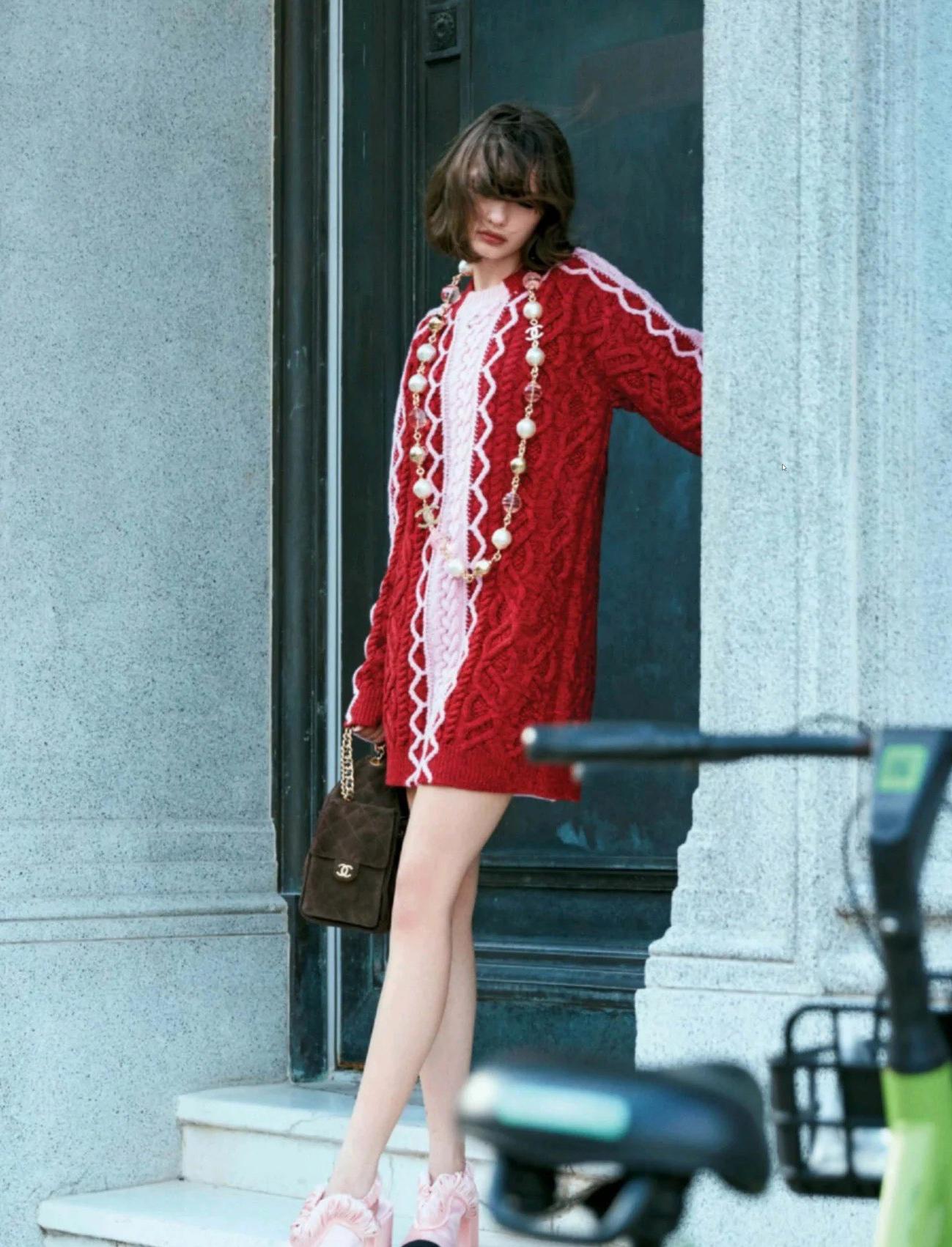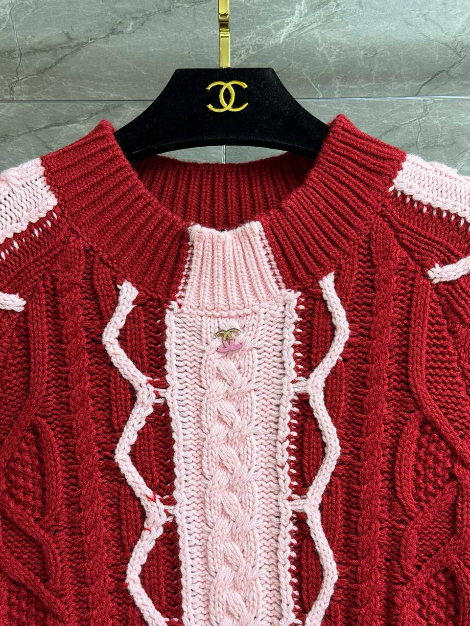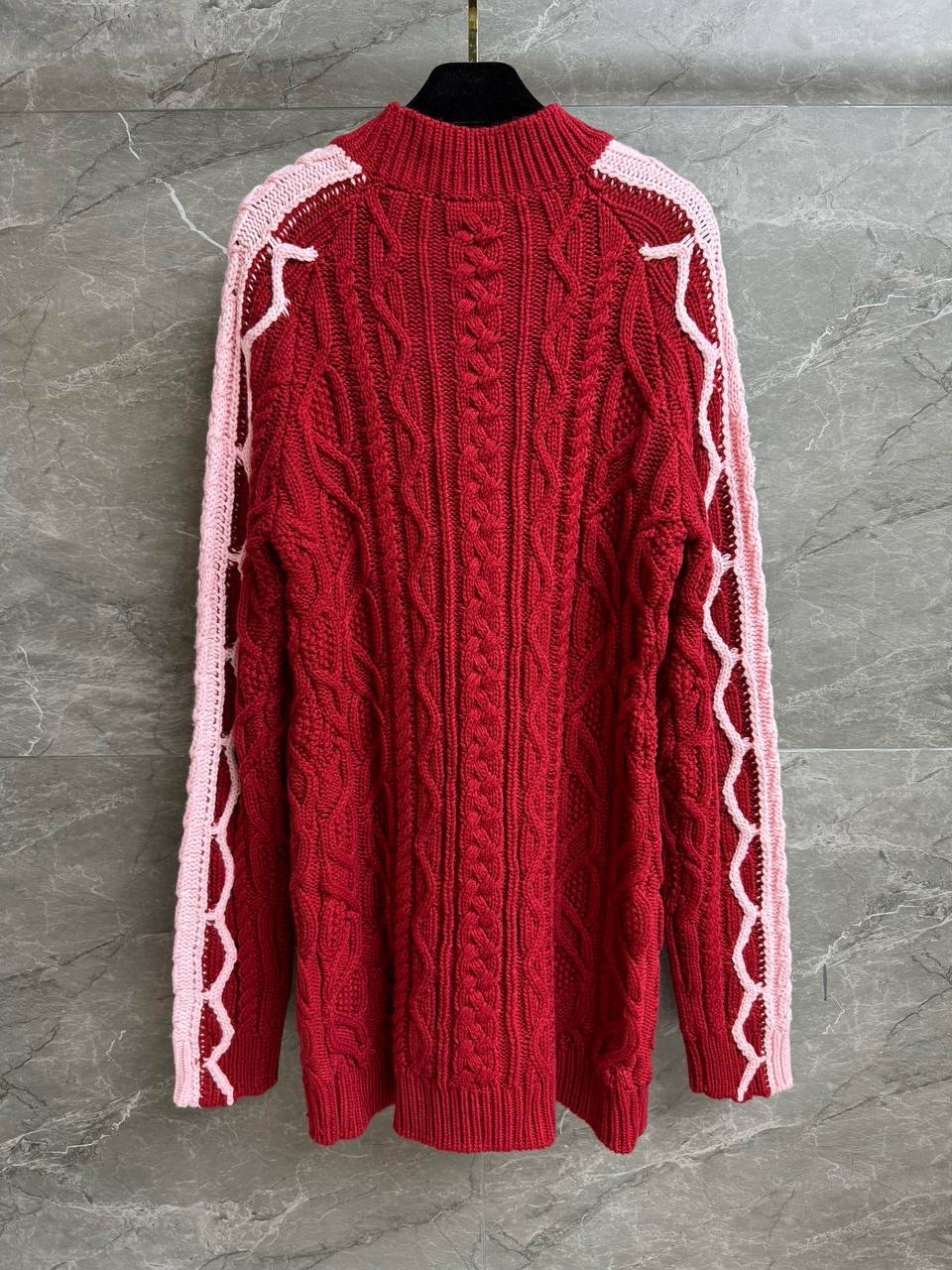 Женское вязаное платье CHANEL выполнено в стиле oversize и сочетает оттенки бордового и нежно-розового. Модель украшена фактурными косами и оригинальными узорными линиями вдоль рукавов и по центру. Длинные рукава и свободный силуэт обеспечивают комфорт и современный образ. Платье дополнено изысканными аксессуарами — массивными длинными бусами и твидовой сумкой, подчеркивающими элегантность и характер бренда. Идеальный выбор для прогулок по городу и стильных мероприятий.