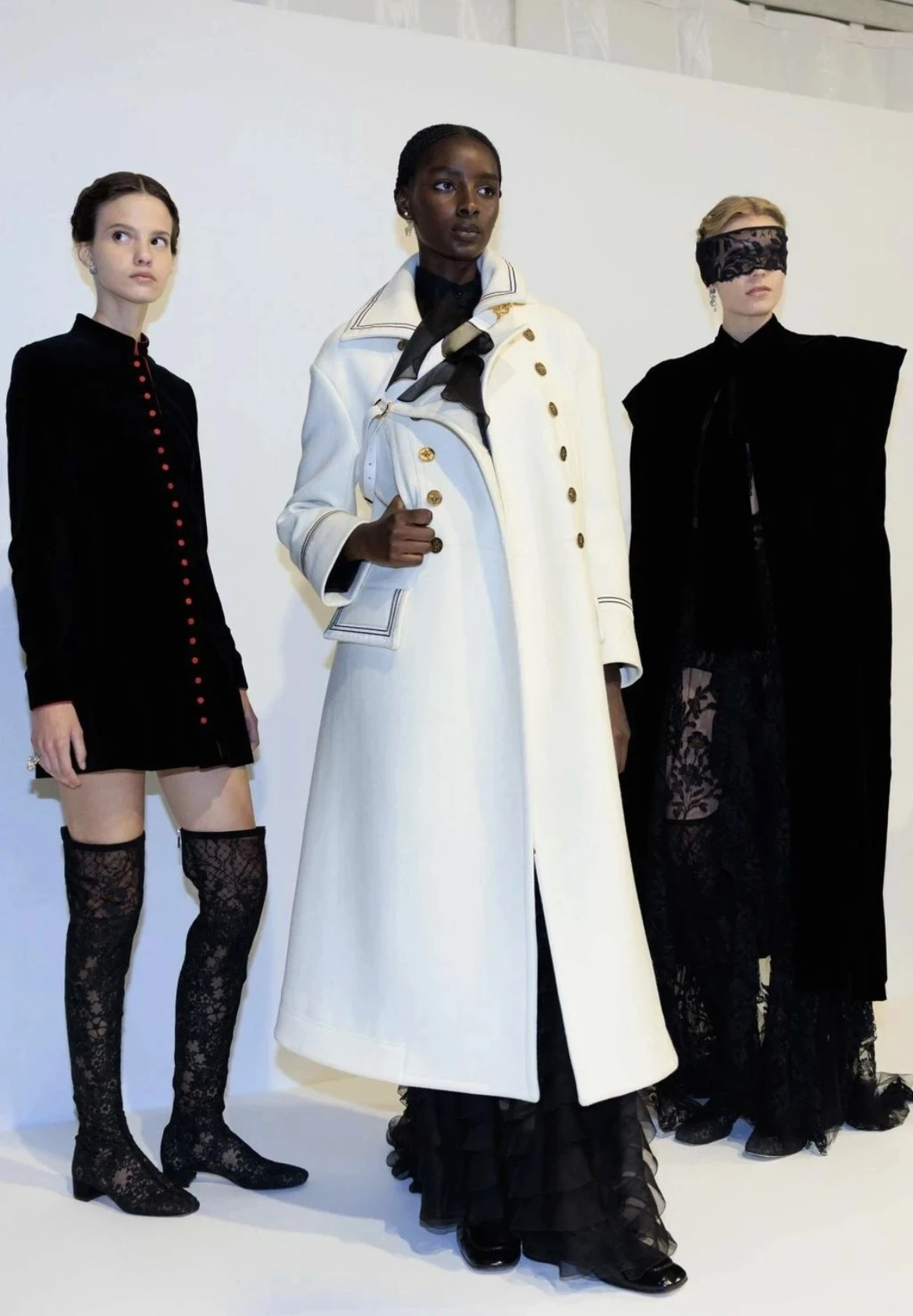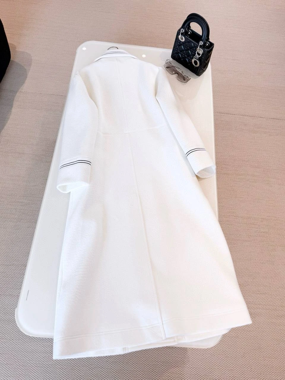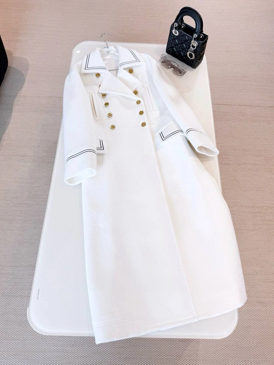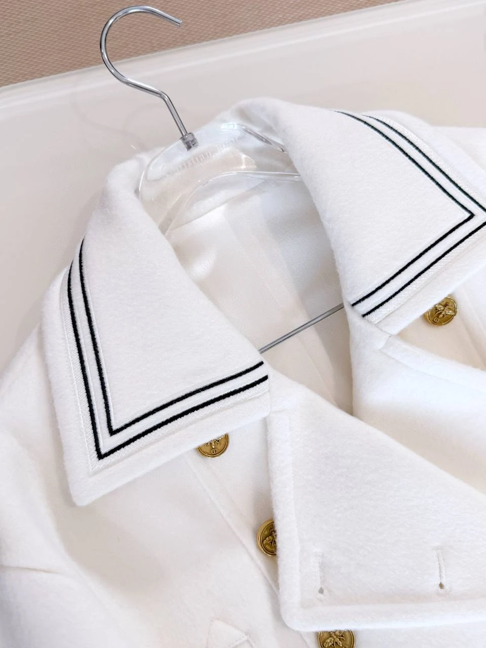 Дизайн пальто вдохновлён военной элегантностью с нотками женственности, характерной для архивов Christian Dior. Это классическая модель с двойной бортовой застёжкой, украшенной рядами золотистых металлических пуговиц, которые придают пальто строгий, но изысканный вид. Длина — миди, до середины икр, с приталенным силуэтом в верхней части, переходящим в лёгкую расклешку для свободы движений. Широкий воротник-шаль с белой окантовкой из той же шерсти создаёт драматичный акцент, идеально обрамляя лицо и позволяя носить с шарфами или без.