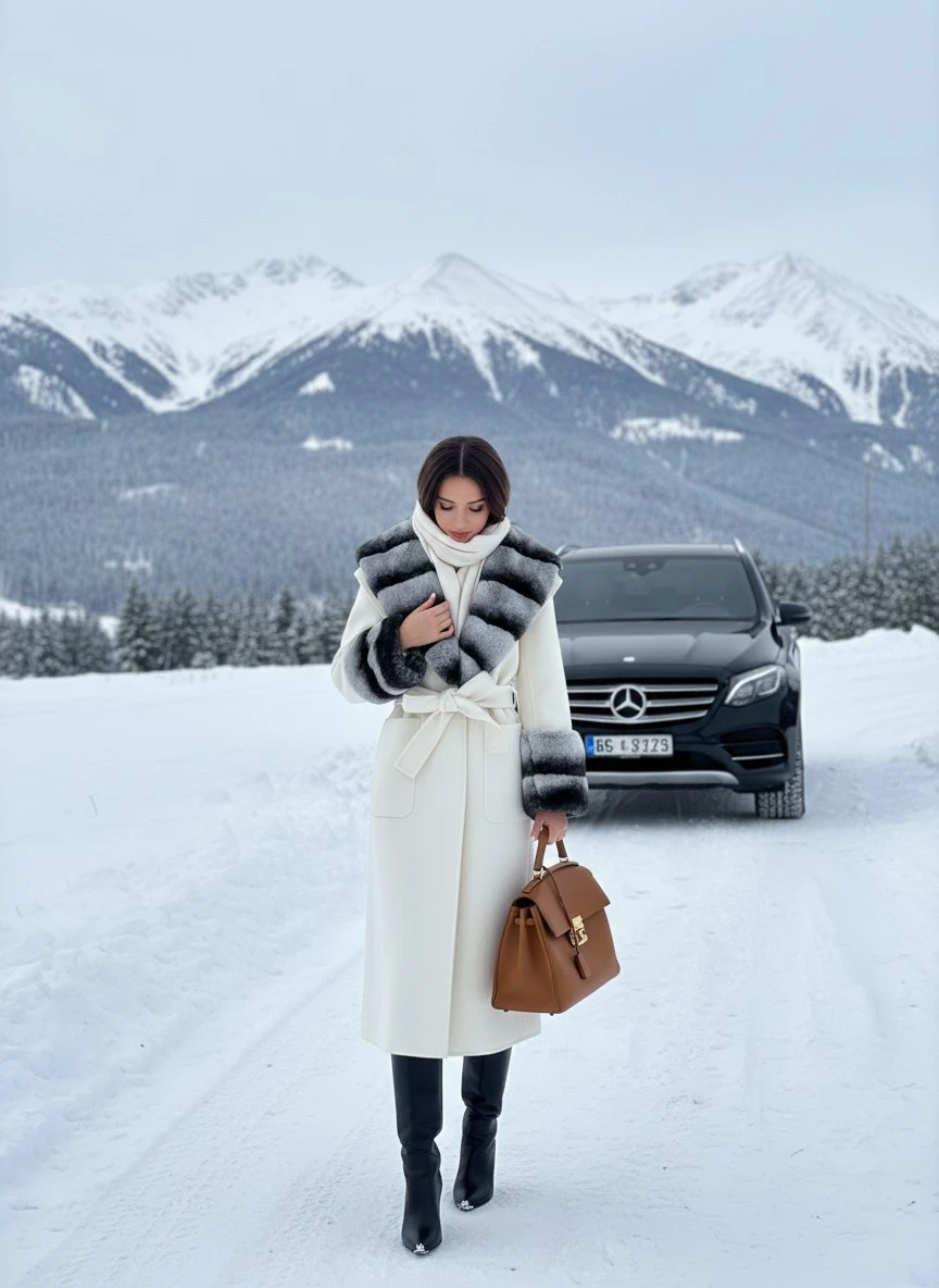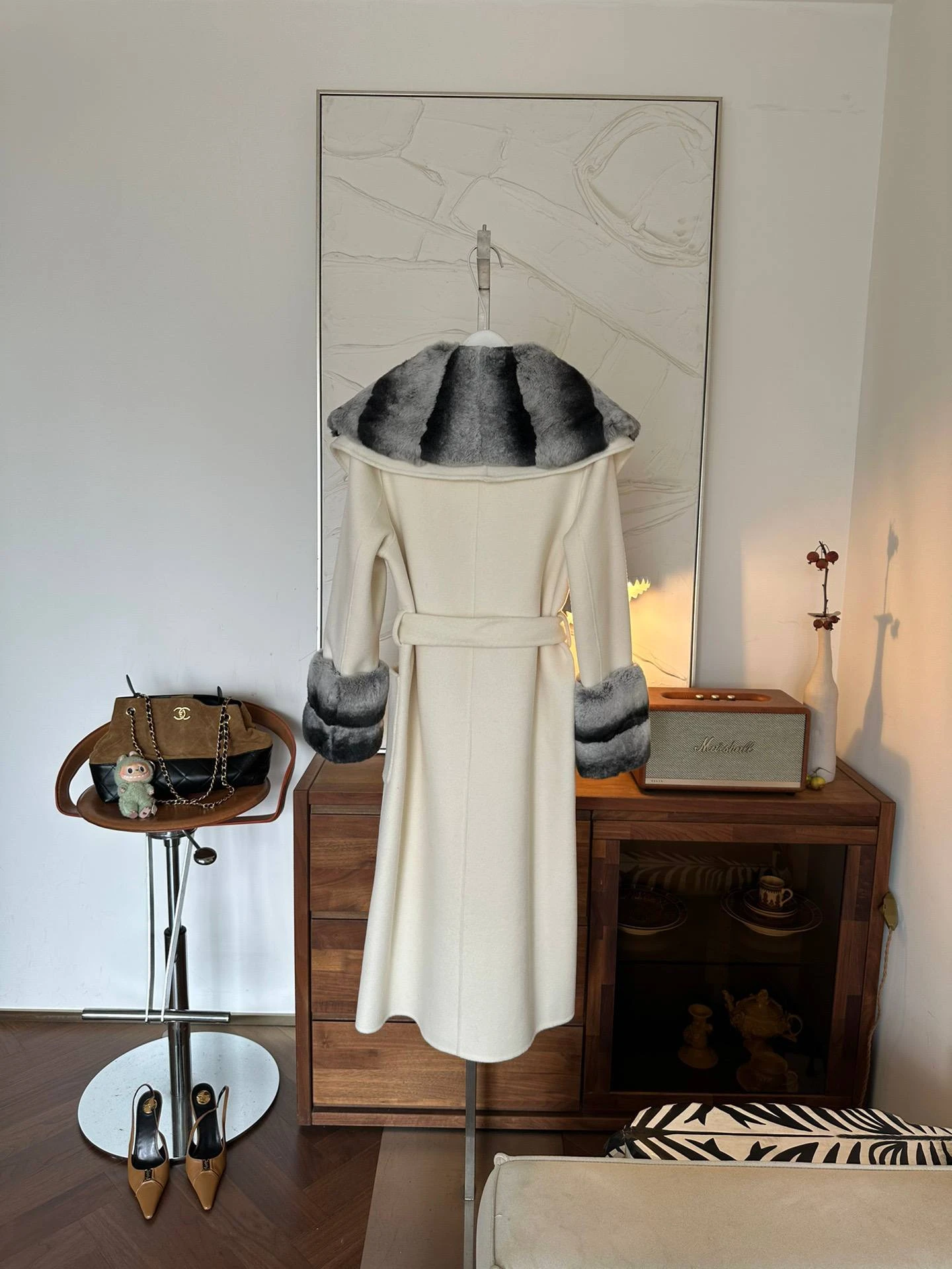 Элегантное длинное пальто с роскошным контрастным воротником и манжетами из полосчатого меха кролика серо‑антрацитовой гаммы. Современный лаконичный силуэт с поясом подчёркивает талию и делает модель универсальной для дневных и вечерних образов.