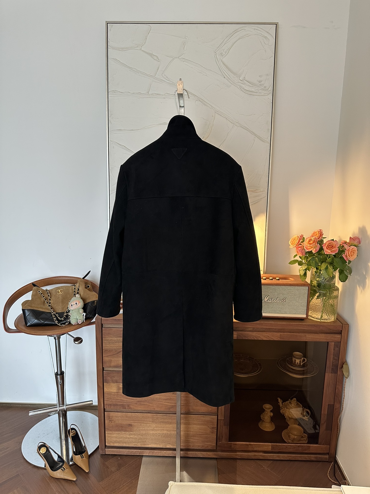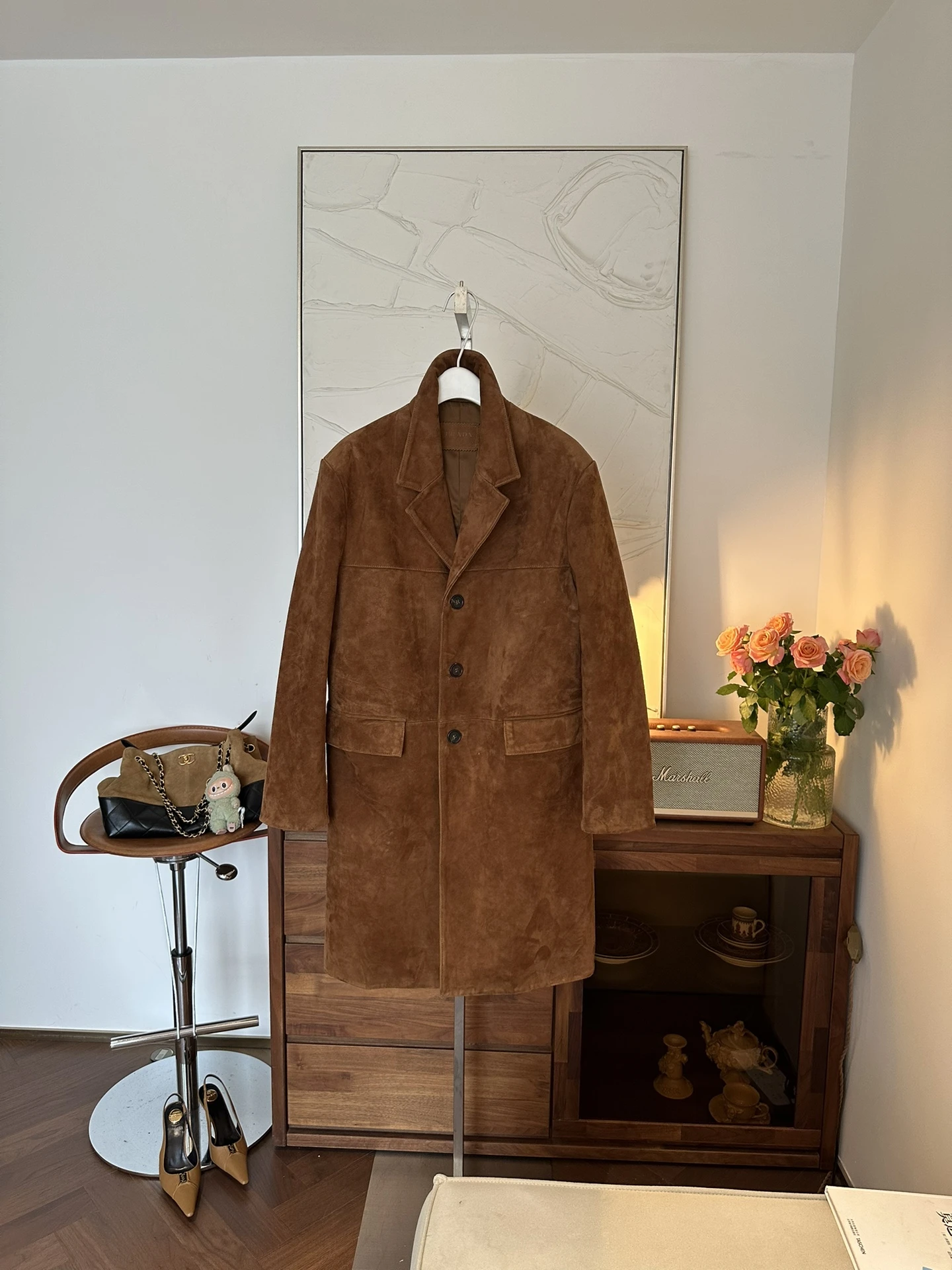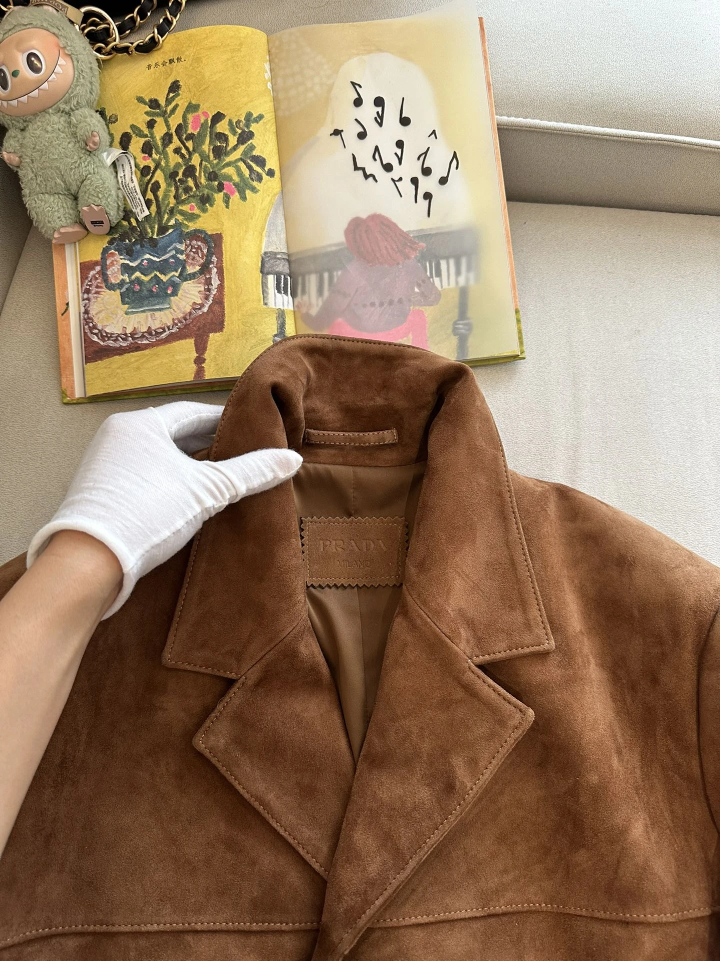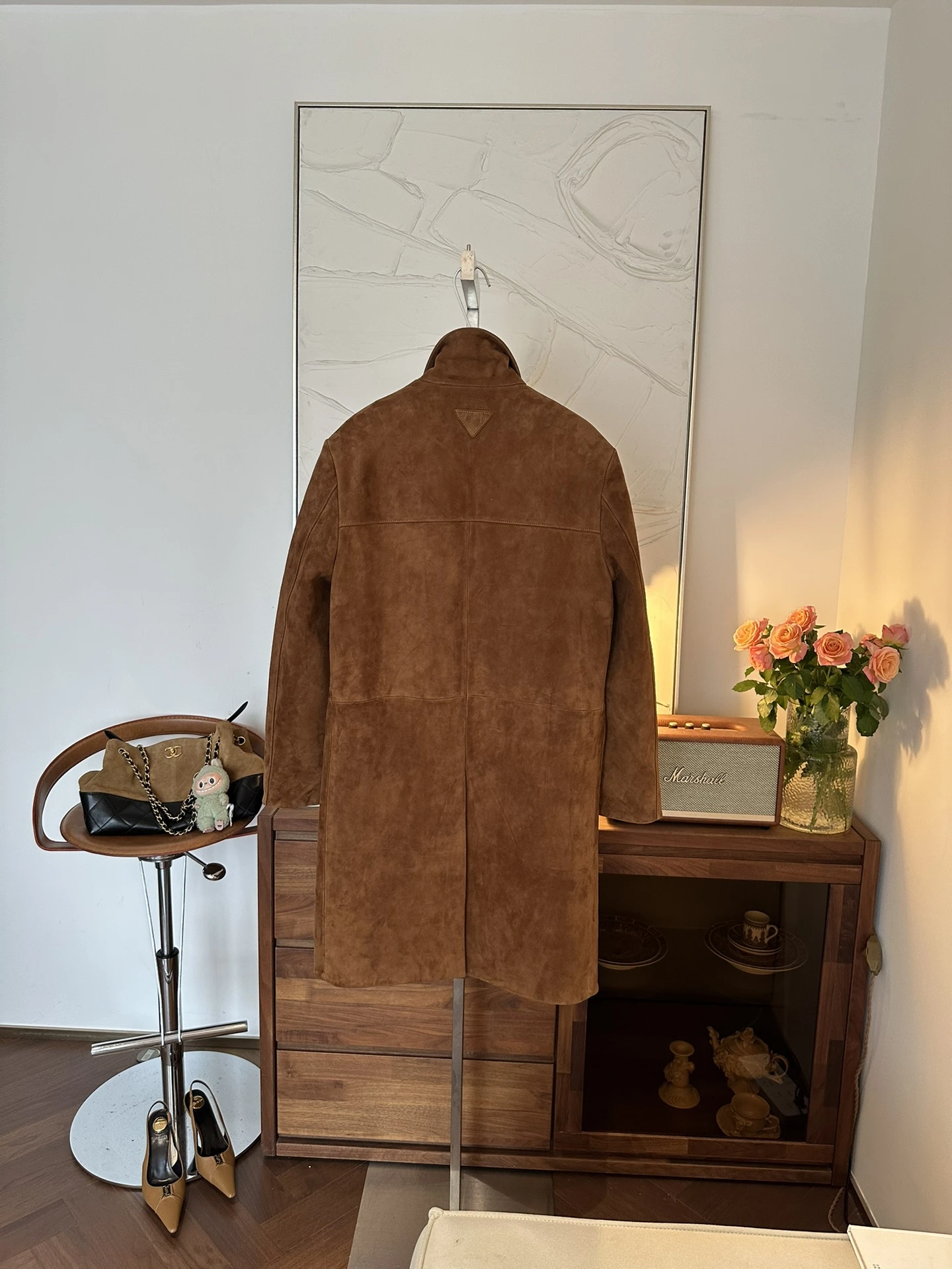 Элегантное женское пальто от Prada, выполненное из роскошной козьей замши насыщенного оттенка. Классический прямой крой с лаконичным воротником и накладными карманами создает изысканный и утонченный образ.