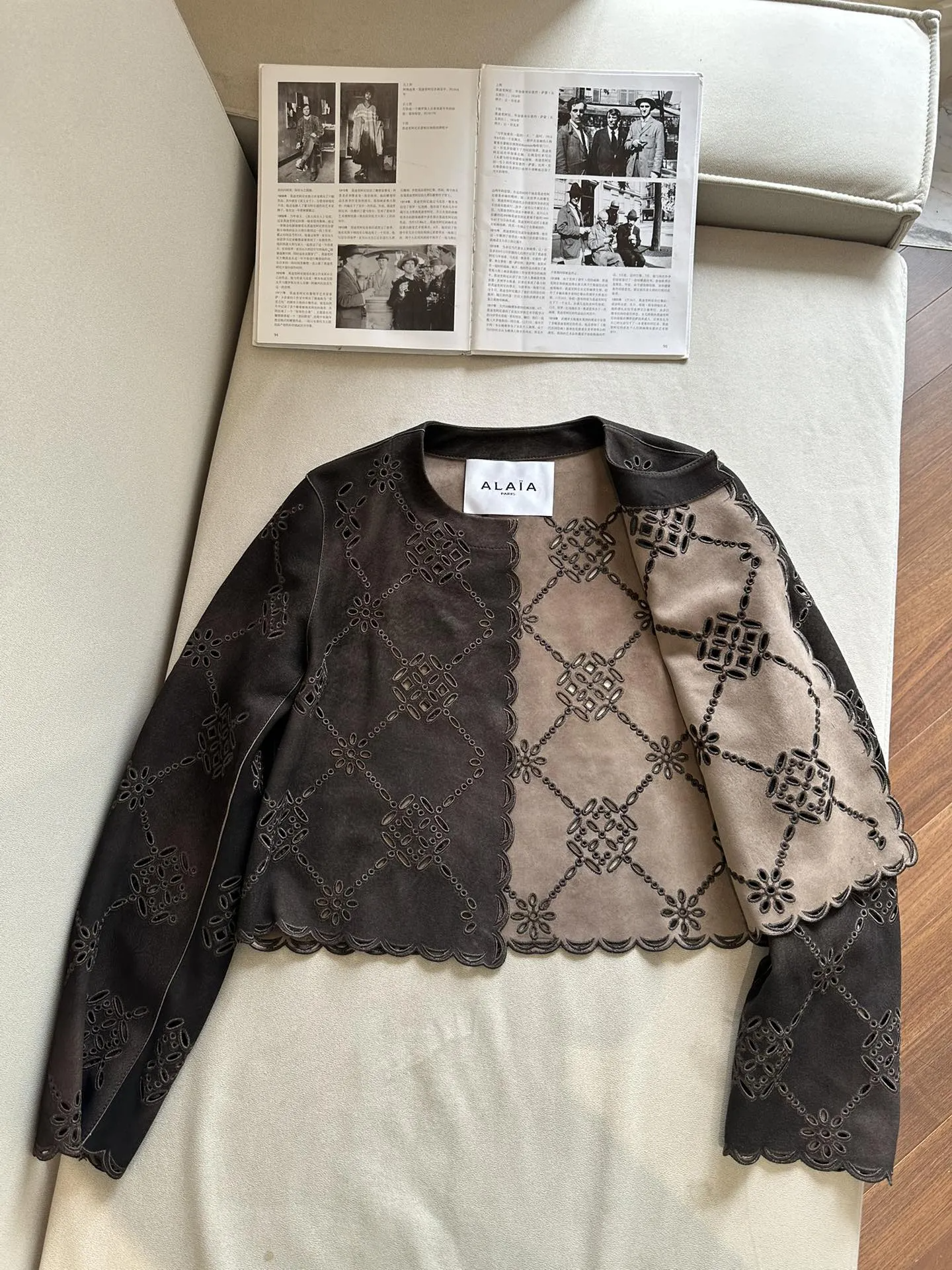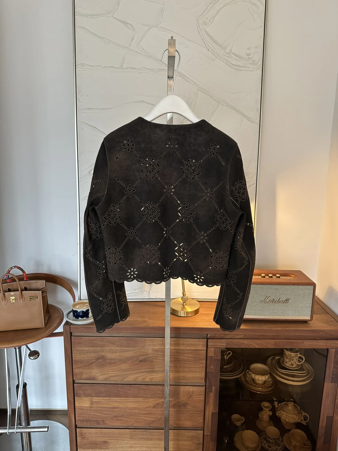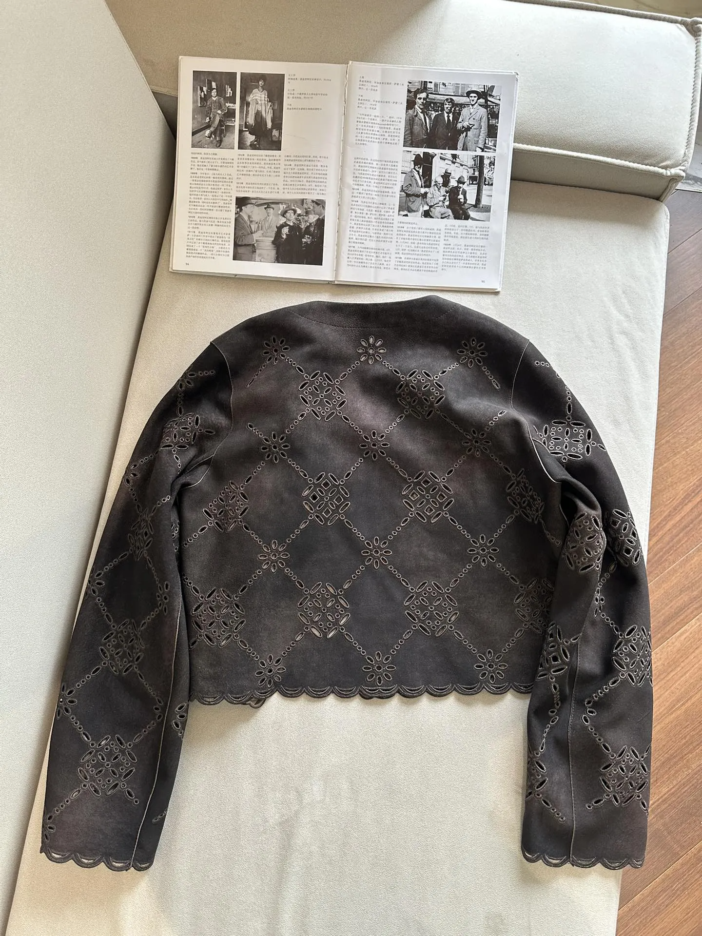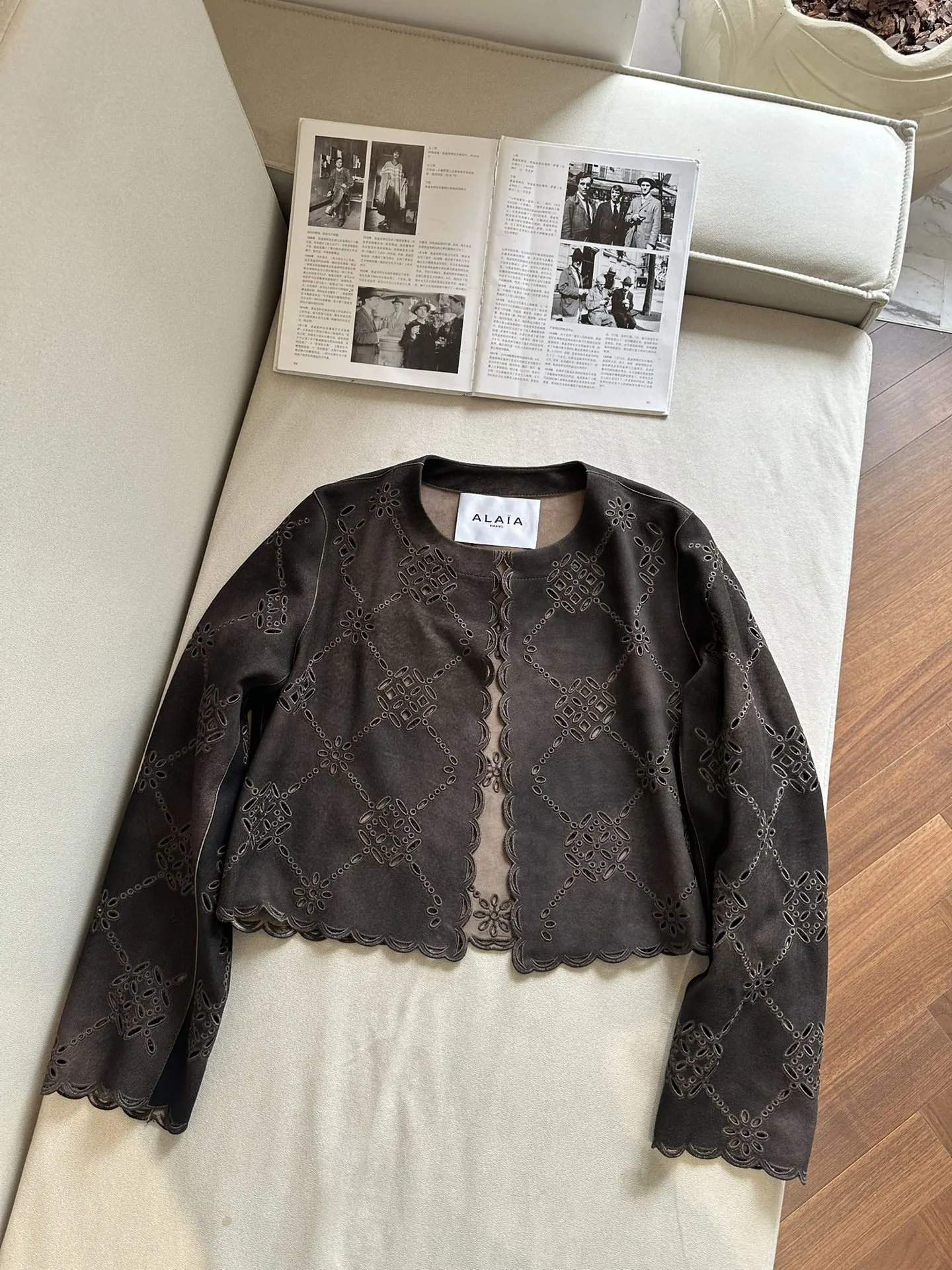 Жакет украшен изысканной лазерной перфорацией, создающей сложный узор, который добавляет изделию художественную изюминку. Края оформлены волнообразным дизайном, подчёркивающим женственность и утонченность.