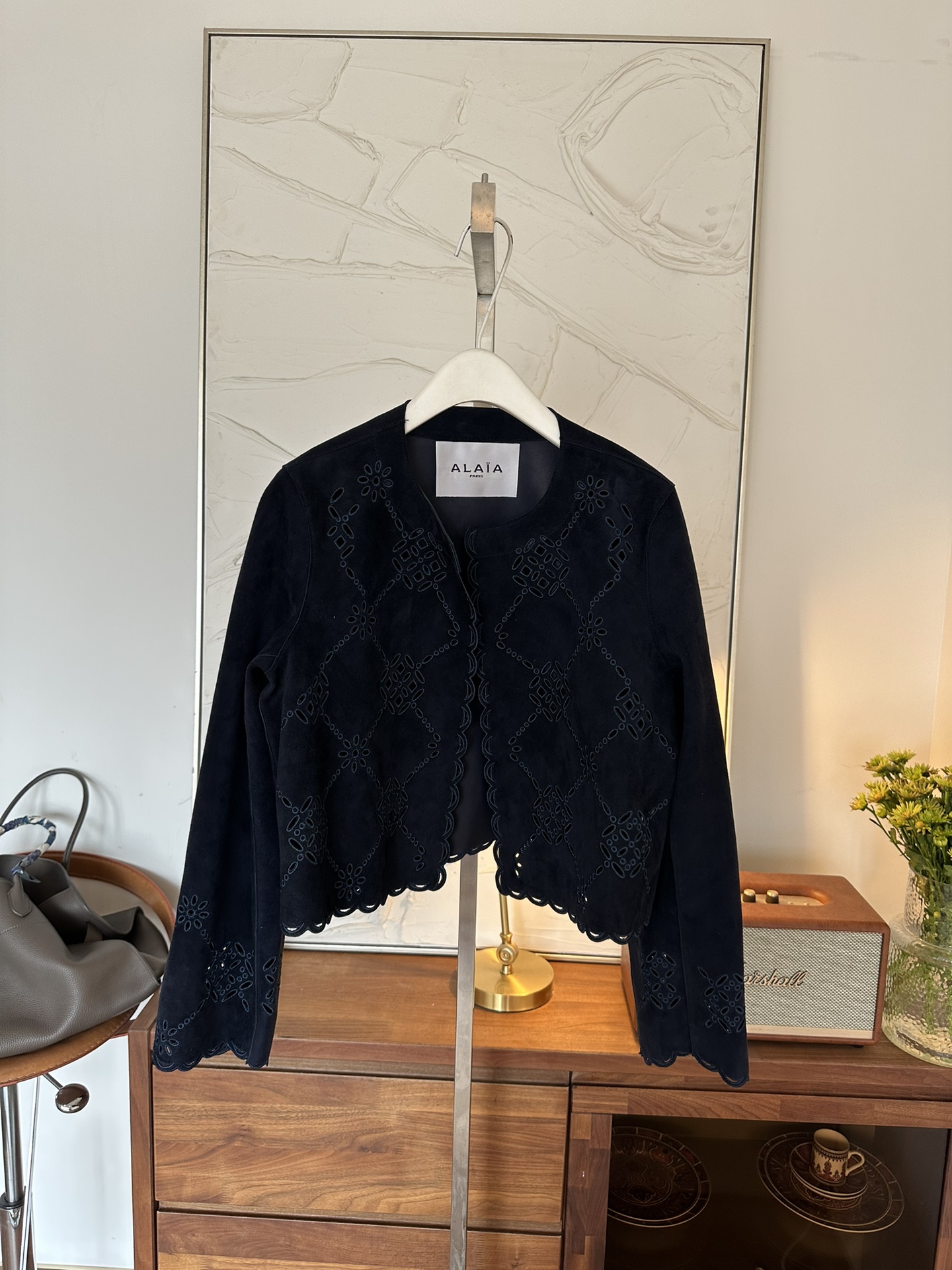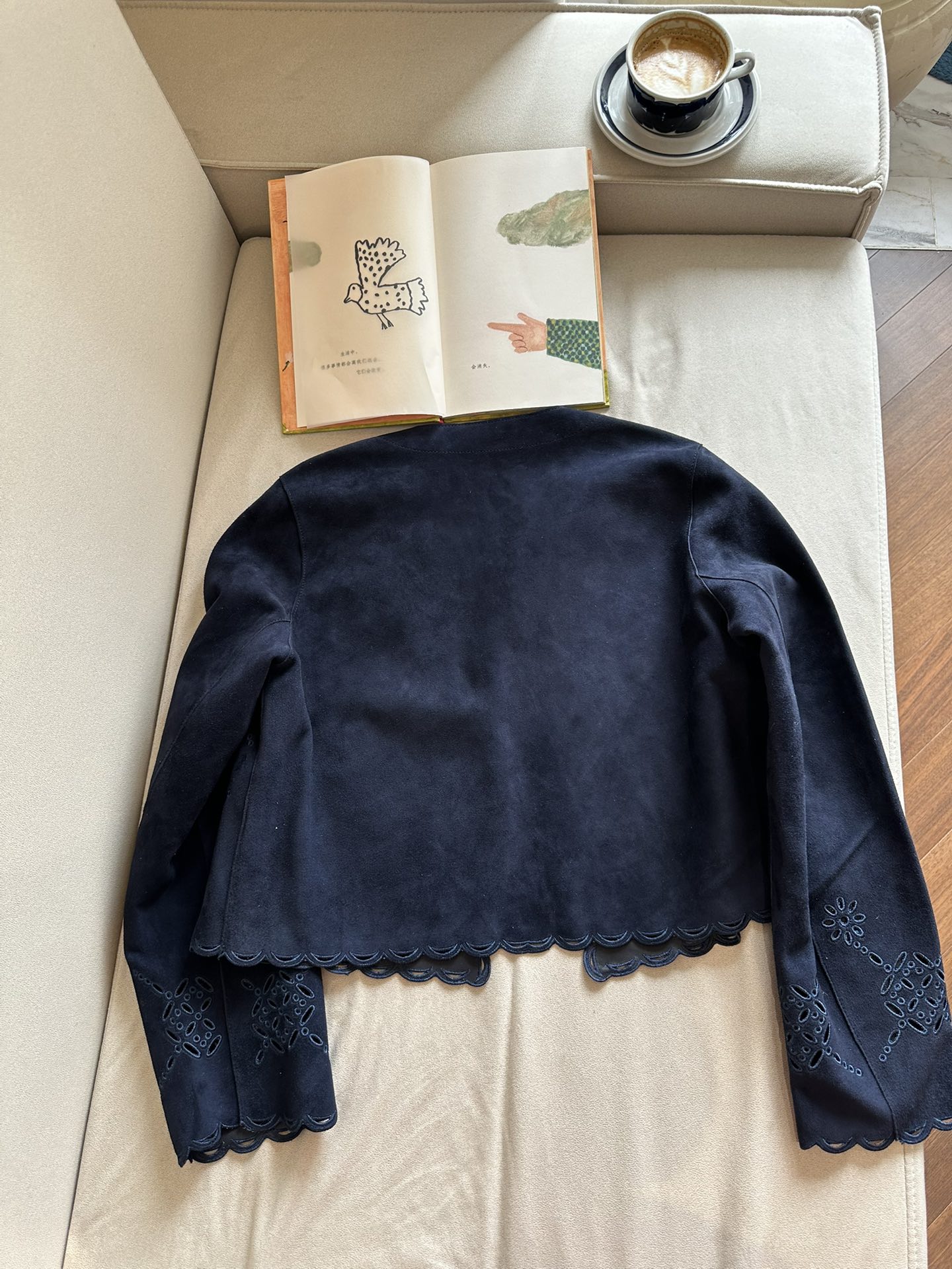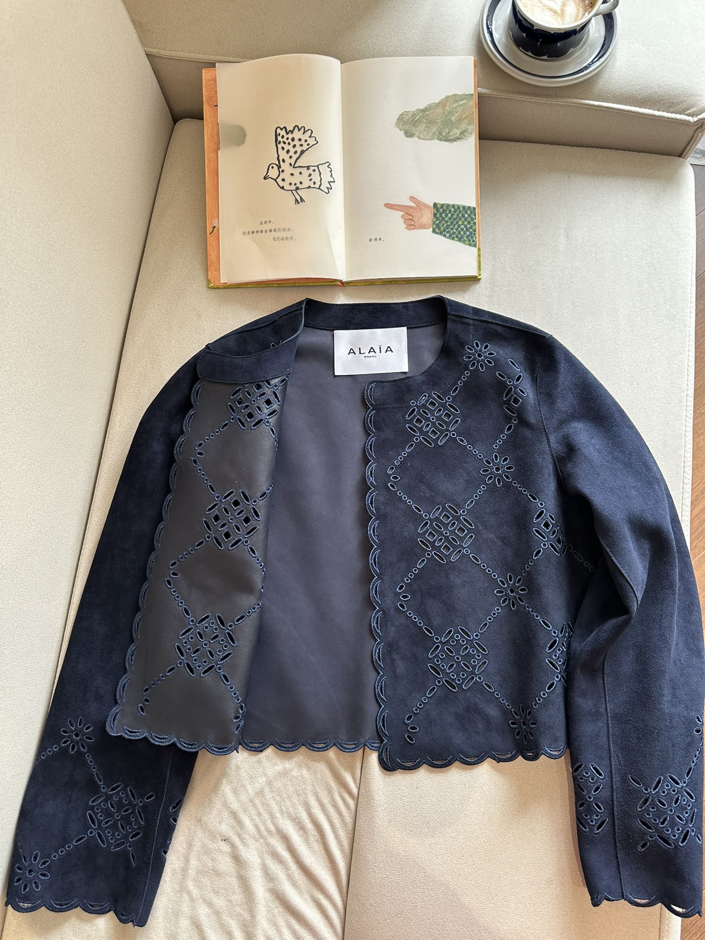 Жакет украшен изысканной лазерной перфорацией, создающей сложный узор, который добавляет изделию художественную изюминку. Края оформлены волнообразным дизайном, подчёркивающим женственность и утонченность.