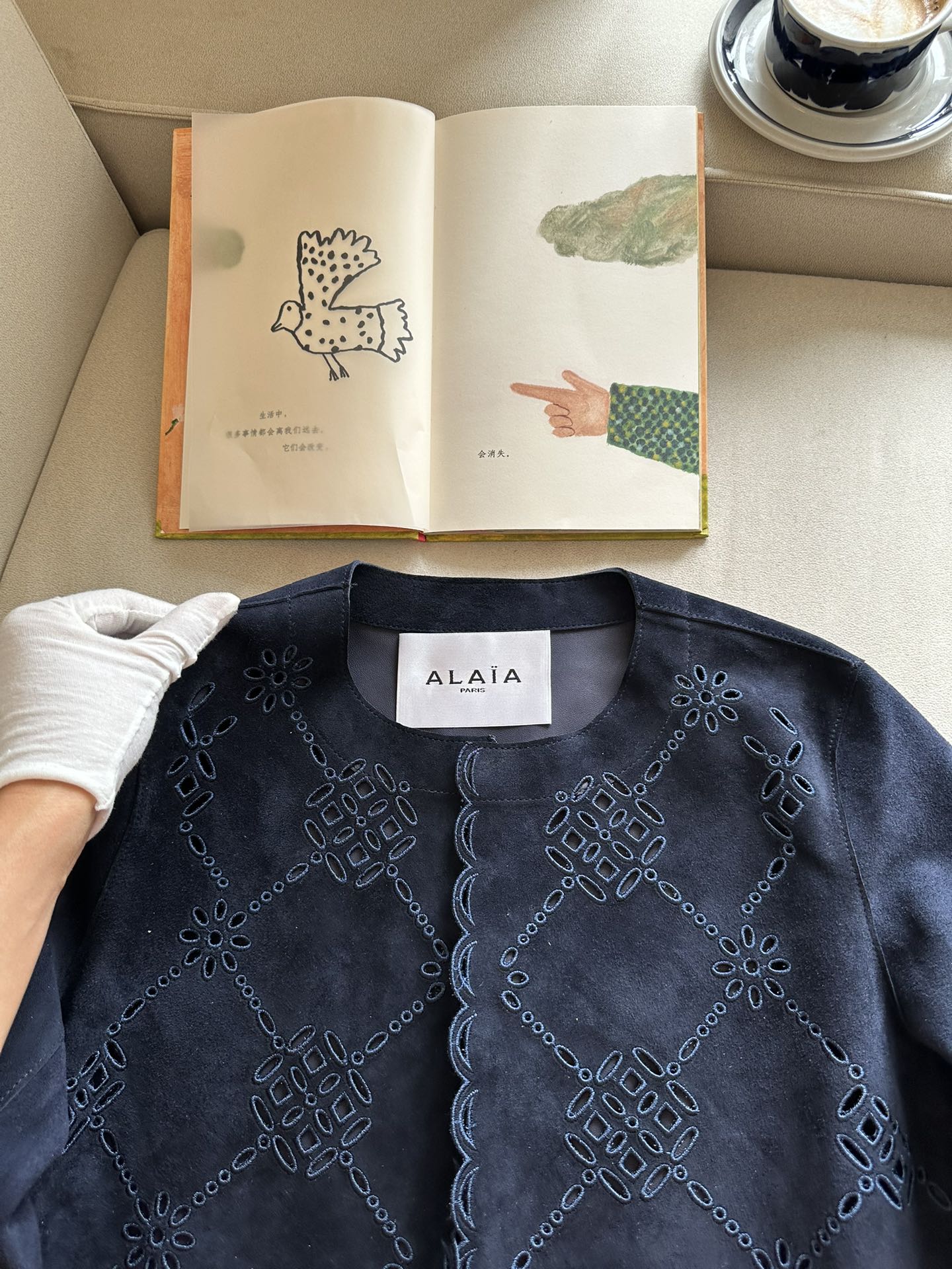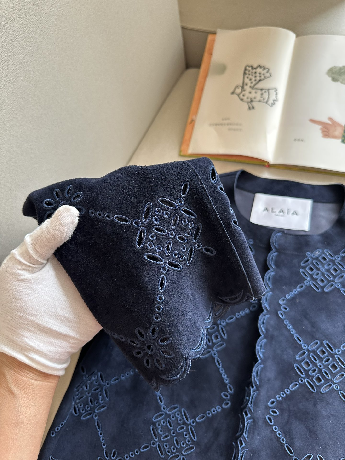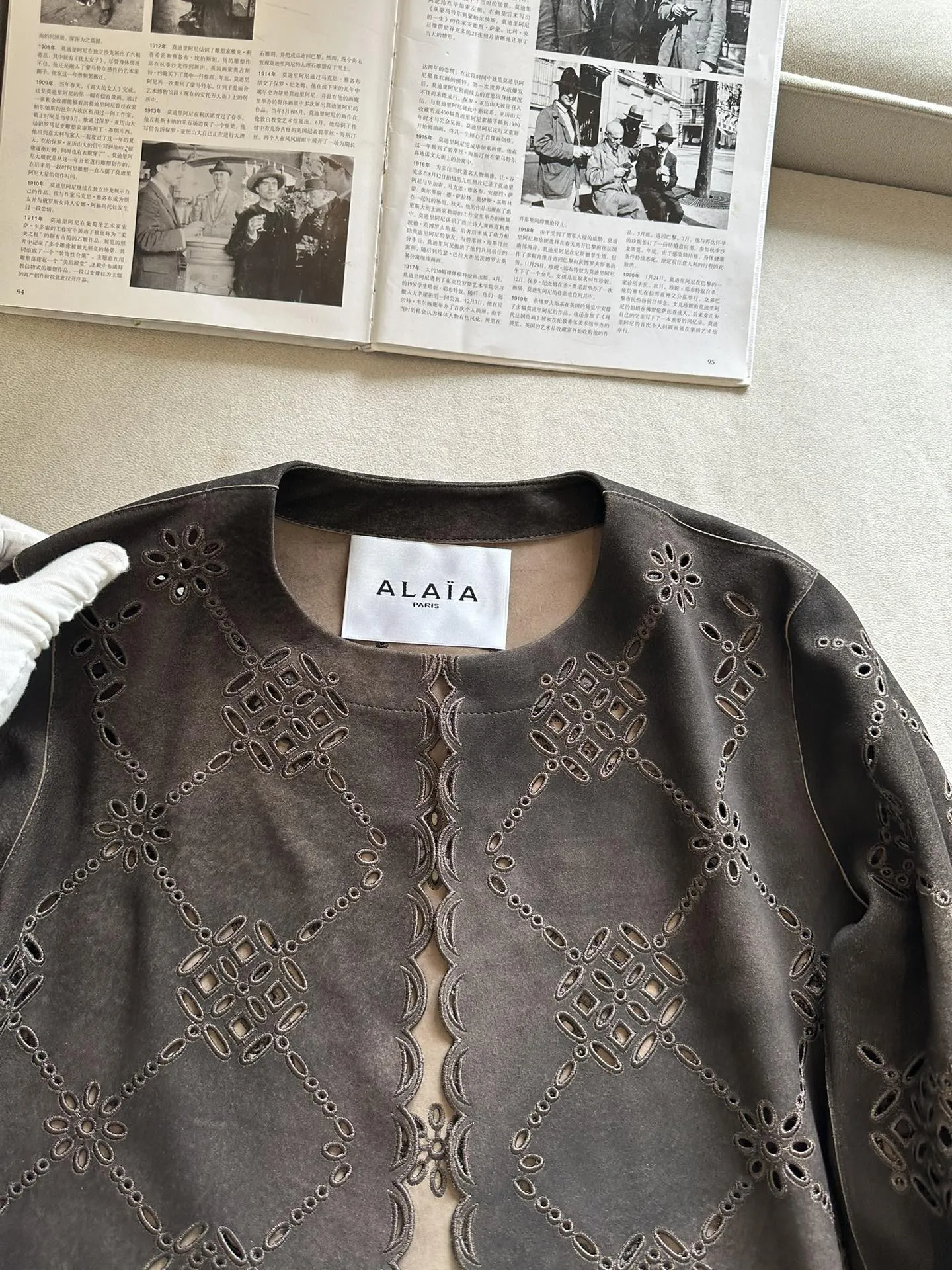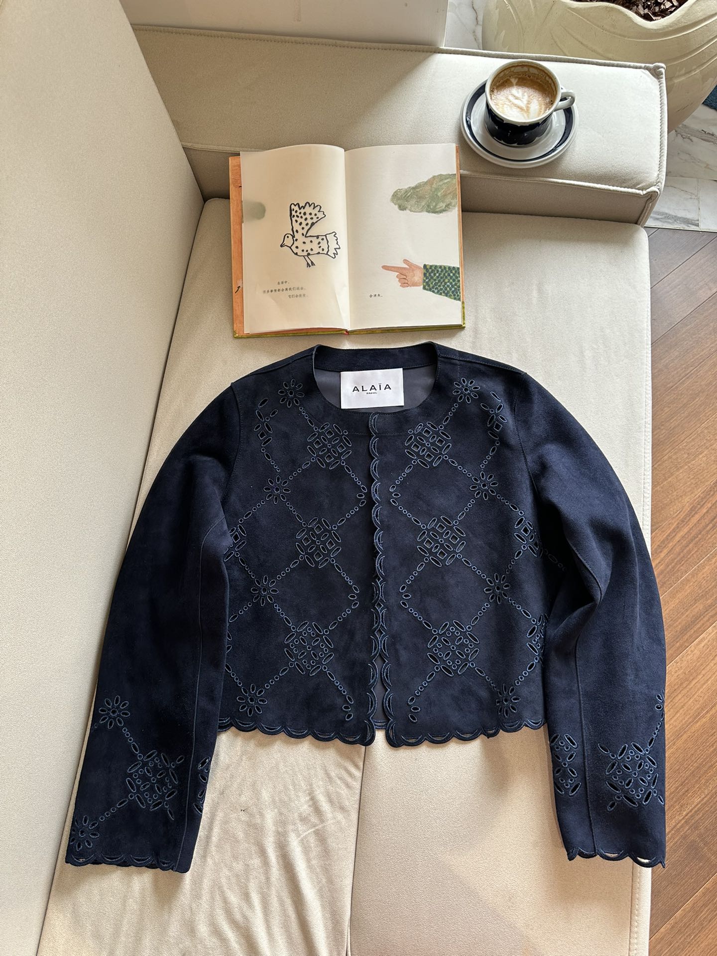 Жакет украшен изысканной лазерной перфорацией, создающей сложный узор, который добавляет изделию художественную изюминку. Края оформлены волнообразным дизайном, подчёркивающим женственность и утонченность.