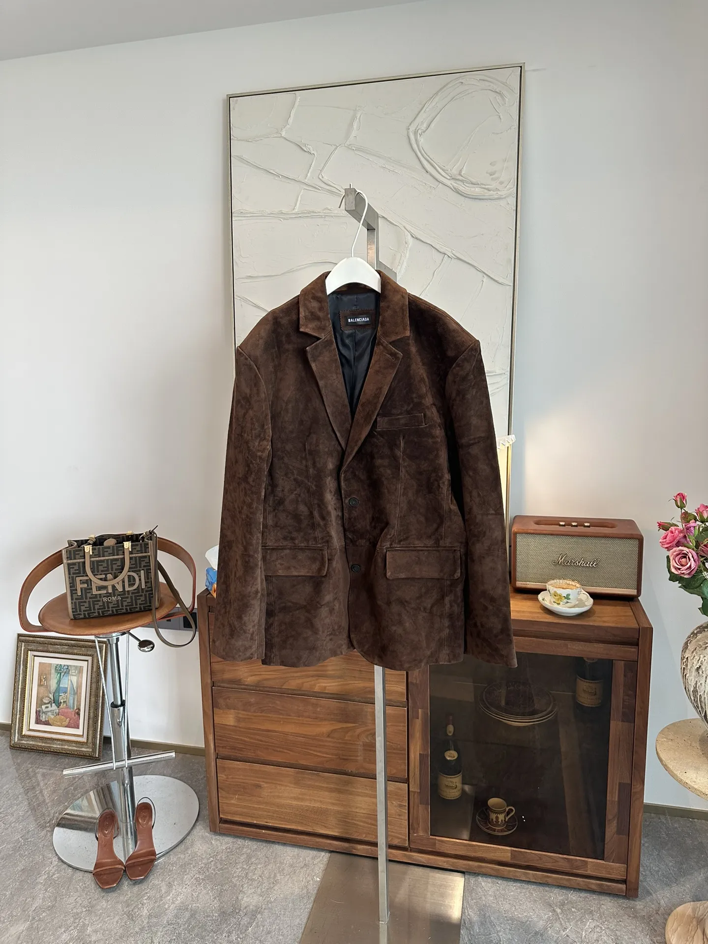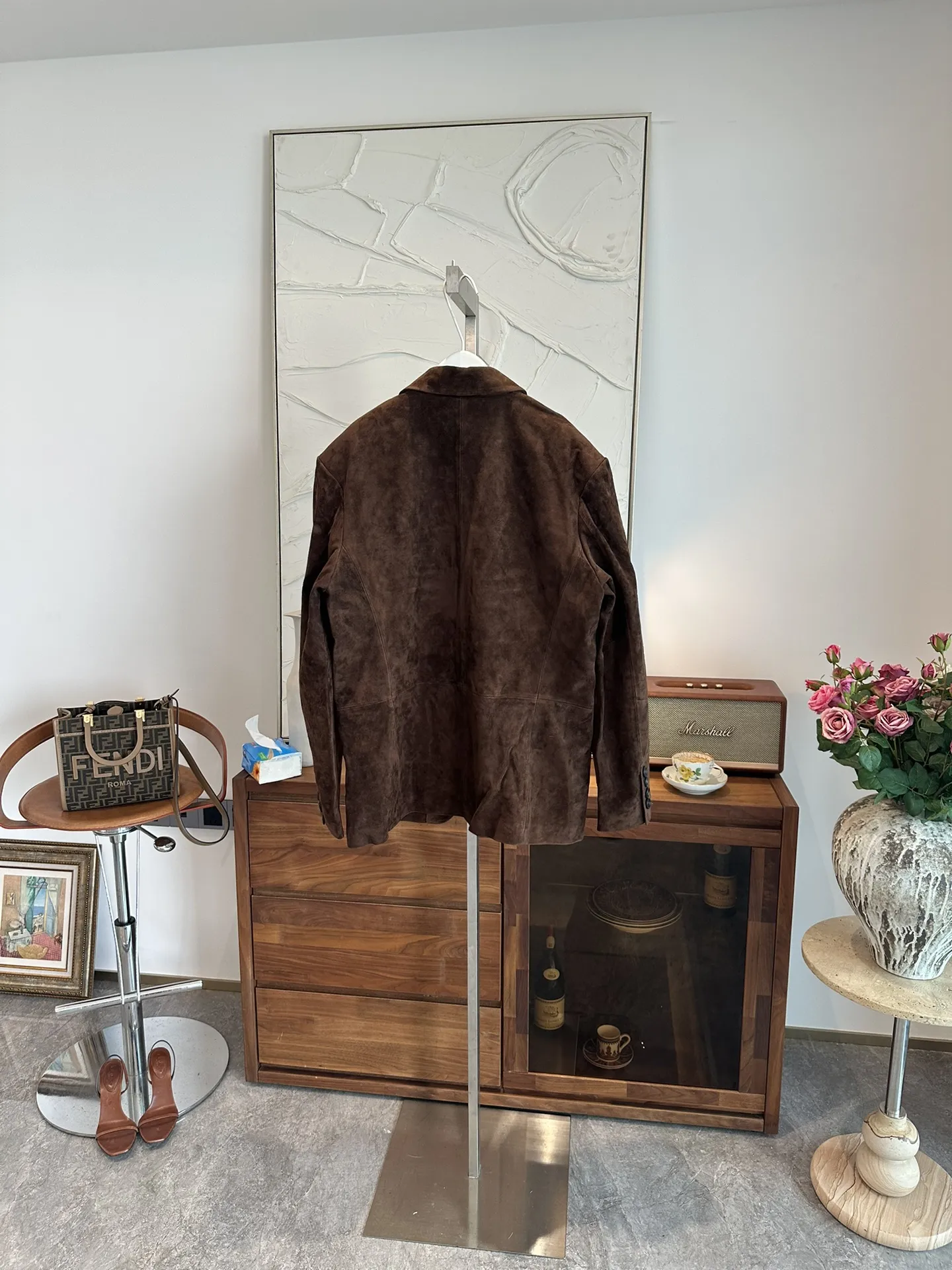 Классический крой с лацканами и застёжкой на пуговицы подчёркивает изысканность и стиль, а мягкая текстура замши обеспечивает комфорт и приятные тактильные ощущения.