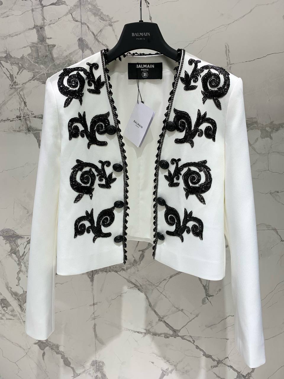 Создайте элегантный и утончённый образ с роскошным женским жакетом от BALMAIN. Это изделие выполнено из плотной белоснежной ткани и украшено эксклюзивной чёрной вышивкой ручной работы в виде изысканных барочных орнаментов. Акцентная отделка по краю жакета дополнена декоративными пуговицами, которые придают модели аристократичный шарм и подчеркивают внимание бренда к деталям.