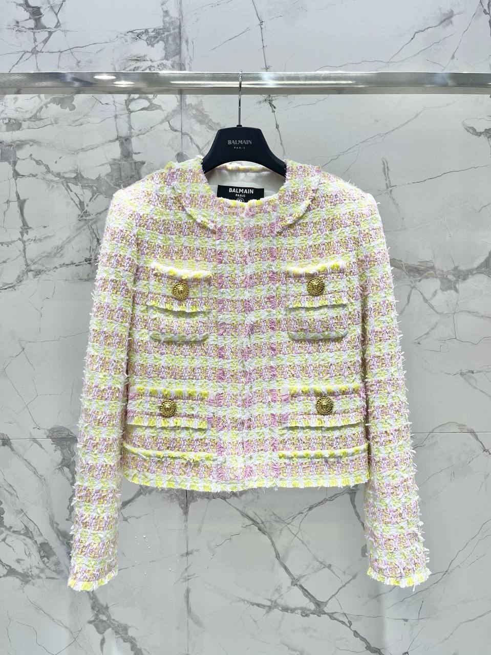 Элегантный женский жакет BALMAIN выполнен из текстурированного твида букле в нежной пастельной клетке. Укороченный силуэт с круглым вырезом, фрагментными бахромчатыми краями и декоративными карманами создаёт современный, в то же время классический образ в духе легендарного парижского дома мод.