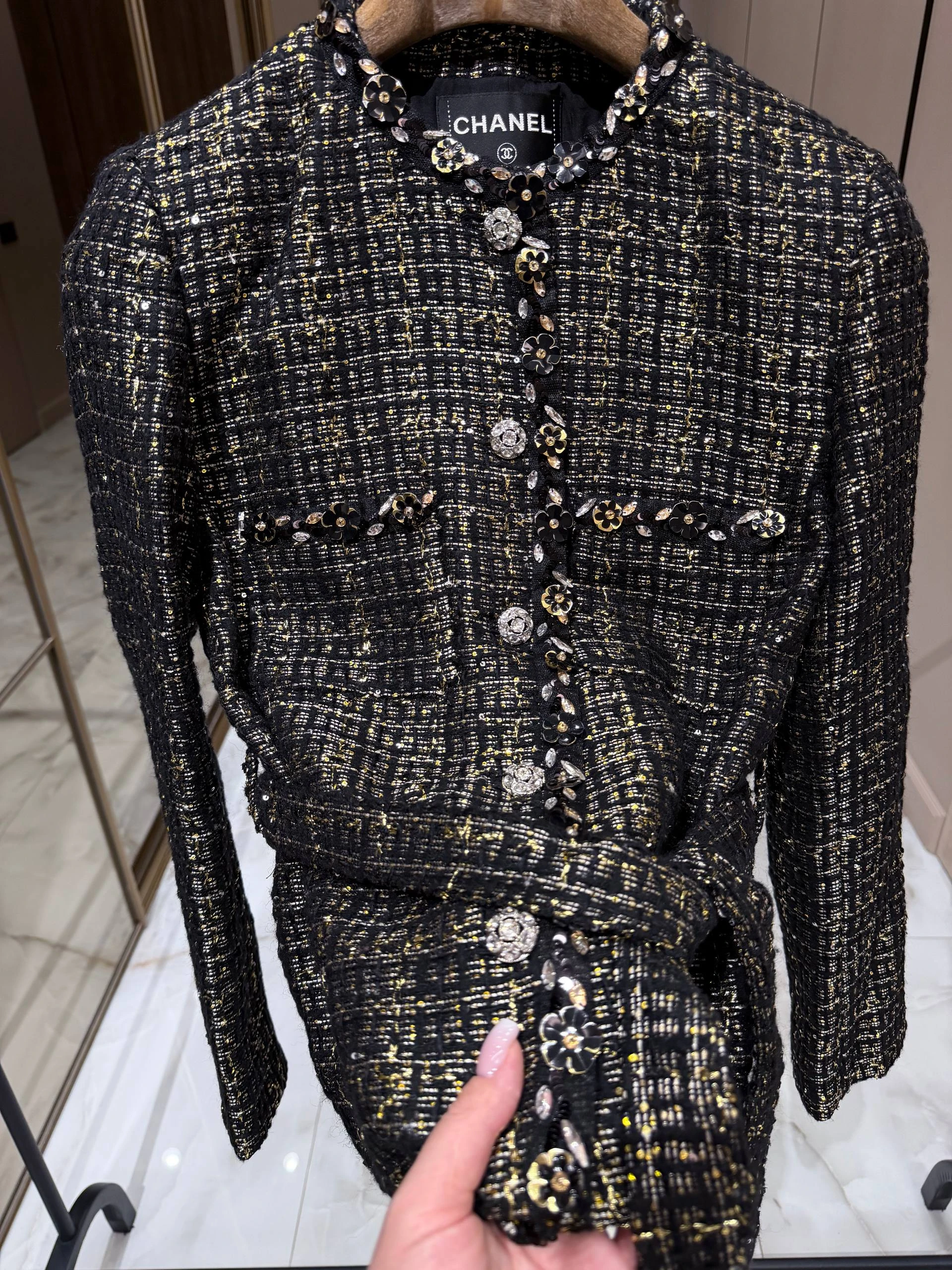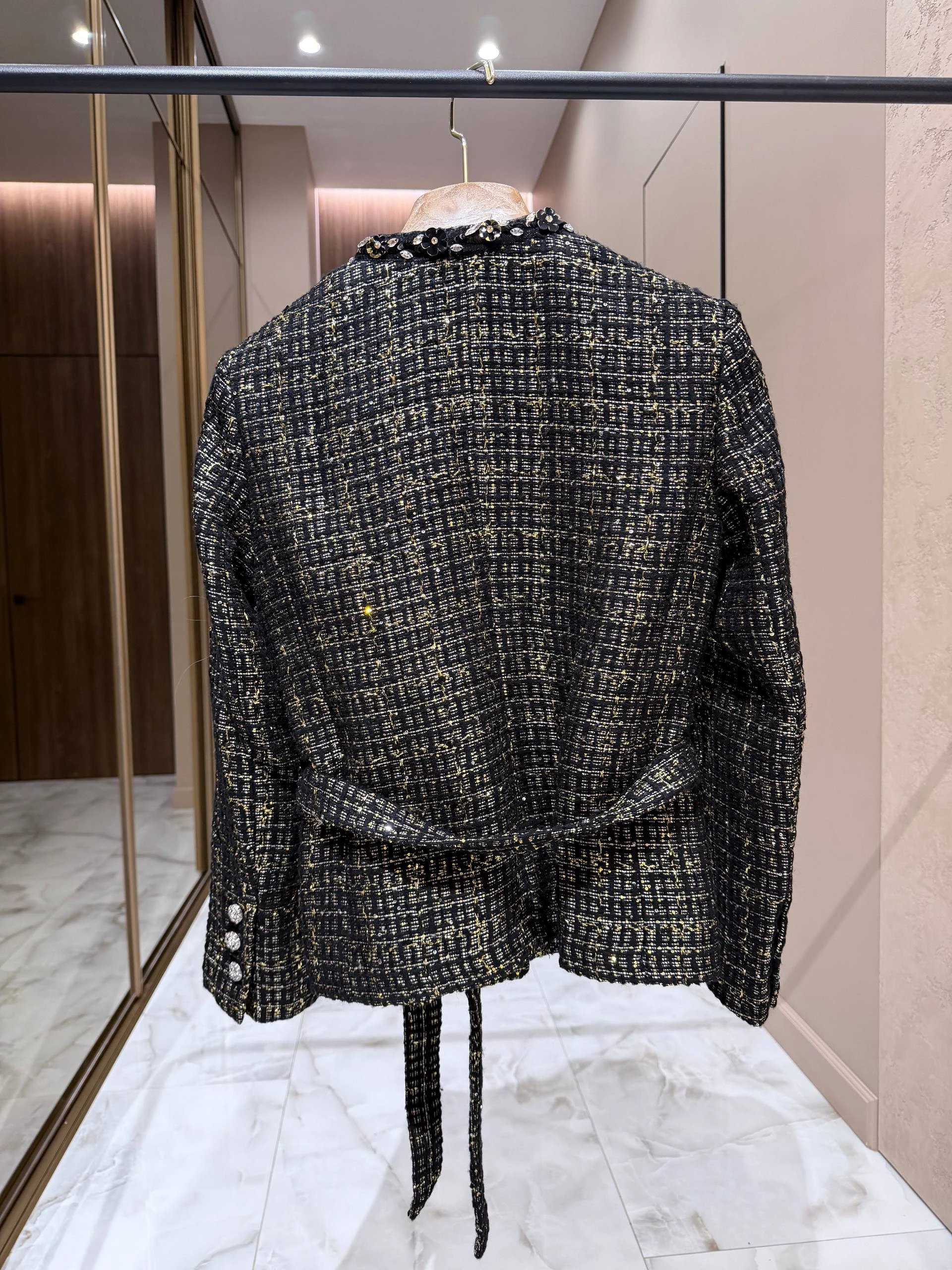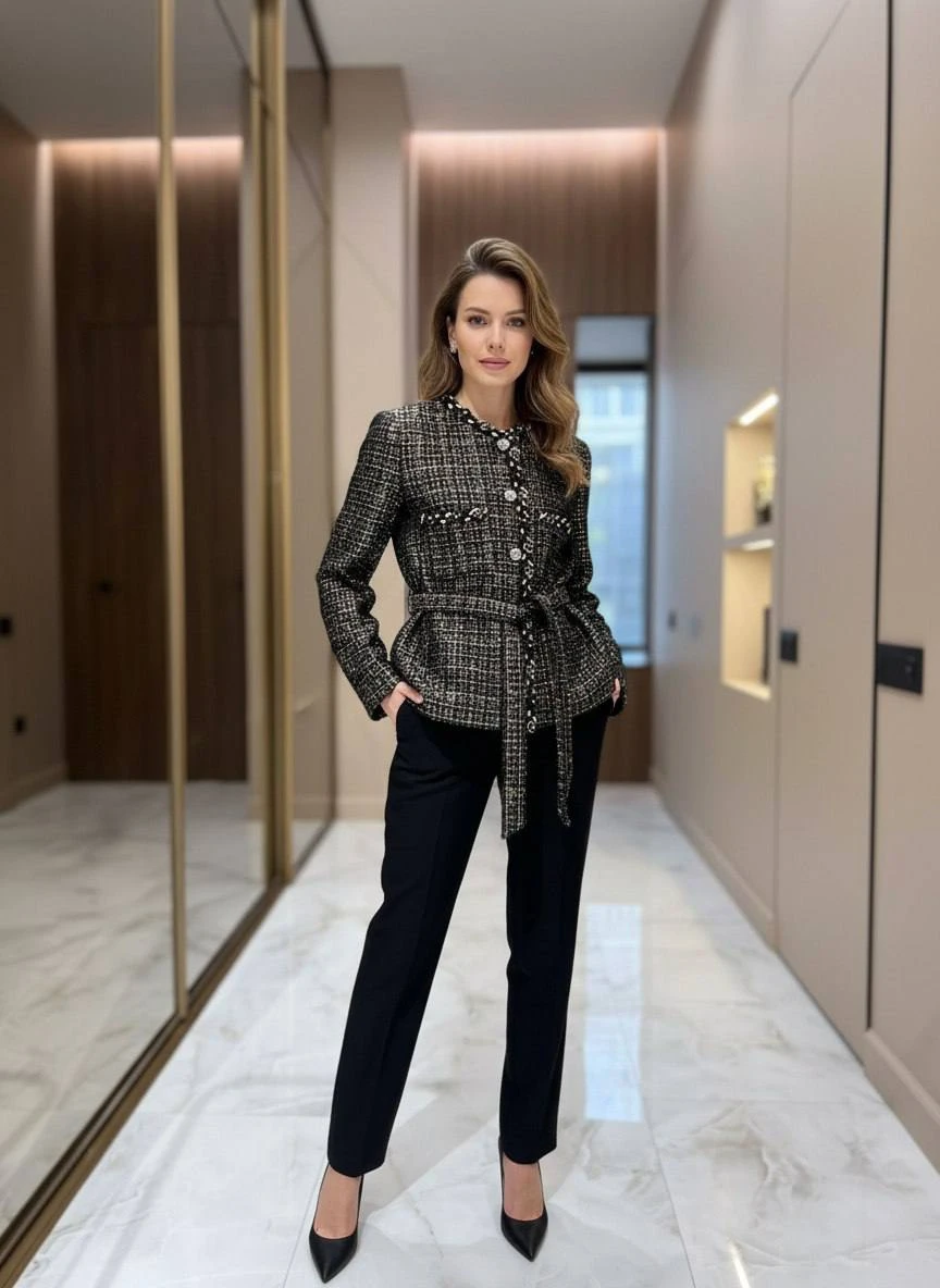 Жакет выполнен из высококачественного твида с тонкой мерцающей нитью, придающей изделию благородный блеск. Прямой женственный силуэт заканчивается чуть ниже талии, что подчёркивает линию корпуса, а съёмный или фиксированный пояс из той же ткани позволяет варьировать посадку — от свободной до более приталенной. Отложной круглый воротник и аккуратная планка спереди дополнены декоративными пуговицами, инкрустированными кристаллами и изящной тесьмой по краям, что придаёт жакету характерный шанелевский шарм. Две накладные карманные клапаны спереди добавляют функциональности и завершённости образу. Внутренняя подкладка обеспечит комфорт при носке и аккуратную посадку поверх блуз или тонких джемперов.