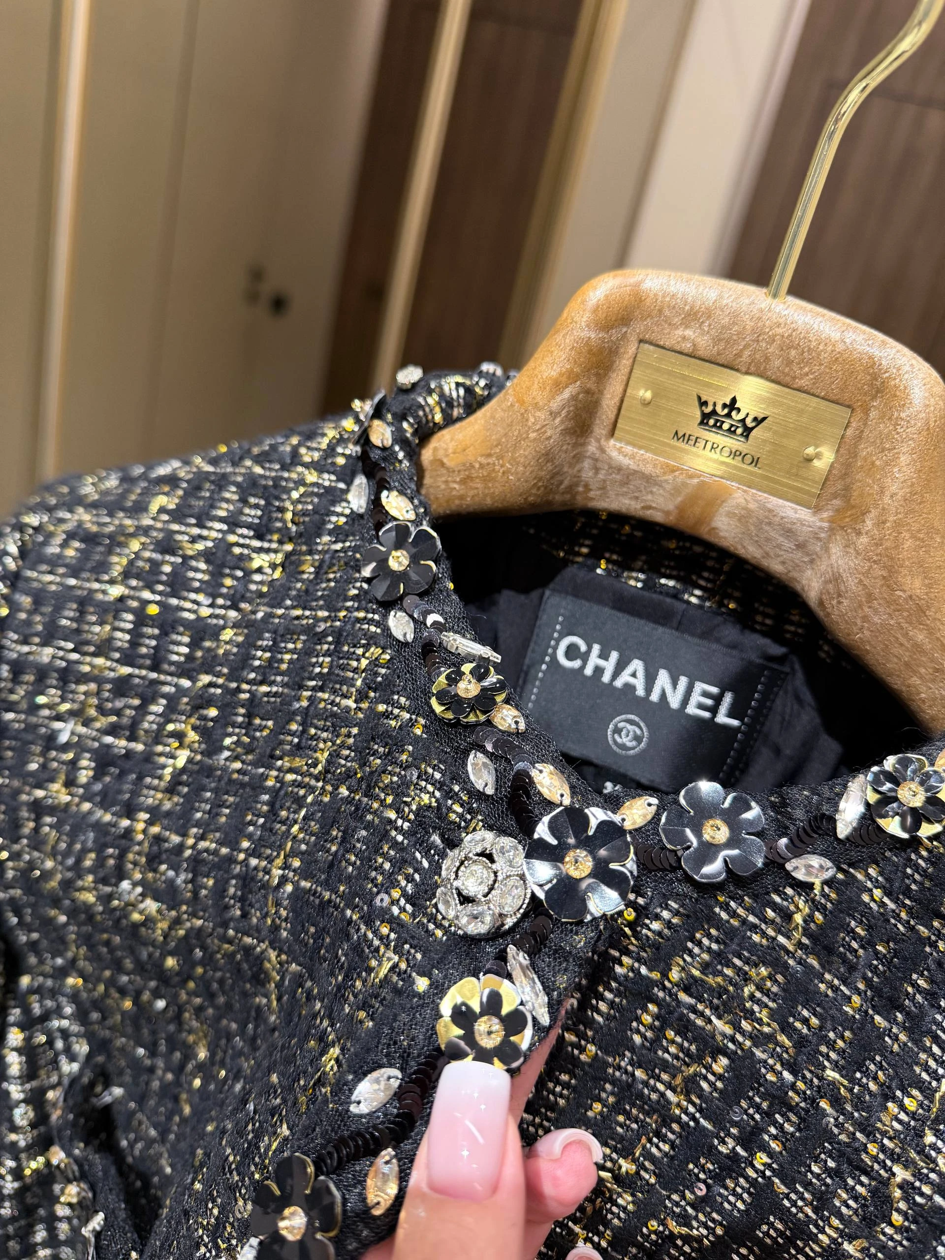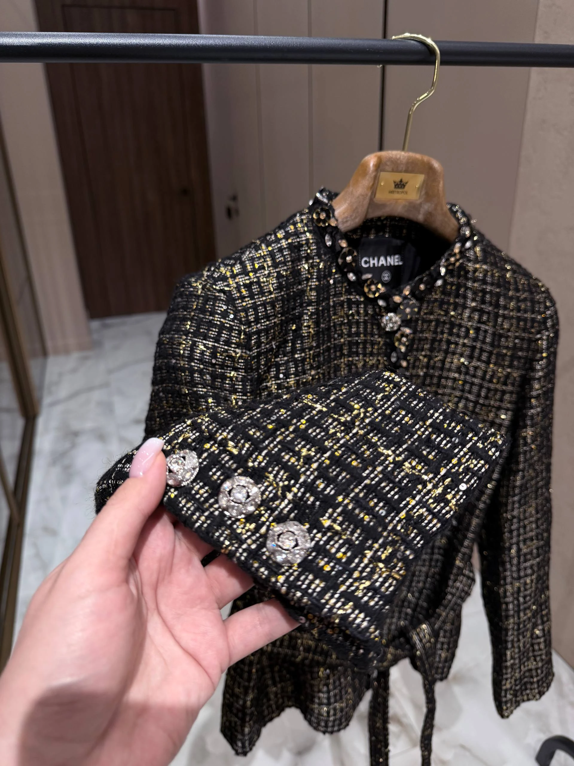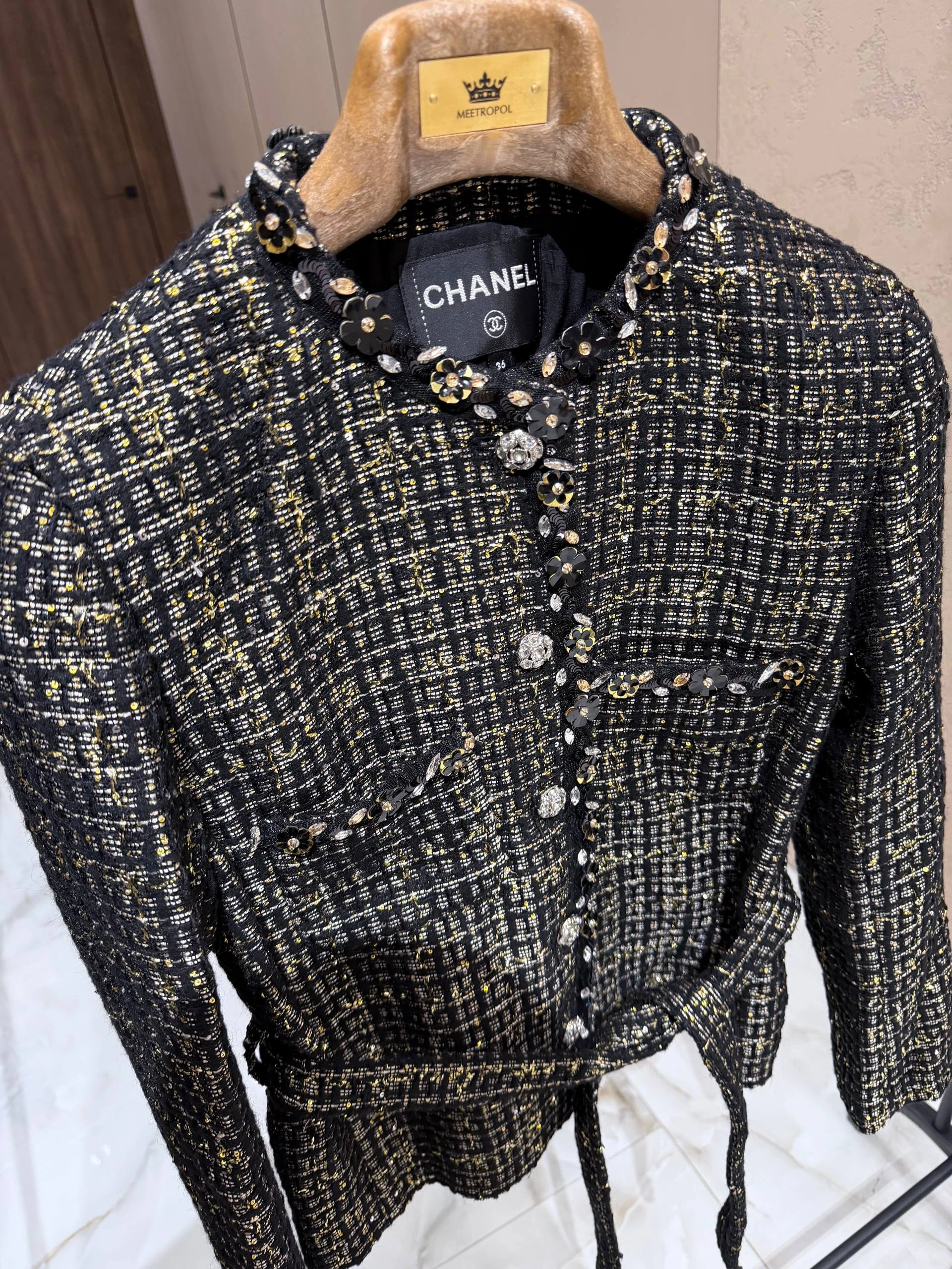 Жакет выполнен из высококачественного твида с тонкой мерцающей нитью, придающей изделию благородный блеск. Прямой женственный силуэт заканчивается чуть ниже талии, что подчёркивает линию корпуса, а съёмный или фиксированный пояс из той же ткани позволяет варьировать посадку — от свободной до более приталенной. Отложной круглый воротник и аккуратная планка спереди дополнены декоративными пуговицами, инкрустированными кристаллами и изящной тесьмой по краям, что придаёт жакету характерный шанелевский шарм. Две накладные карманные клапаны спереди добавляют функциональности и завершённости образу. Внутренняя подкладка обеспечит комфорт при носке и аккуратную посадку поверх блуз или тонких джемперов.