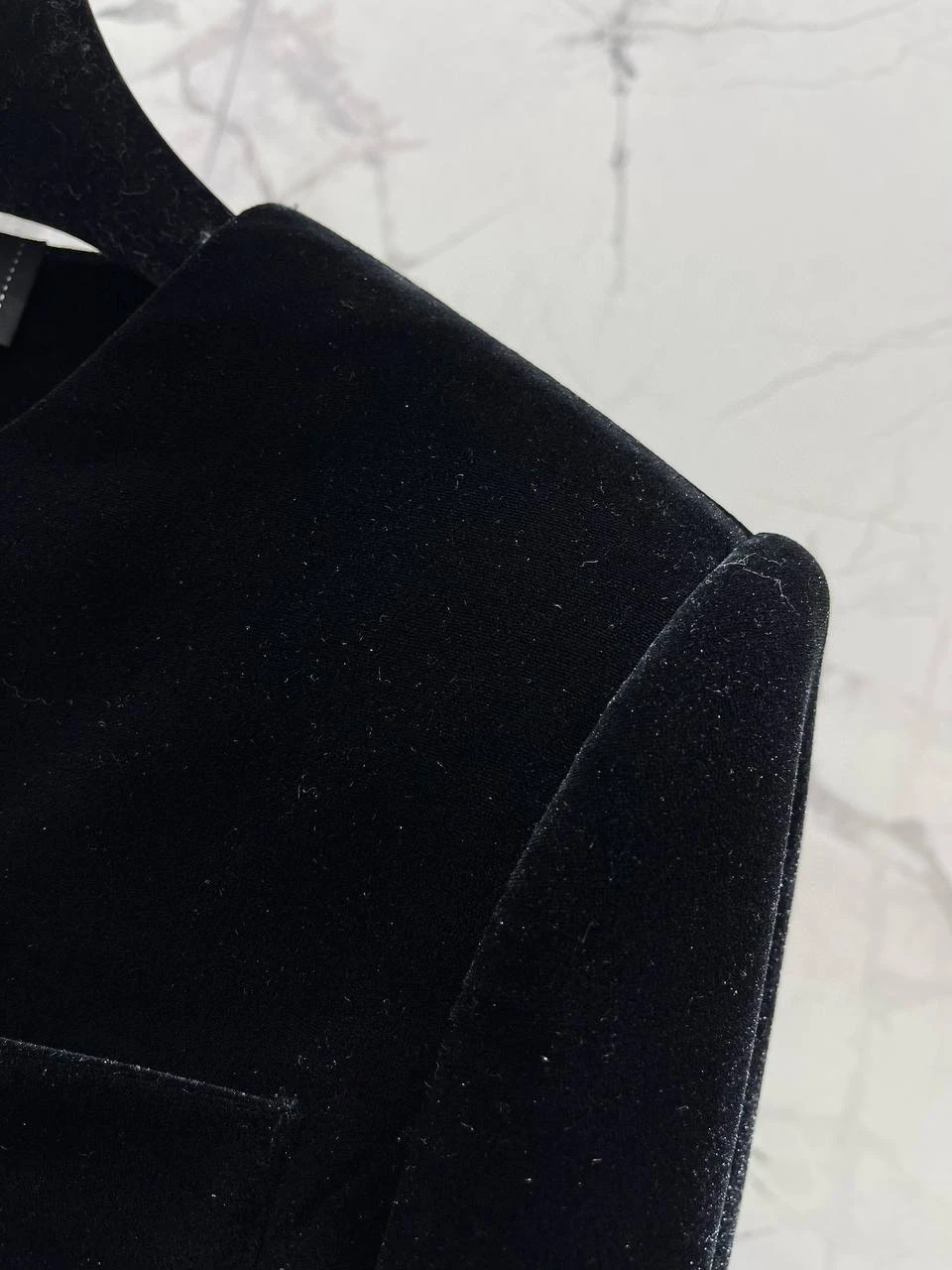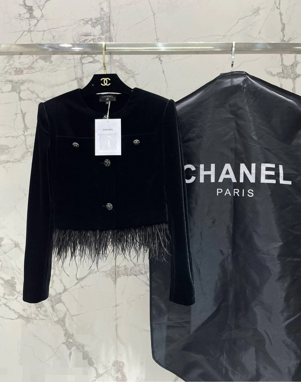 Изысканный укороченный жакет CHANEL в глубокoм черном бархатном исполнении с уникальной перьевой отделкой по нижнему краю. Минималистичный воротник‑стойка, аккуратные накладные карманы и декорированные металлические пуговицы создают утончённый вечерний образ с фирменной французской элегантностью.
