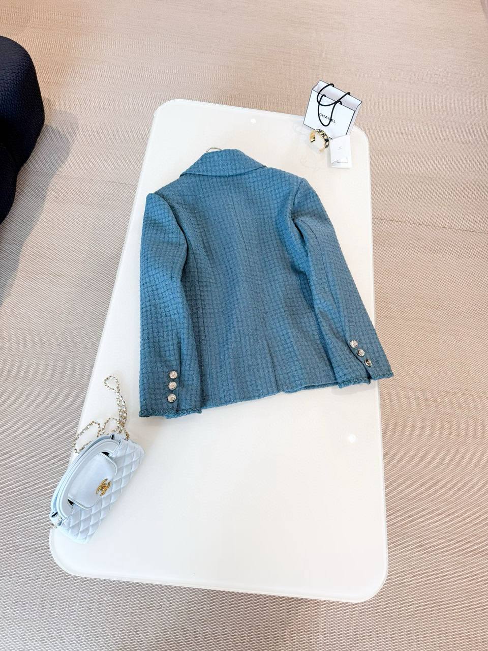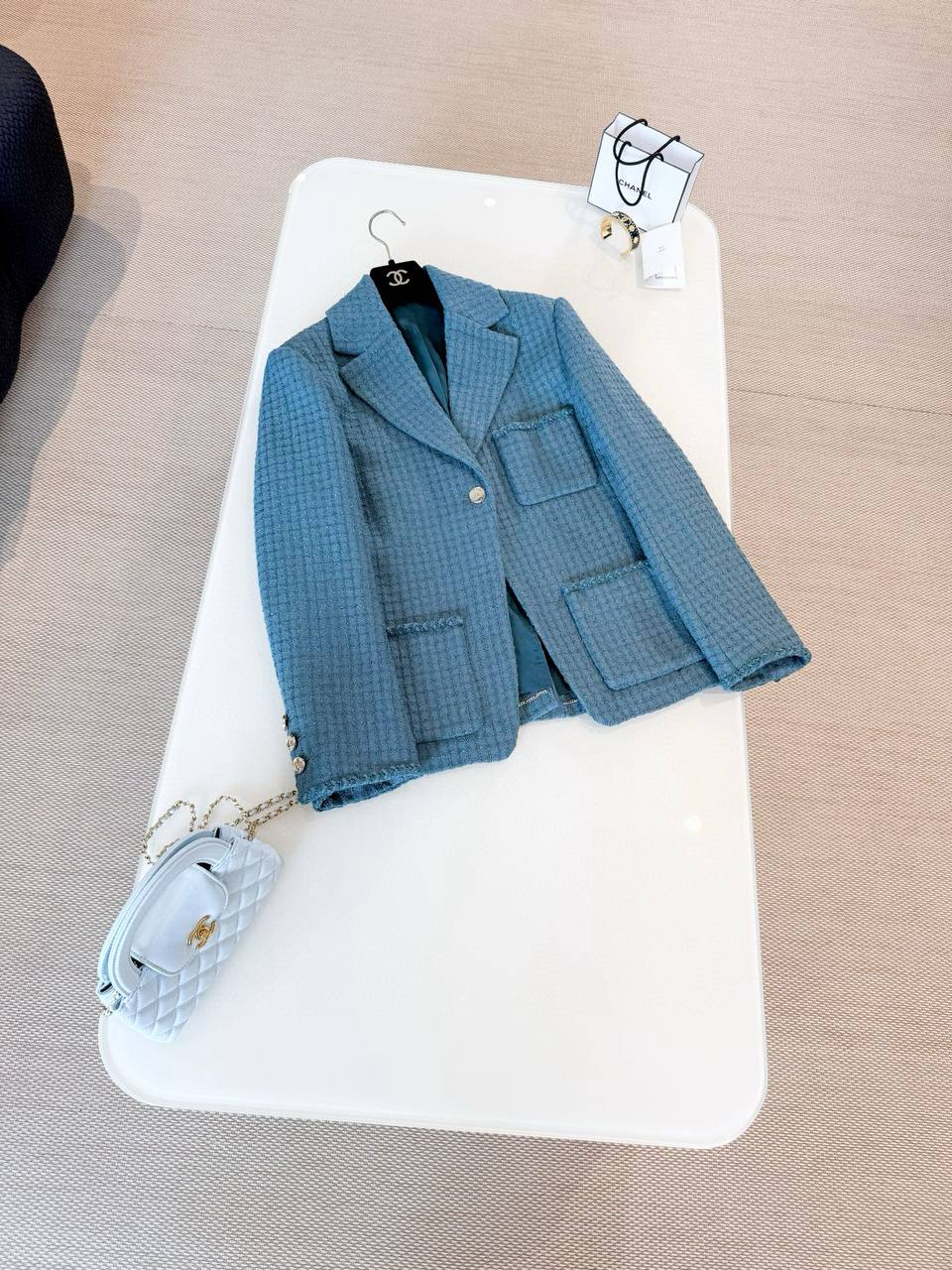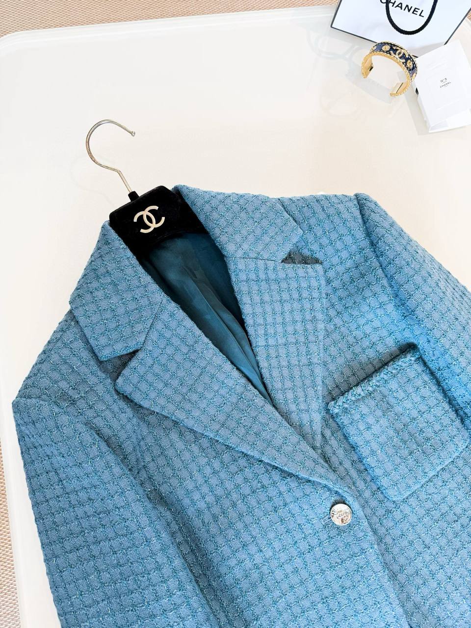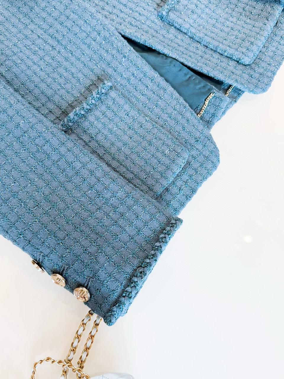 Откройте для себя элегантность вне времени с женским твидовым жакетом CHANEL цвета небесно-голубого. Эта модель выполнена из фирменного плотного твида, отличающегося характерной фактурой и мягким блеском, который отражает роскошь и утонченность стиля CHANEL. Жакет имеет классический силуэт с прямой посадкой, английским воротником и длинными рукавами. На передней части изделия — два вместительных накладных кармана, гармонирующих с изысканными линиями кроя. Элементы ручной отделки подчеркивают тщательность исполнения и неизменное качество дома CHANEL.