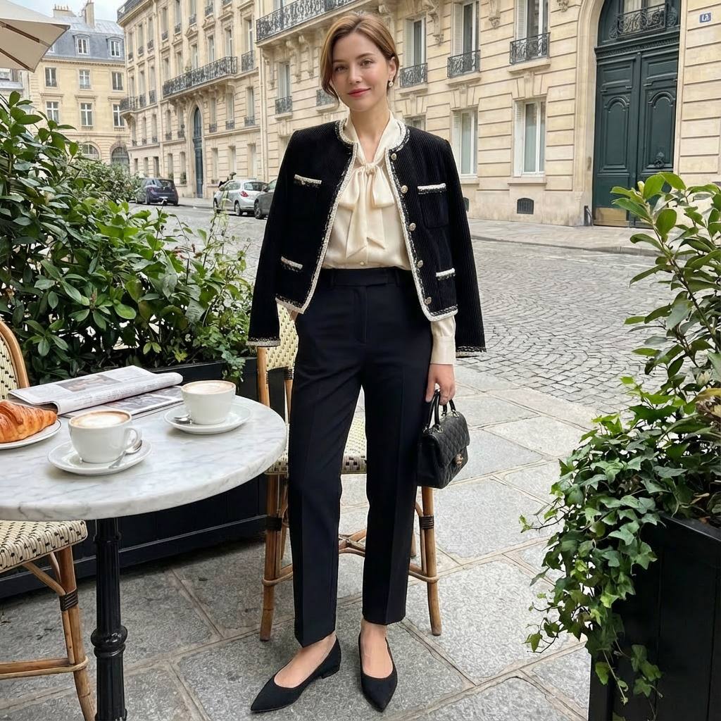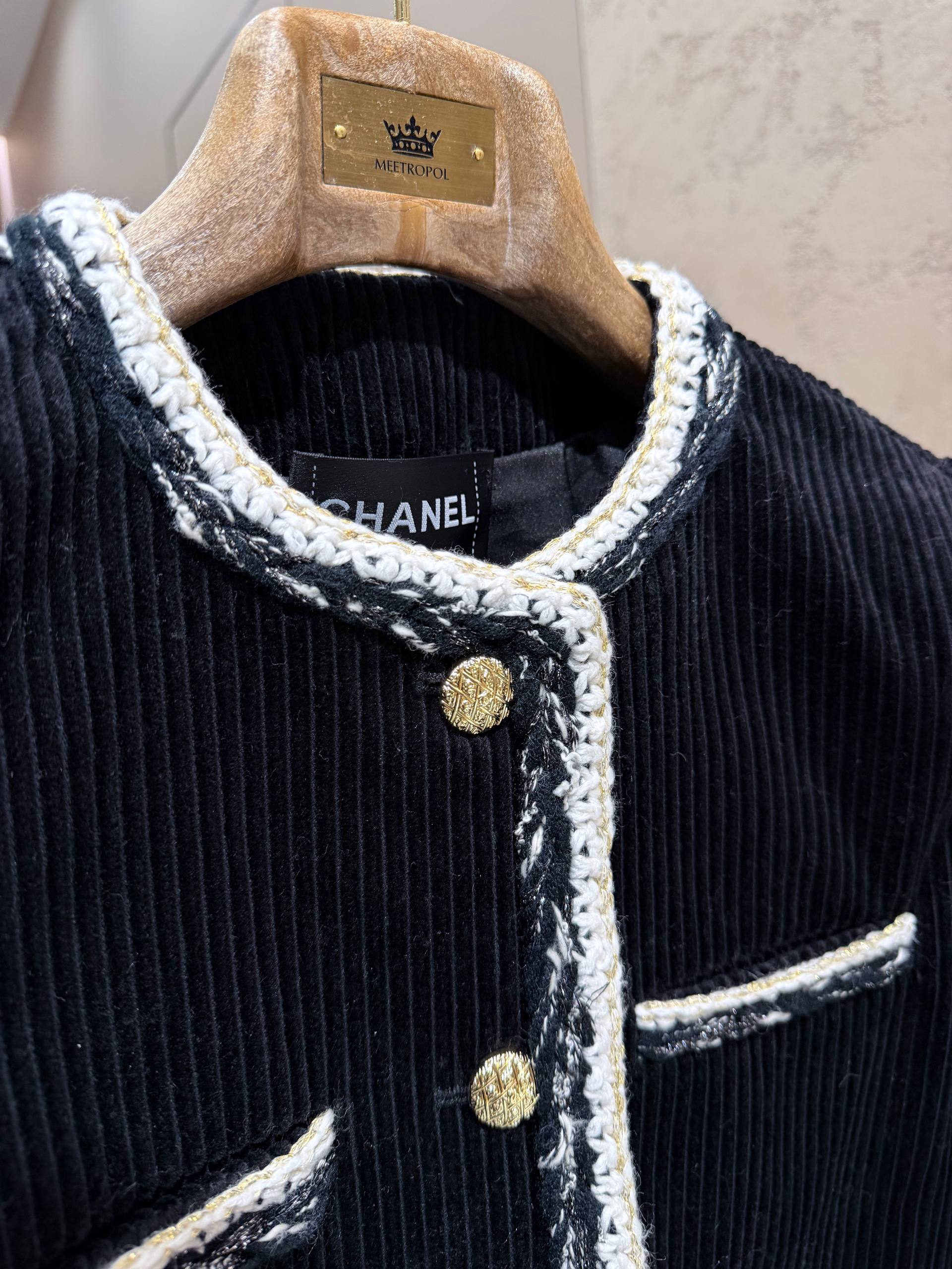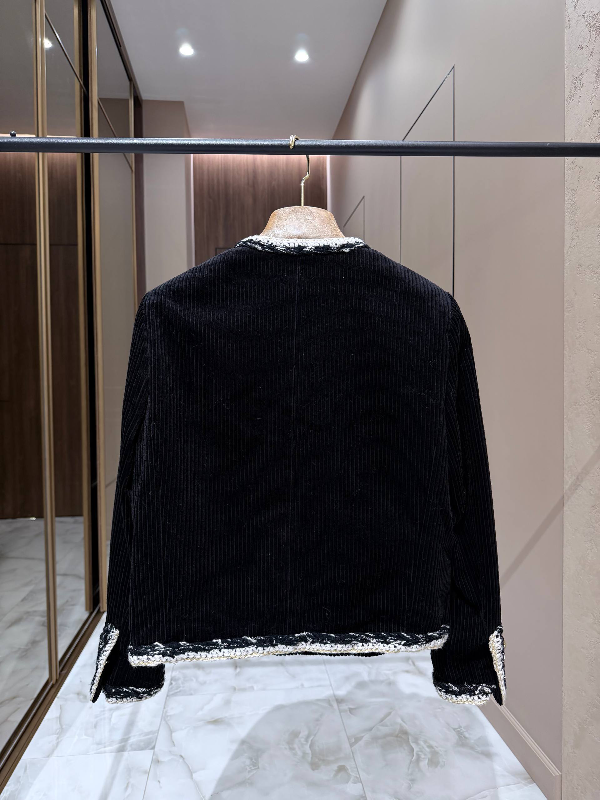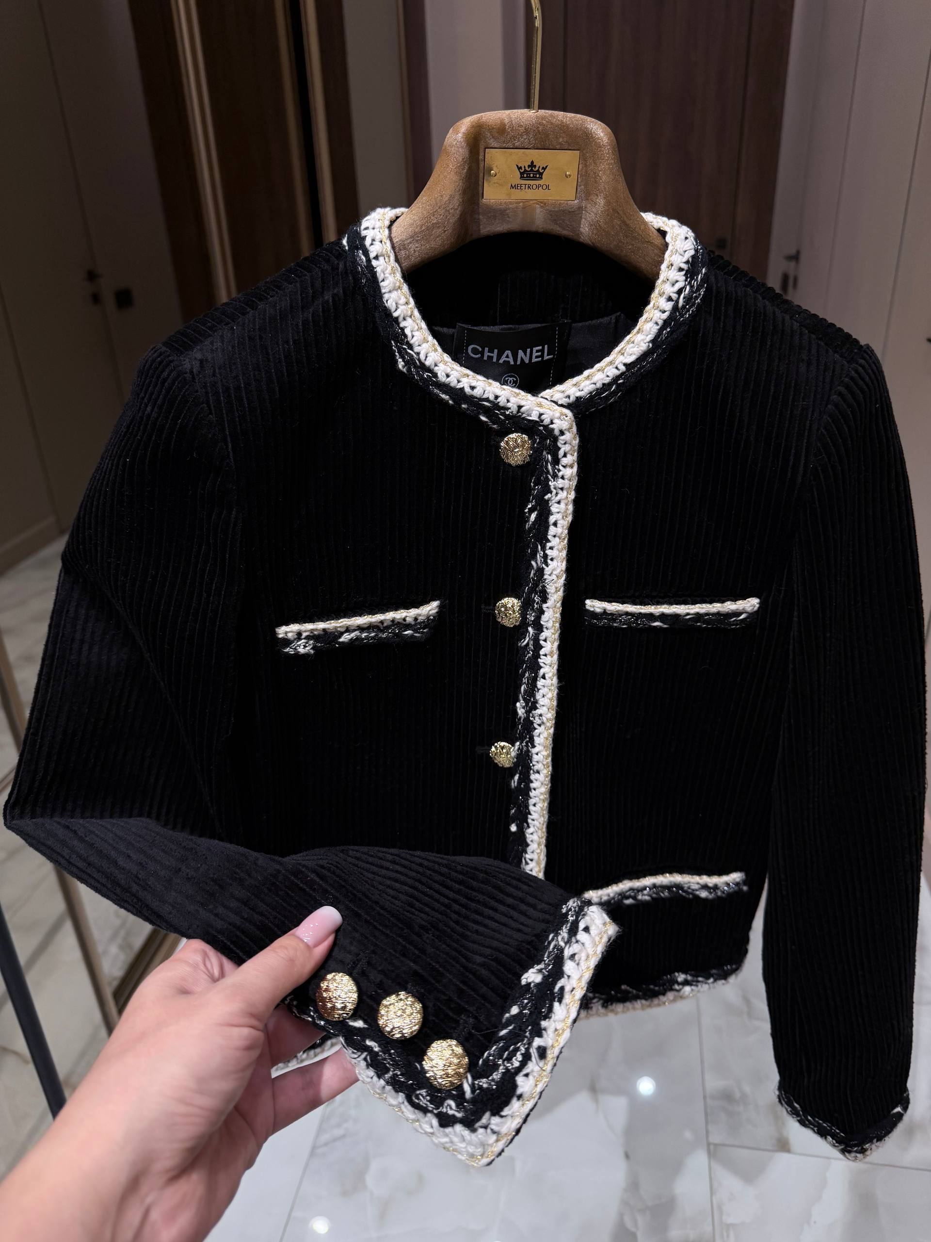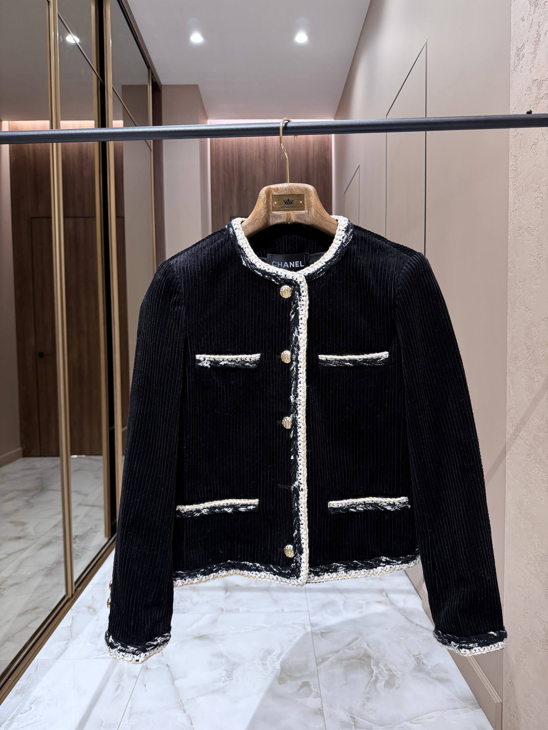 Жакет сочетает в себе строгую лаконичность и тонкую декоративность: корпус из плотного вельвета с выраженной рубчиковой фактурой подчёркивает структуру изделия и придаёт образу глубину. Круглый вырез‑воротник без лацканов создаёт чистую линию декольте, а контрастная тесьма с фактурным переплетением (белые и чёрные нити с металлизированными акцентами) аккуратно обрамляет горловину, фронтальную планку, карманы и нижний край. Четыре декоративных кармана на передней части — функциональные по форме, декоративные по назначению — добавляют визуального баланса. Золотистые пуговицы с фирменным рельефом создают благородный акцент и завершают общий образ.