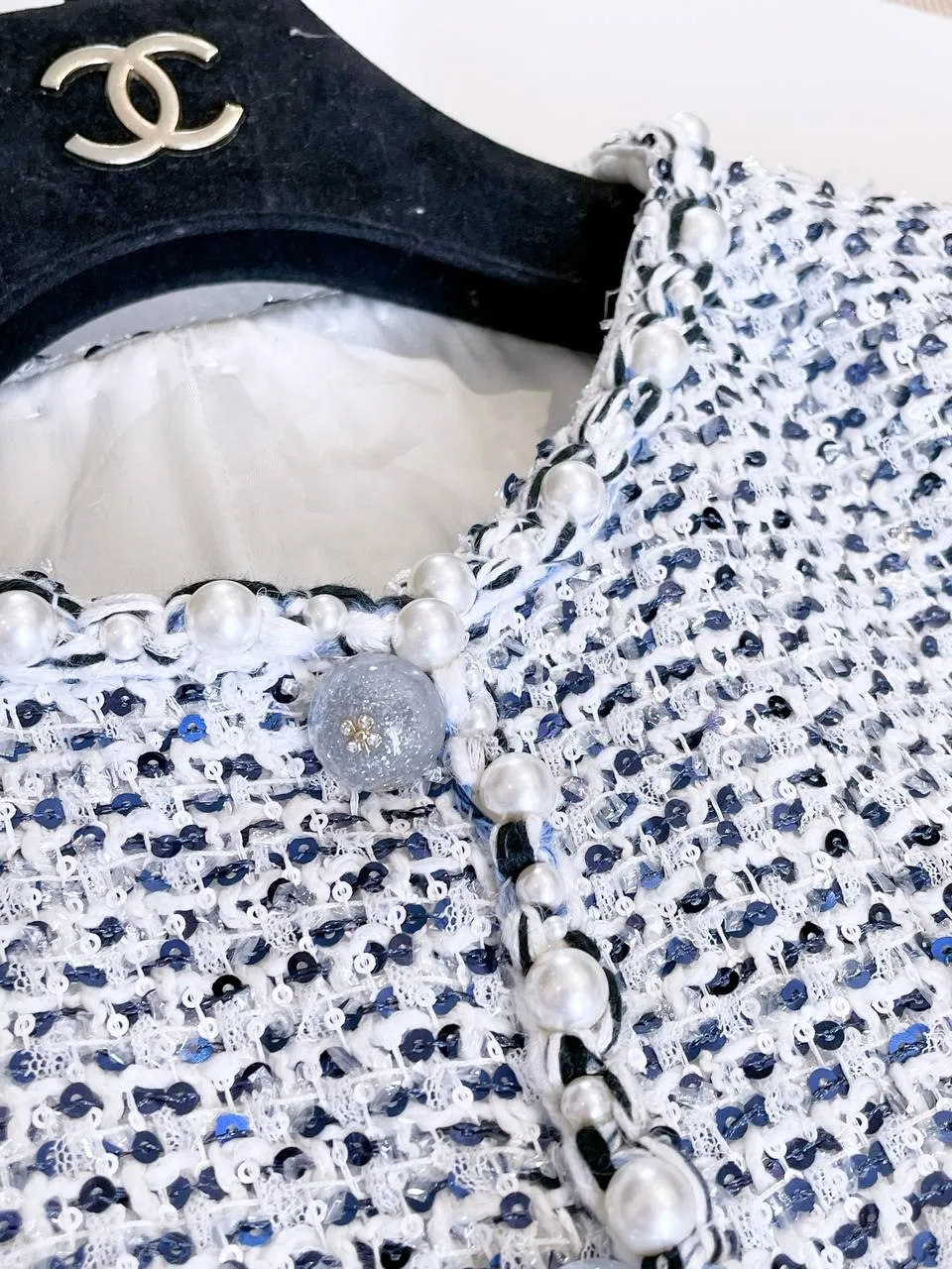 Окунитесь в атмосферу весенней свежести с этим восхитительным светло-голубым твидовым пиджаком. Нежнейшее переплетение нитей небесно-голубого, жемчужно-белого и искрящегося серебристого цвета создают неповторимую текстуру, деликатно мерцающую на солнце. Блестящие пайетки, вплетенные в ткань, добавляют игривости, а роскошная отделка по краям, украшенная россыпью жемчужин разных размеров, придает пиджаку изысканный шарм. Идеальное дополнение к вашему весенне-летнему гардеробу, этот пиджак станет воплощением нежности и элегантности.