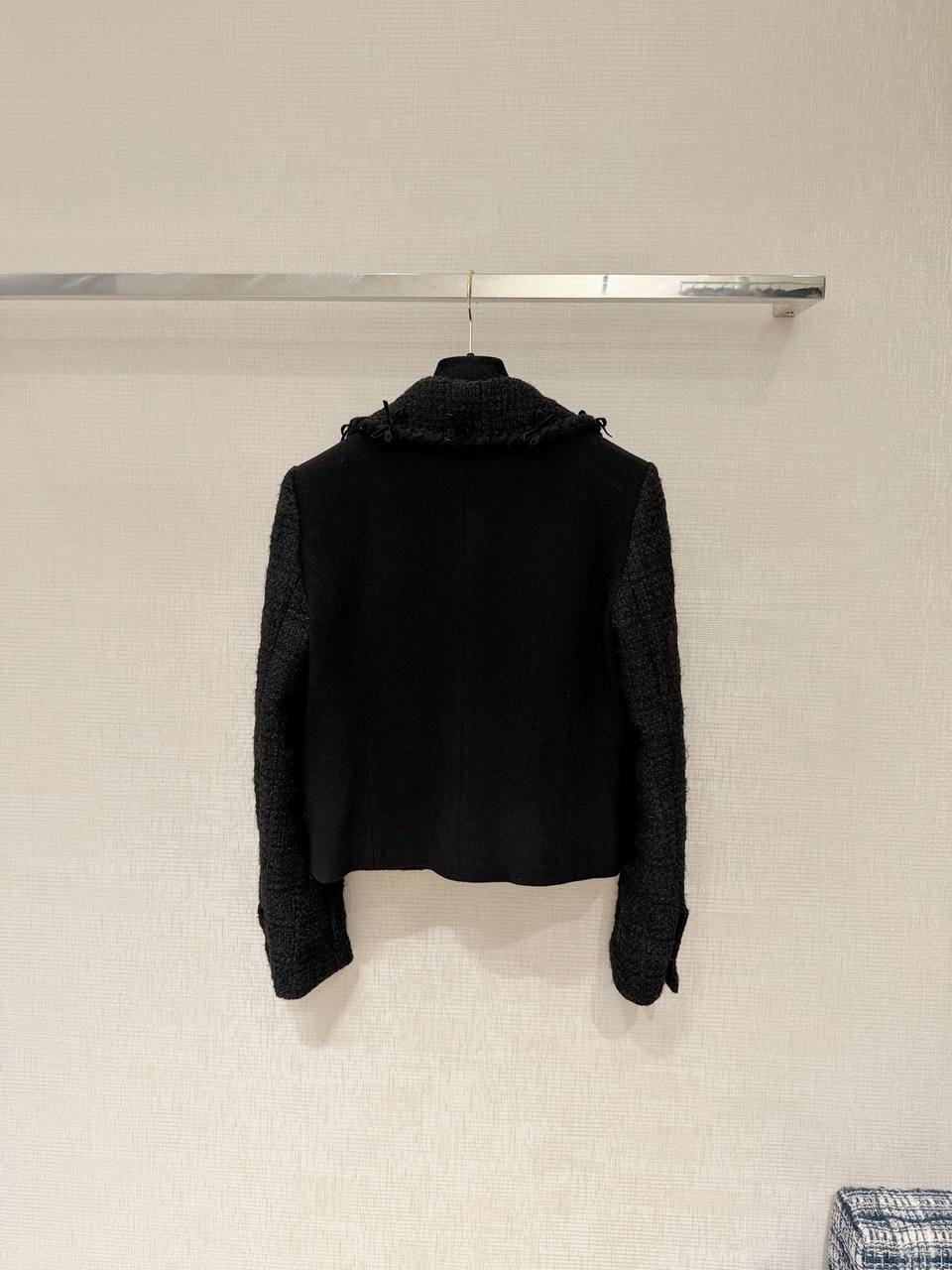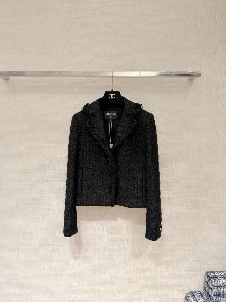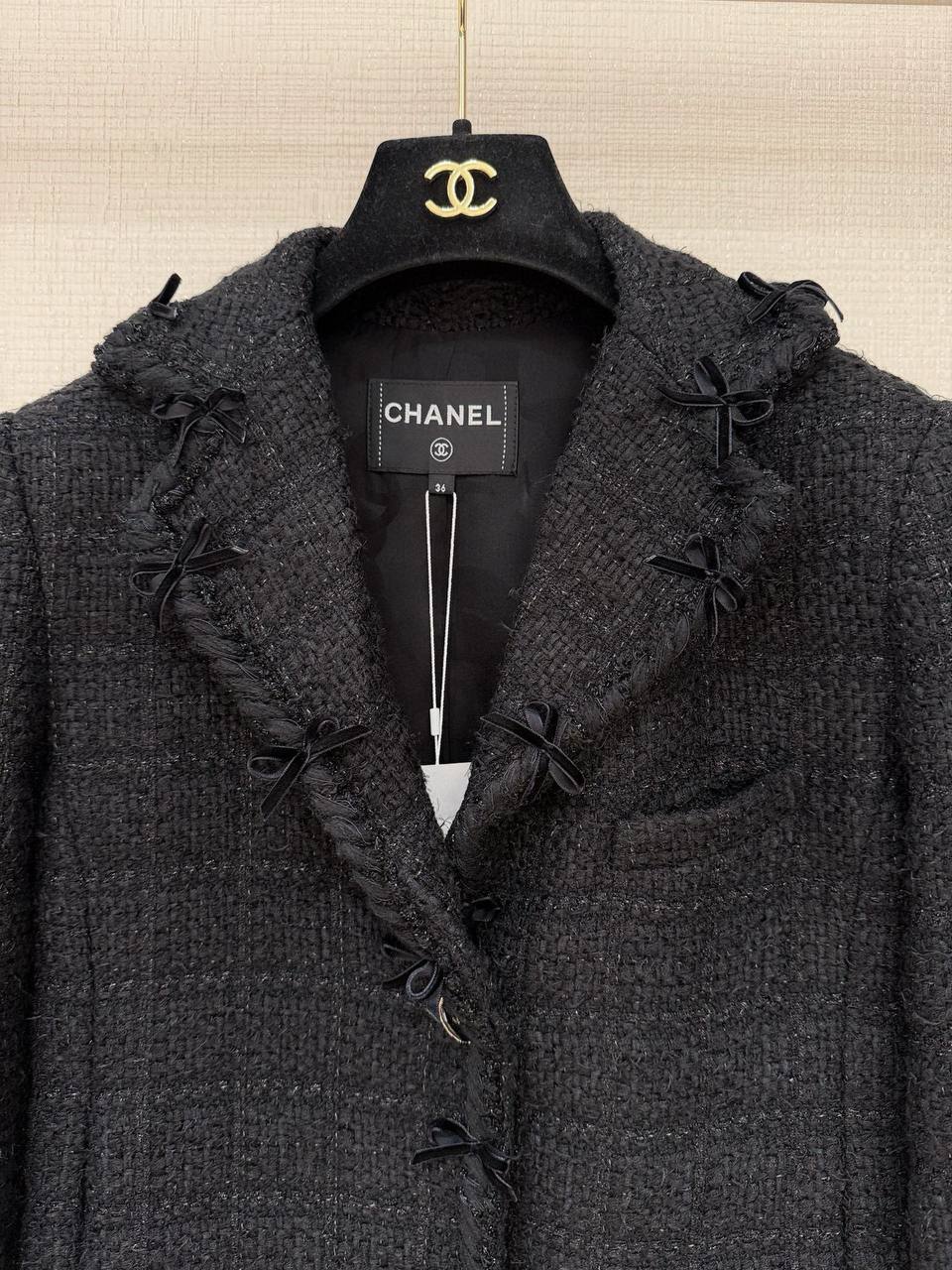 Изысканный женский жакет от CHANEL — воплощение элегантности и фирменного стиля Дома, вдохновленного наследием Коко Шанель. Изготовленный из премиального черного твида с тонкой клетчатой текстурой, он сочетает в себе классическую структуру и утонченные детали, подчеркивающие женственность и уверенность.