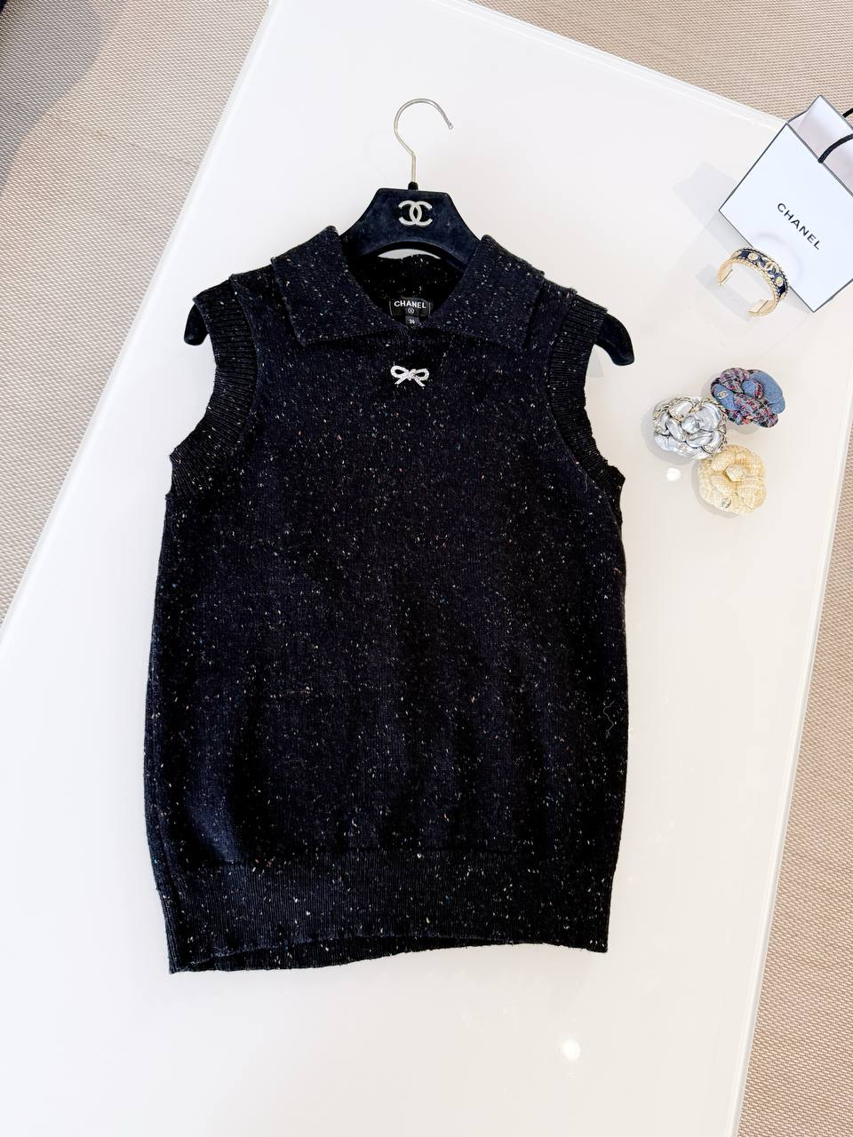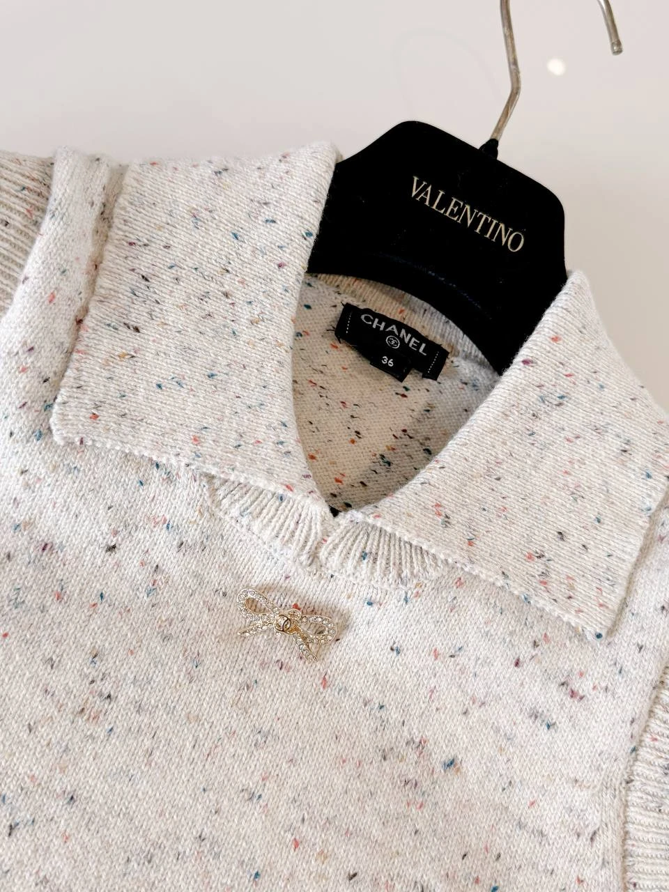 Изысканный безрукавный жакет CHANEL из мягкого кашемира — утончённая вещь для создания элегантных многослойных образов. Минималистичный силуэт дополнен маленьким отложным воротником и деликатной декоративной брошь‑бантом, что придаёт модели женственность и шарм.