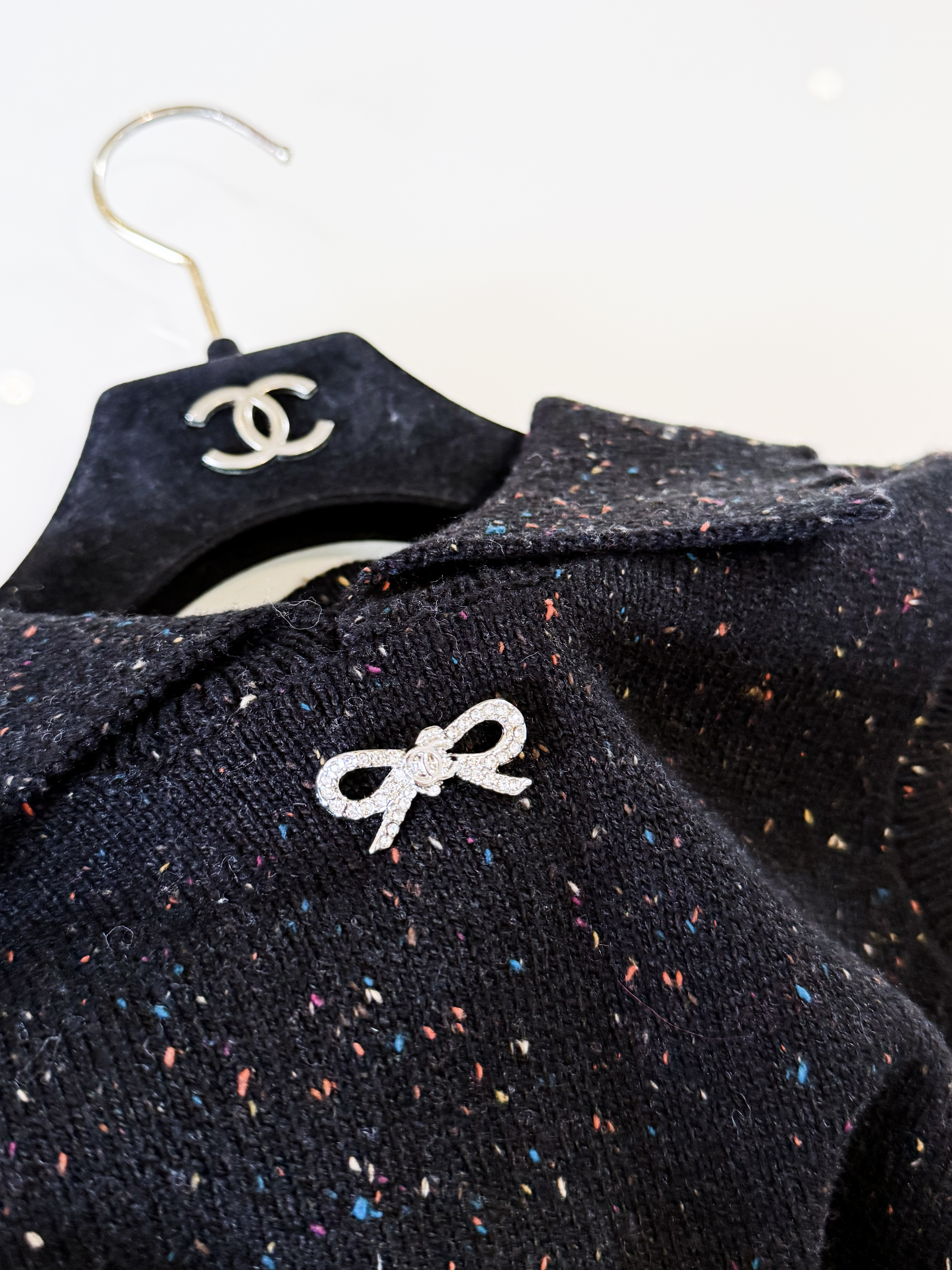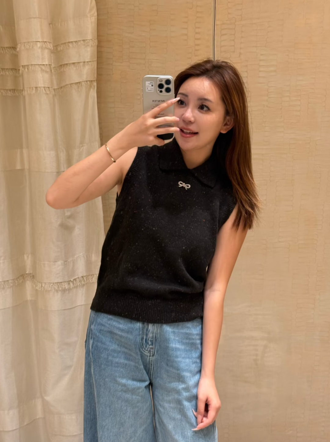 • Отделка: аккуратный резиночный кант по низу и проймам; тонкая фактурная вязка по краям. Маленькая брошь в виде бантика с кристаллами/металлическими акцентами расположена по центру груди — утончённый декоративный штрих.