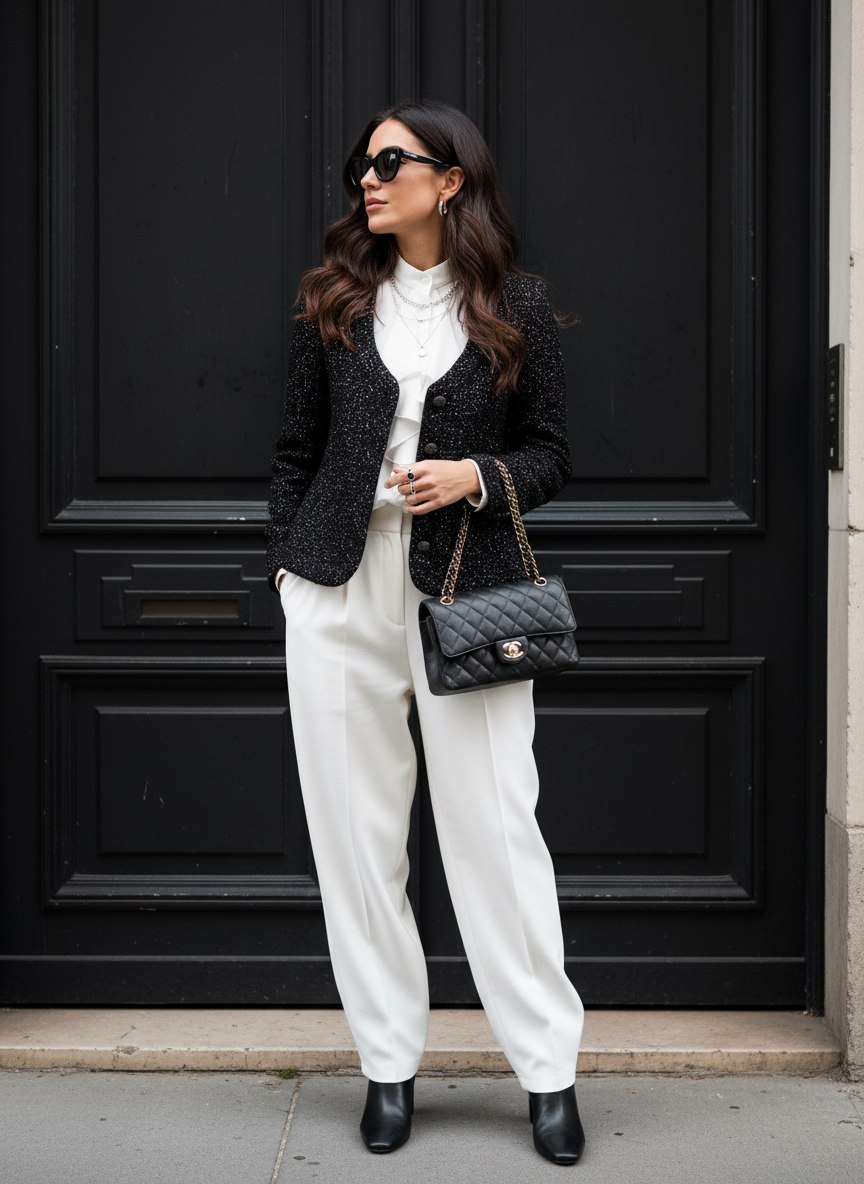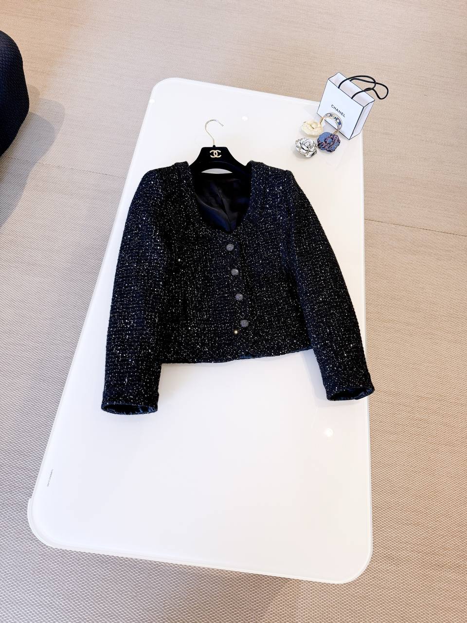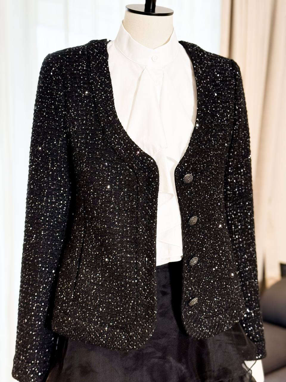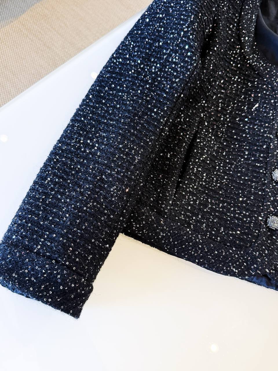 Элегантный женский жакет CHANEL из плотного шерстяного твида с деликатным блеском — идеальный баланс классики и современного шика. Модель отличается приталенным силуэтом и округлым вырезом, подчёркивающим линию декольте, и заканчивается чуть выше линии бёдер. Ткань украшена тонкими блестящими включениями (люрекс/пайетки), которые придают жакету лёгкое мерцание и делают его уместным как для дневных, так и для вечерних образов.