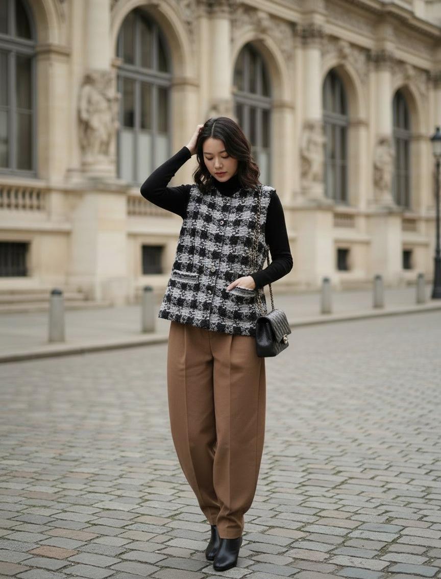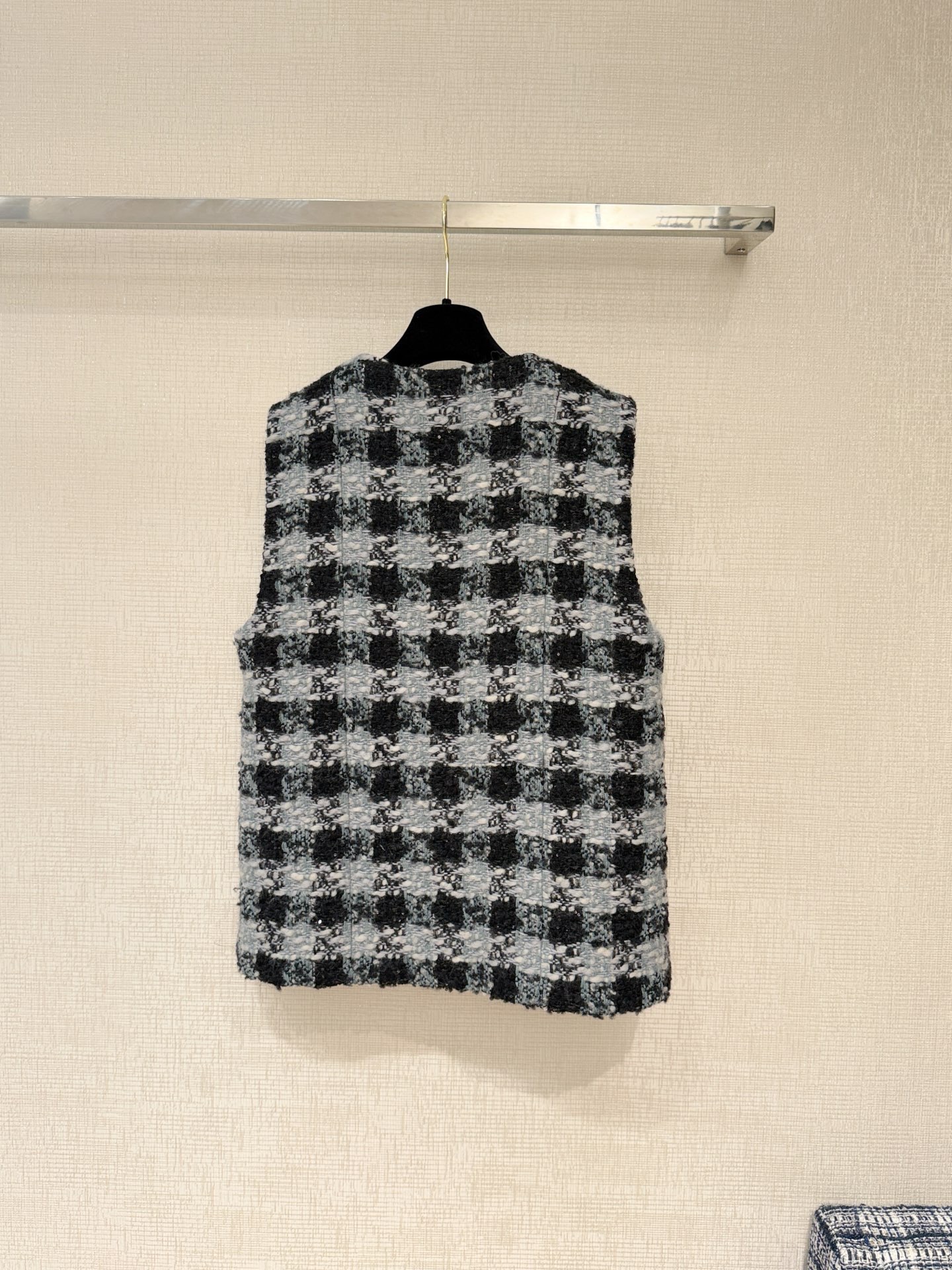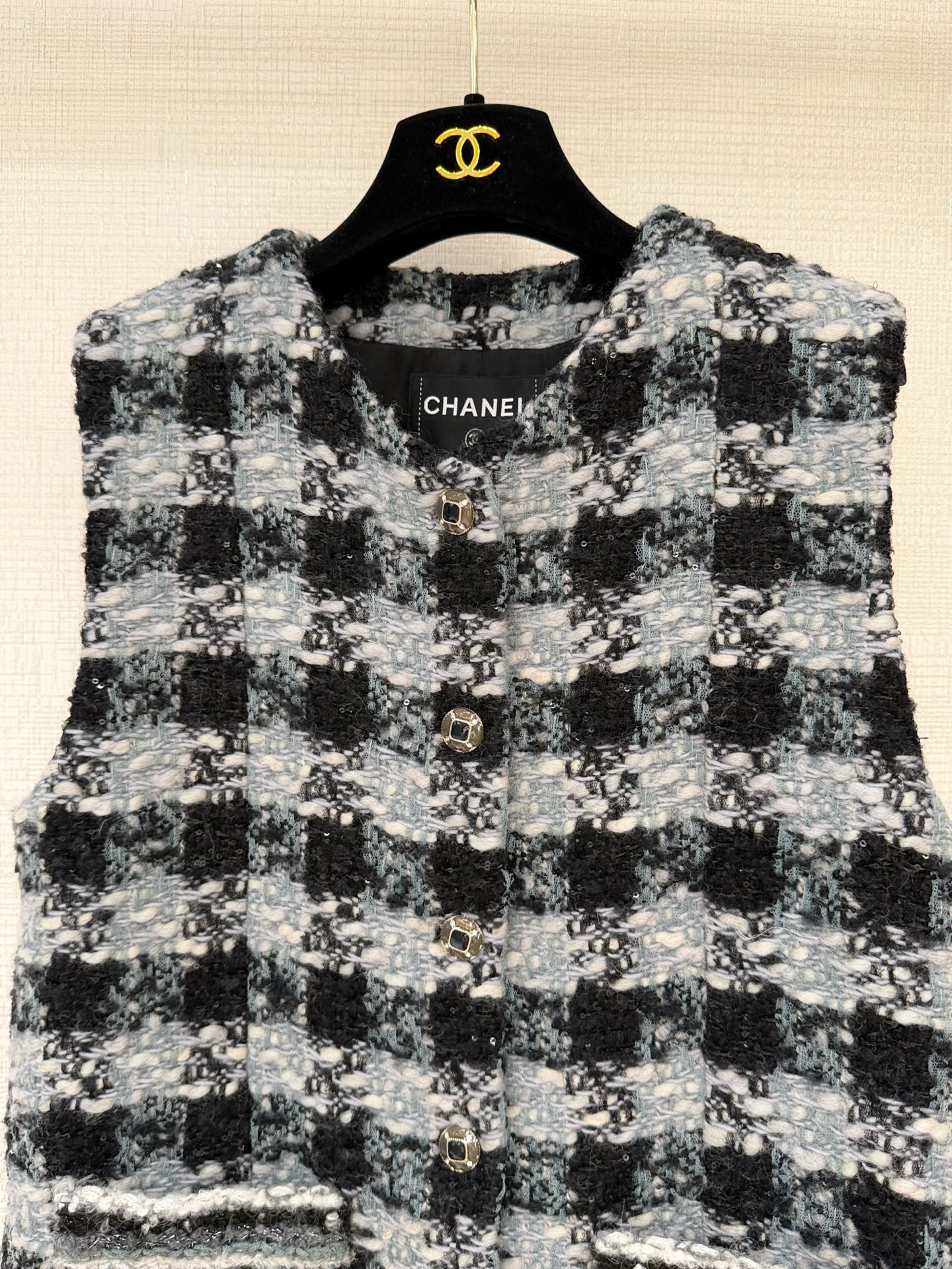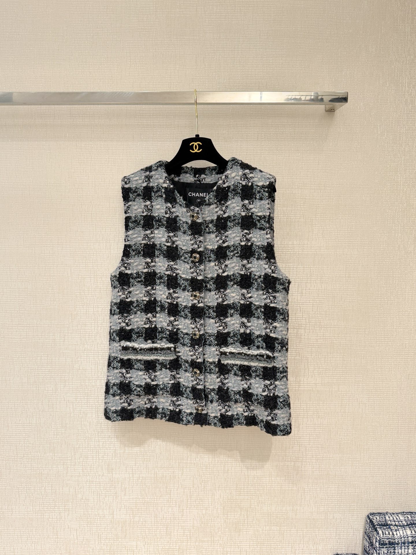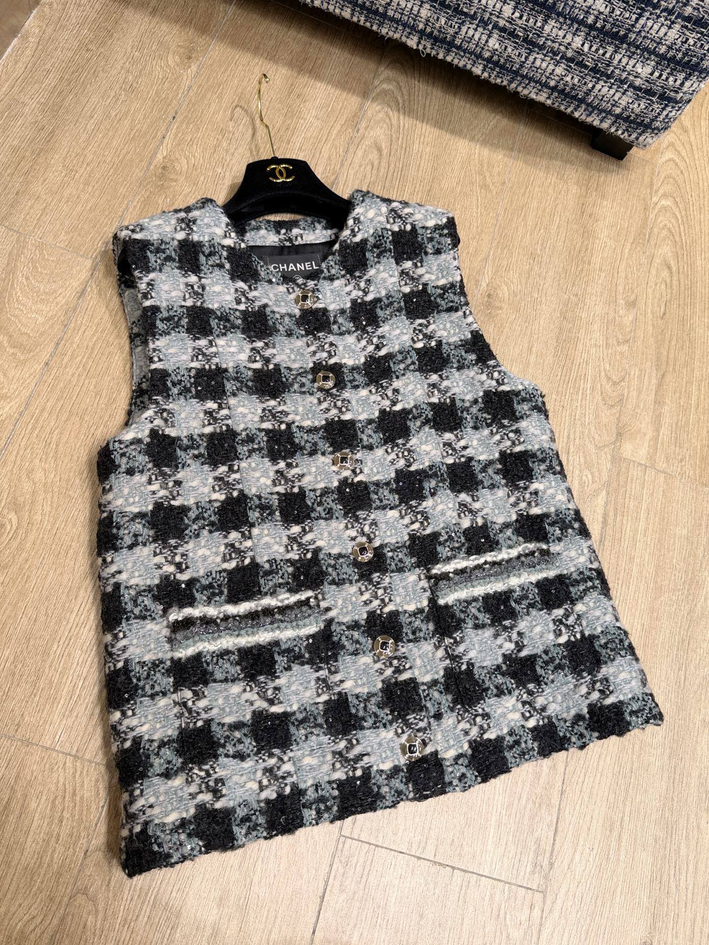 Элегантный жилет CHANEL из насыщенного букле-твида — современная интерпретация классического силуэта бренда. Безрукавный, с круглым вырезом и застежкой на пуговицы, он идеально подходит для многослойных образов и добавляет утончённой текстуры как к повседневному, так и к более формальному гардеробу. Предлагается в двух цветовых вариантах: графично-чёрно‑белый и насыщенный фуксия с золотистыми акцентами.