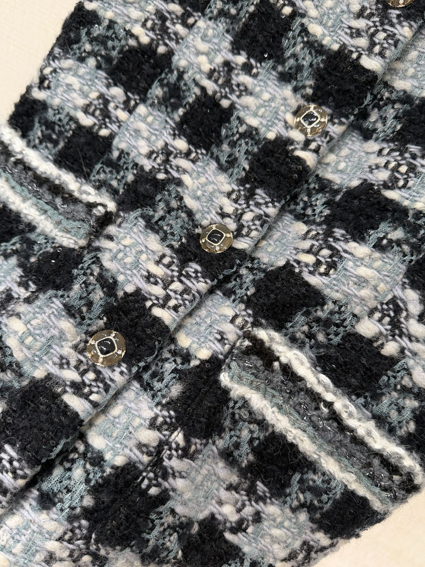 • Ткань: объёмный букле-твид с выраженной фактурой и чековым рисунком; в варианте фуксия присутствуют золотистые и кремовые нити, придающие блеск и глубину цвету.