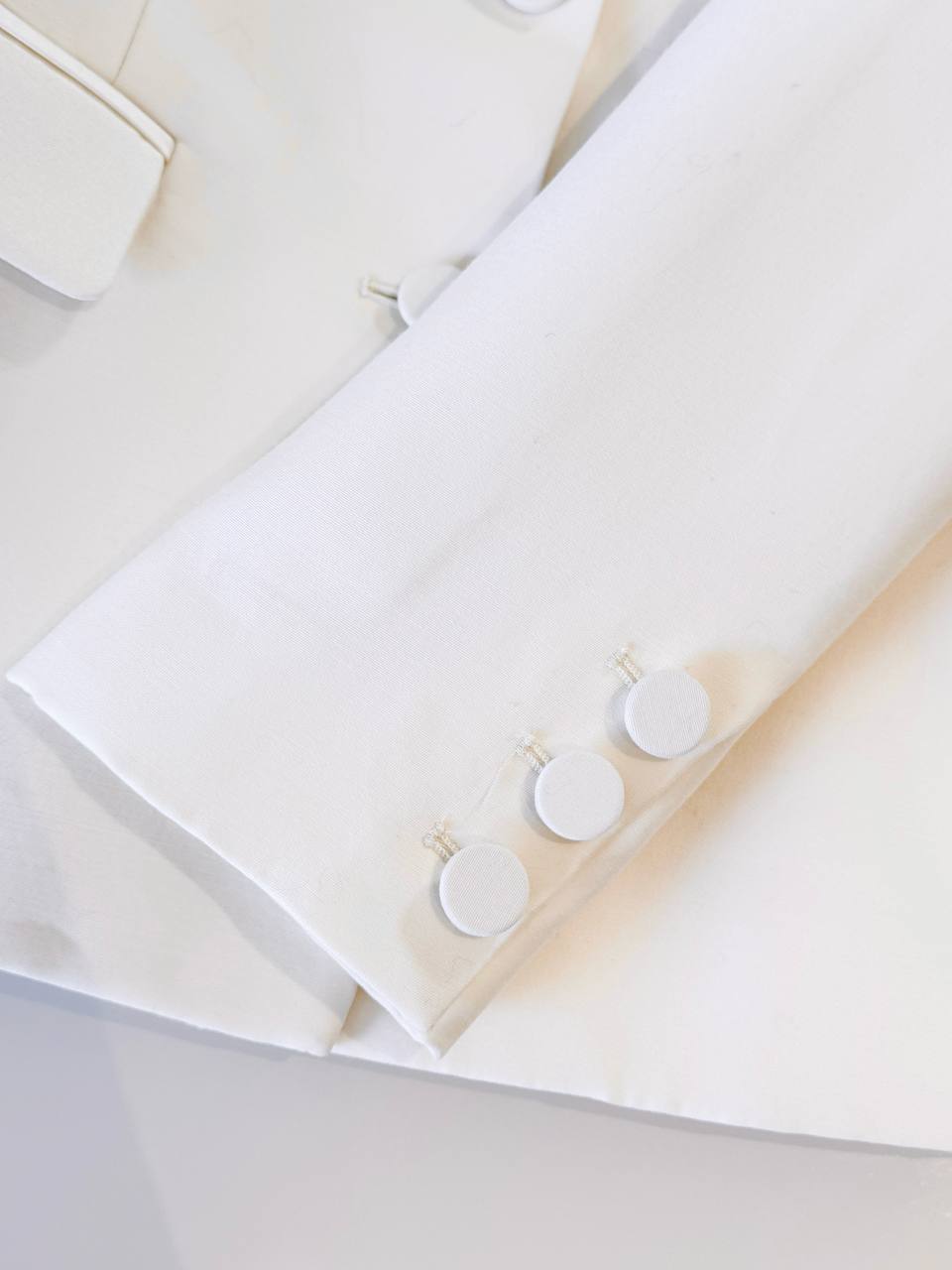 • Воротник и лацканы: классический, аккуратно скроенный воротник с чёткими лацканами; аккуратная линия горловины создаёт лифтинг-эффект.