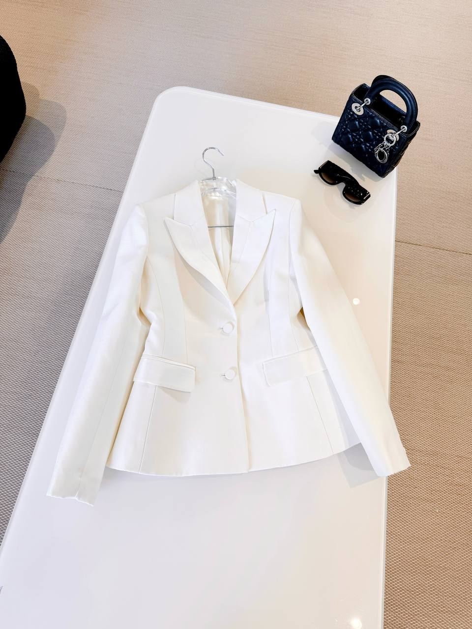 • Фасон: приталенный пиджак, подчёркнутая талия за счёт вертикальных вытачек и рельефных швов, лёгкое расширение к низу — элегантный женственный силуэт.